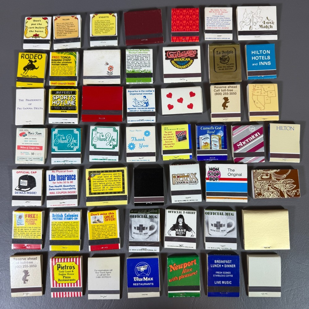 VTG Lot of 50 Matchbooks Collectible Advertisements Joe Camel 80s *Most Unstruck Condition varies on each individual matchbox. 90-95% are unused and unstruck. The other 5-10% that have been struck its only 1 or 2 matches. None of the books are empty. This sale is for the exact items you see in the photo. There maybe a couple duplicates in this lot. I will be listing more Vintage Collectible Unstruck Matchbooks over the next day or so. • P lease see all pictures for details on condition. • Pictures are part of the description. • You will receive the exact items you see in the photos, no original packaging included. • Please ask any questions you have. • We offer combined shipping for multiple orders. • Ships quickly Monday-Friday with USPS