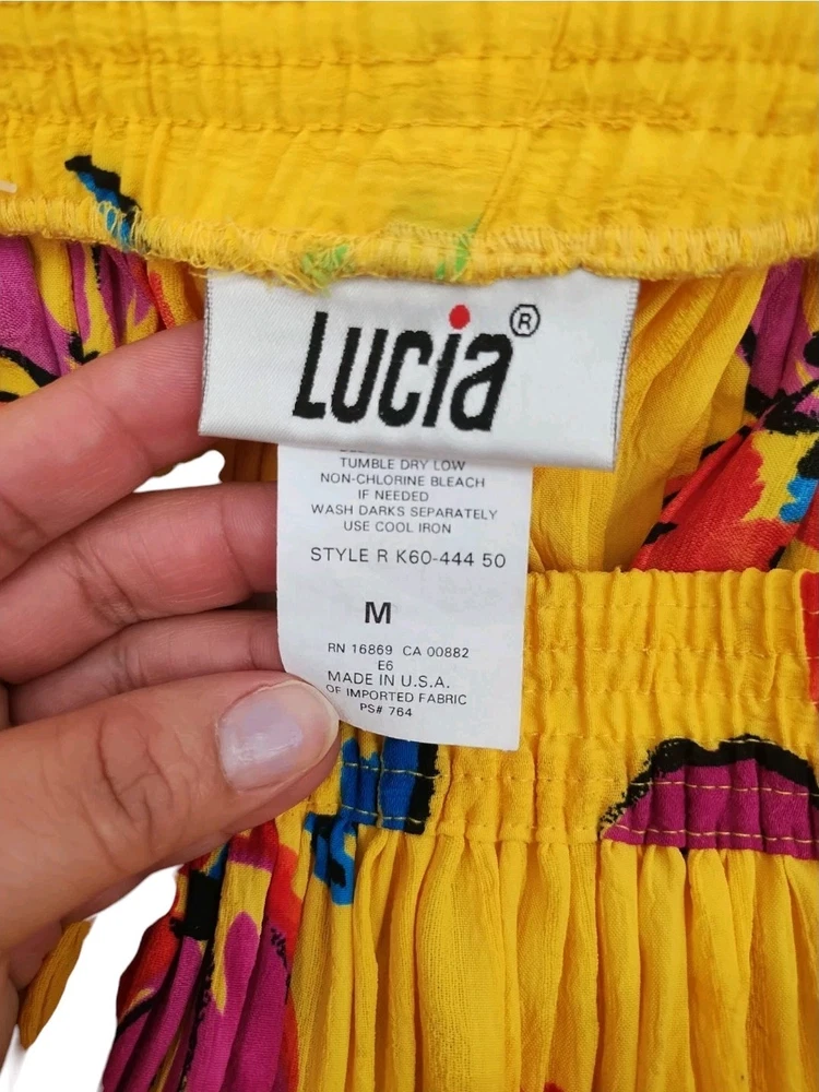 Vintage Retro 80' 90' Lucia Women skirt Elastic Waist pleated stretch Hawaiian Vacation Tropical Yellow Summer Floral Size Medium Preowned Excellent condition