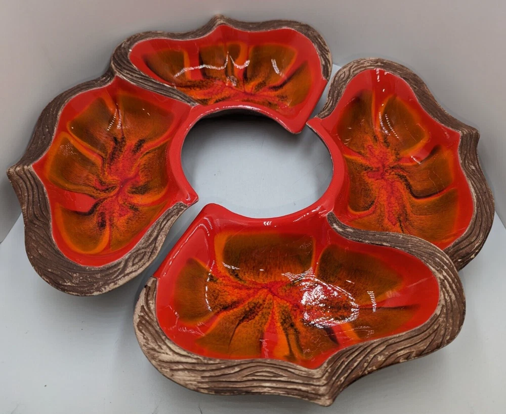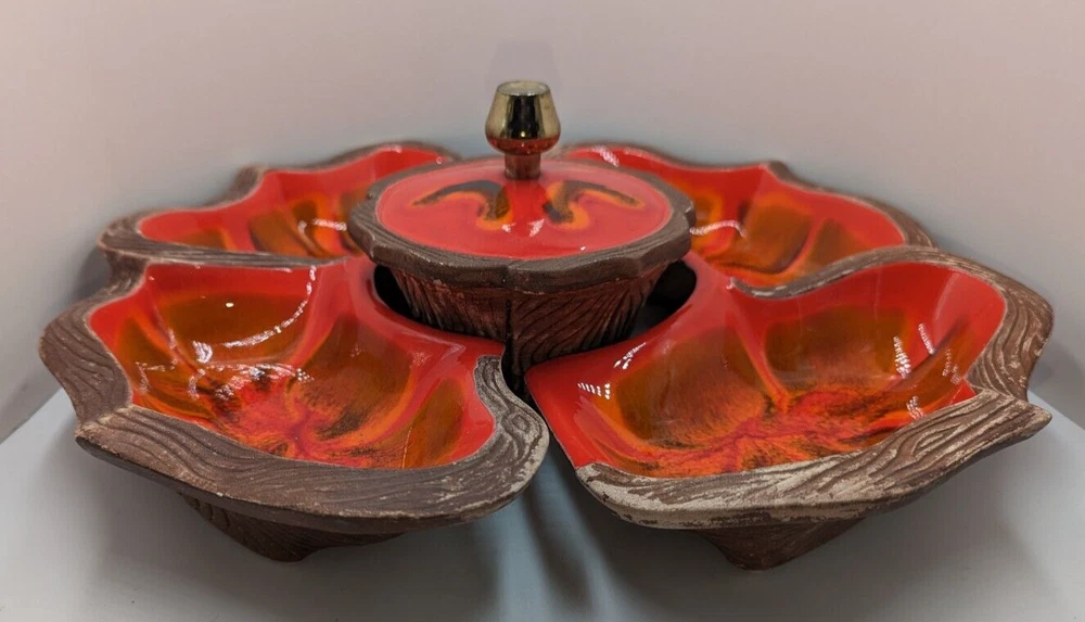 VTG MCM California Pottery Sequoia Ware 4 Pc Chip & Dip Condiment Tray 12" READ. There are no chips or cracks. There are however, some paint chips and paint wear on the outside of the pieces. Please see the photos for a more accurate description. The inside glaze of the pieces is in excellent shape with no scratches or wear that I can see. All of my items are carefully packed for shipping, no matter their value - $5 items are wrapped with the same care as a $200 item. My goal is to have your purchase arrive safely. I use recycled packaging when possible but mostly use new, high-quality products so your item will arrive intact without damage. Large, heavy and fragile items are harder to use combined shipping with but just ask if you would like to purchase more than one item and I am more than happy to do so if feasible. If not, maybe we can work out a shipping discount. Measurements are approximate or as close as I can get. Also, the color you see many not be the exact color depending on your computer or phone settings. I do my best to make sure that the colors look as accurate as possible on my end. Please note that I offer Priority Mail as well as Ground Advantage on most items. Check the pricing to see which you prefer. Thank you and hopefully you will visit my store again!