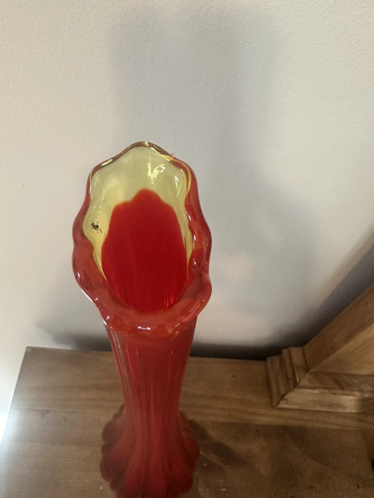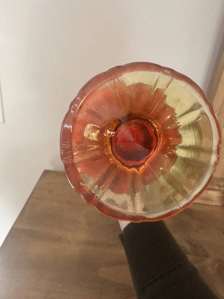 Elevate your home decor with the striking VTG MCM LE Smith 15.5” Amberina Swung Stretch Ribbed Glass Vase. A true representation of Mid-Century Modern style, this vase boasts an eye-catching amberina color that ranges from warm red to vibrant orange, capturing the essence of a bygone era. Crafted from hand-blown glass, its textured, high-gloss surface and ribbed pattern add a touch of abstract art to any room. This decorative piece, originating from the United States in 1953, is a testament to the skillful production techniques of the time. It stands as an original, unmodified treasure from the 1960-1969 period, complete with the artistic nuances that enthusiasts of MCM appreciate. Whether displayed alone or as part of a curated collection, this vase is sure to be a conversation starter. No chips or cracks. Has a black mark inside the glass as shown