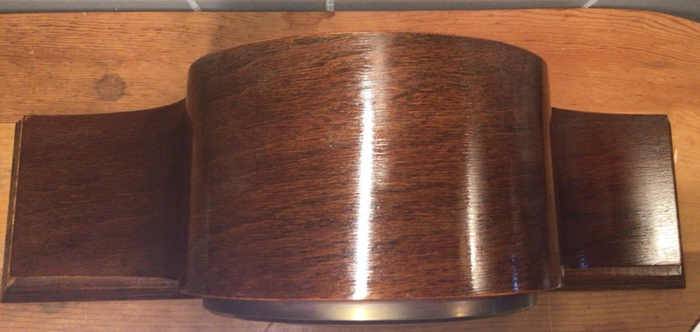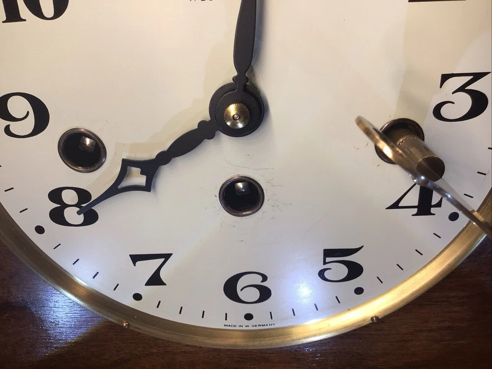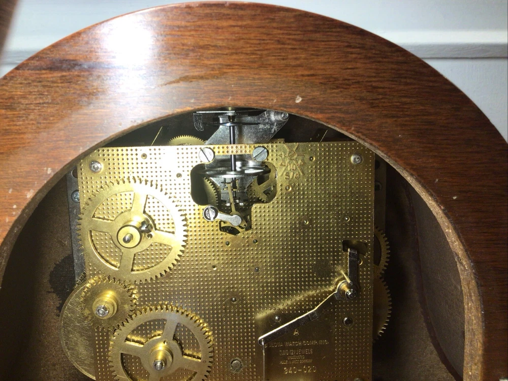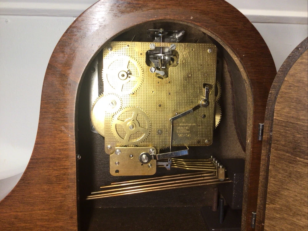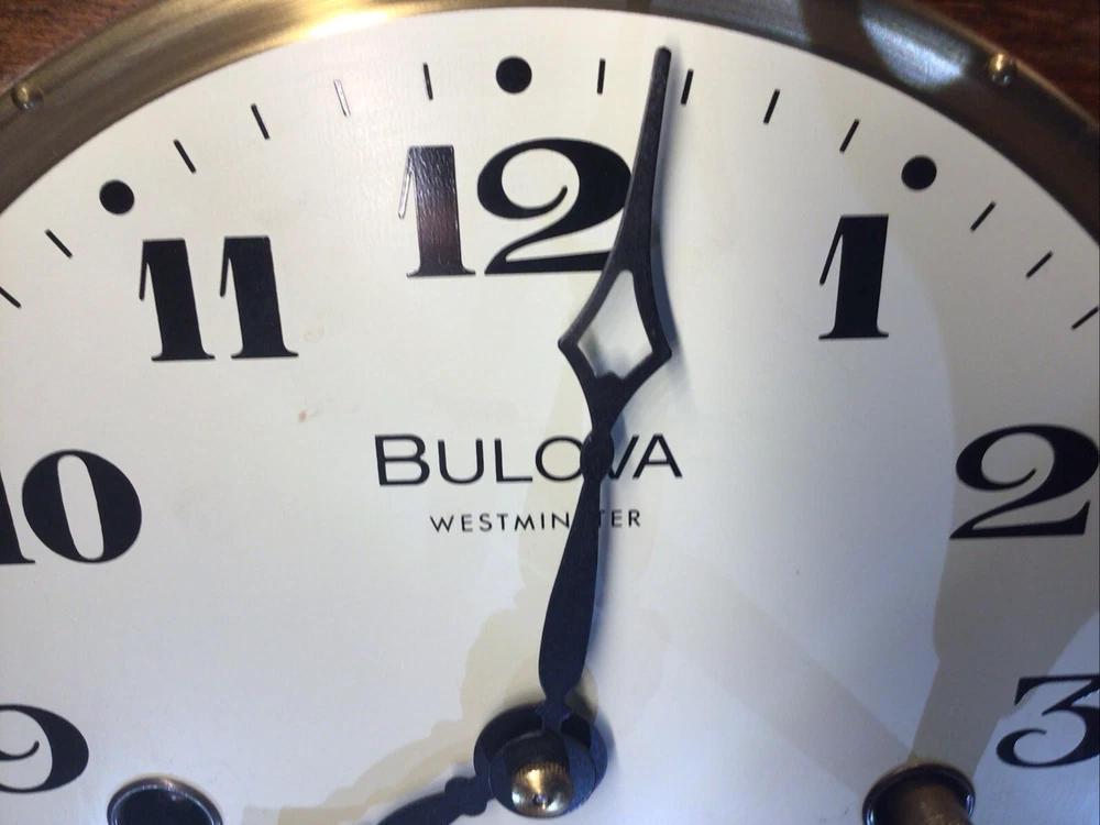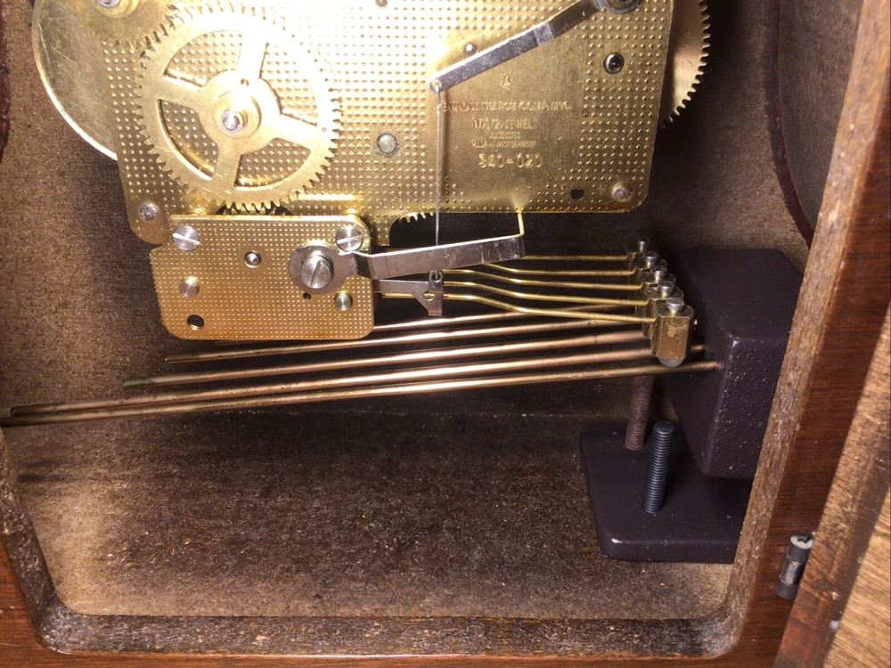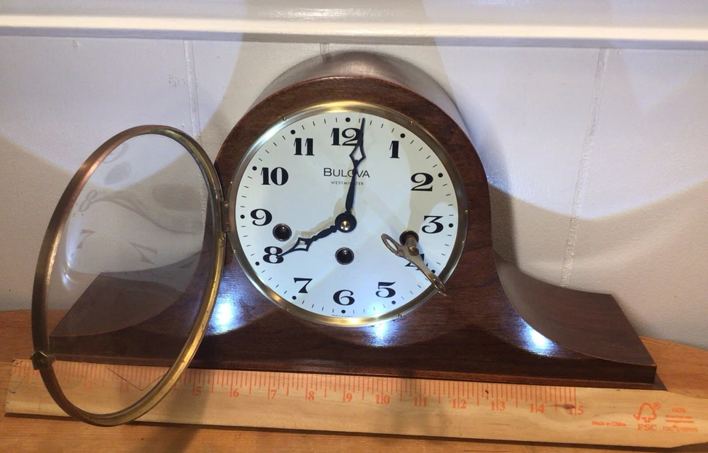 Time Period Manufactured: 1950-1959 Material: Wood, Glass, Brass Color: Brown Signed By: Bulova Watch Comp. Inc. Brand: Bulova Chime Sequence: Westminster Movement: Mechanical Features: Wind Up Item Length: 18” Original/Reproduction: Original Item Height: 9” Display Type: Analog Antique: No Signed: Yes Country/Region of Manufacture: West Germany Era: Mid 20th Century (1941-1969) Room: Any Room Frame Material: Wood Style: Art Deco Power Source: Mechanical Year Manufactured: 1950 Model: 340-020 Type: Desk Clock Item Width: 4.75” Vintage: Yes