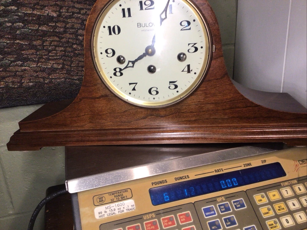 Add a touch of vintage charm to your any room with this beautiful Bulova Westminster Camelback Mantel Clock. This stunning piece is made of wood, brass, and glass, and features a classic analog display type with a brown color. It is a mechanical movement clock with a wind-up feature and a chime sequence of Westminster. The clock is signed by Bulova Watch Comp. Inc. and has a model number of 340-020. It was manufactured in West Germany in the mid-20th century, specifically in 1950. This desk clock is perfect for collectors and enthusiasts alike, with its original and authentic design. Fully operational, tested , accurate time. To be insured for full purchase price.
