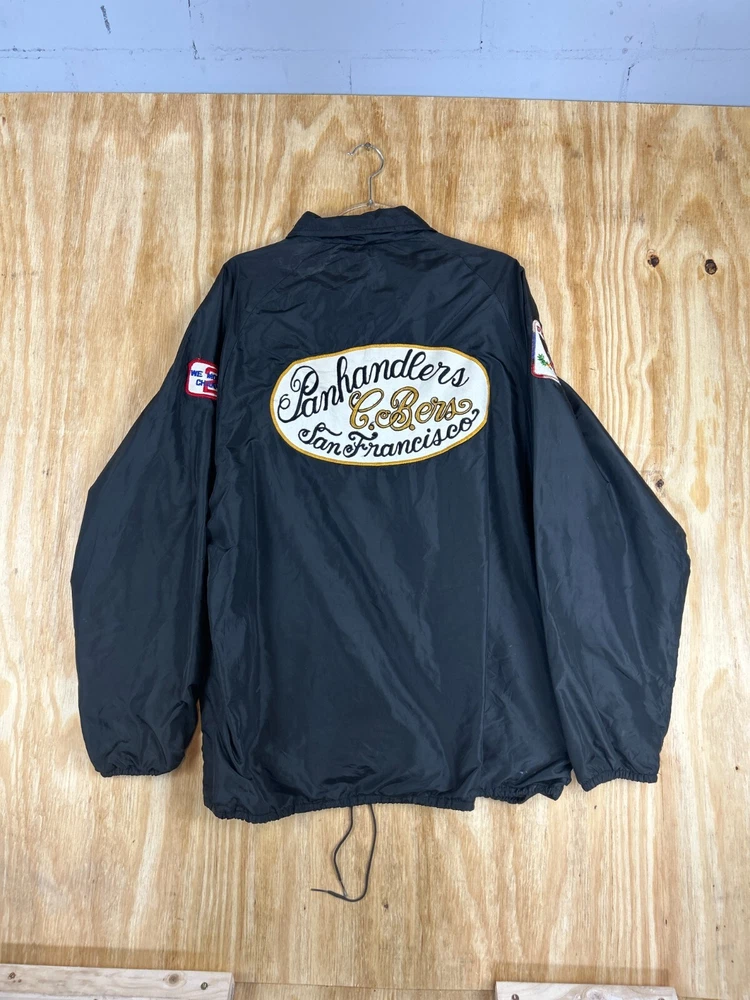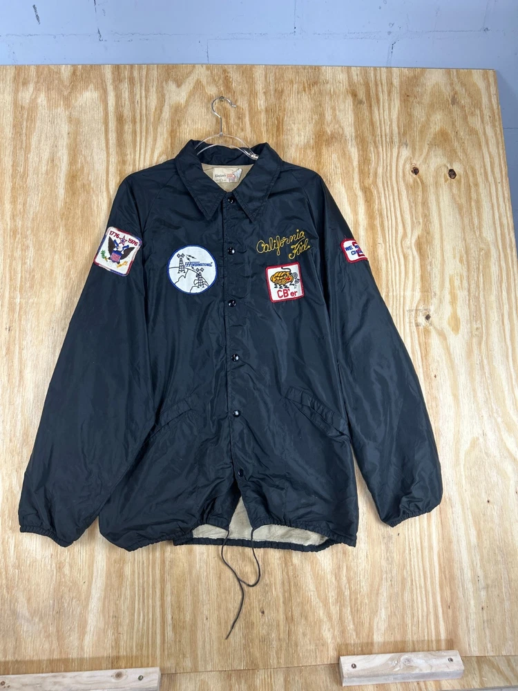 Stay warm and stylish with this vintage King Louie Pro Fit jacket. Made with nylon outer shell material and satin fabric type, this windbreaker features a spread collar, two front pockets, and snap closure. The black jacket is perfect for travel or casual occasions and is adorned with button accents and a patriotic army theme. The midweight jacket is machine washable and has a full zip feature. It is suitable for winter and fall seasons and is ideal for cycling, baseball, hiking, and running and jogging. The jacket has a regular fit and is available in size large. The lining material is nylon, and the insulation material is polyester. This King Louie Pro Fit jacket is a perfect addition to your wardrobe, and it is a must-have for any patriotic occasion. SKU: 150010