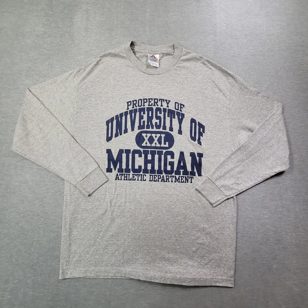 Show your school spirit with this vintage Michigan University T-shirt. The gray, solid shirt features the school's logo and name spelled out in bold letters. The long-sleeved shirt is made of a comfortable blend of polyester and cotton, ensuring that you stay cool and comfortable all day long. The regular-fit shirt is designed for men and is available in size XL. The crew neckline and classic design make it perfect for wearing to games or around town. This T-shirt is a must-have for any college fan and is sure to make a statement.