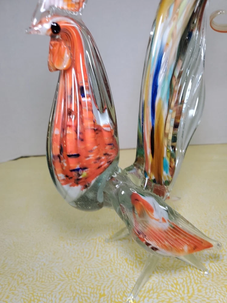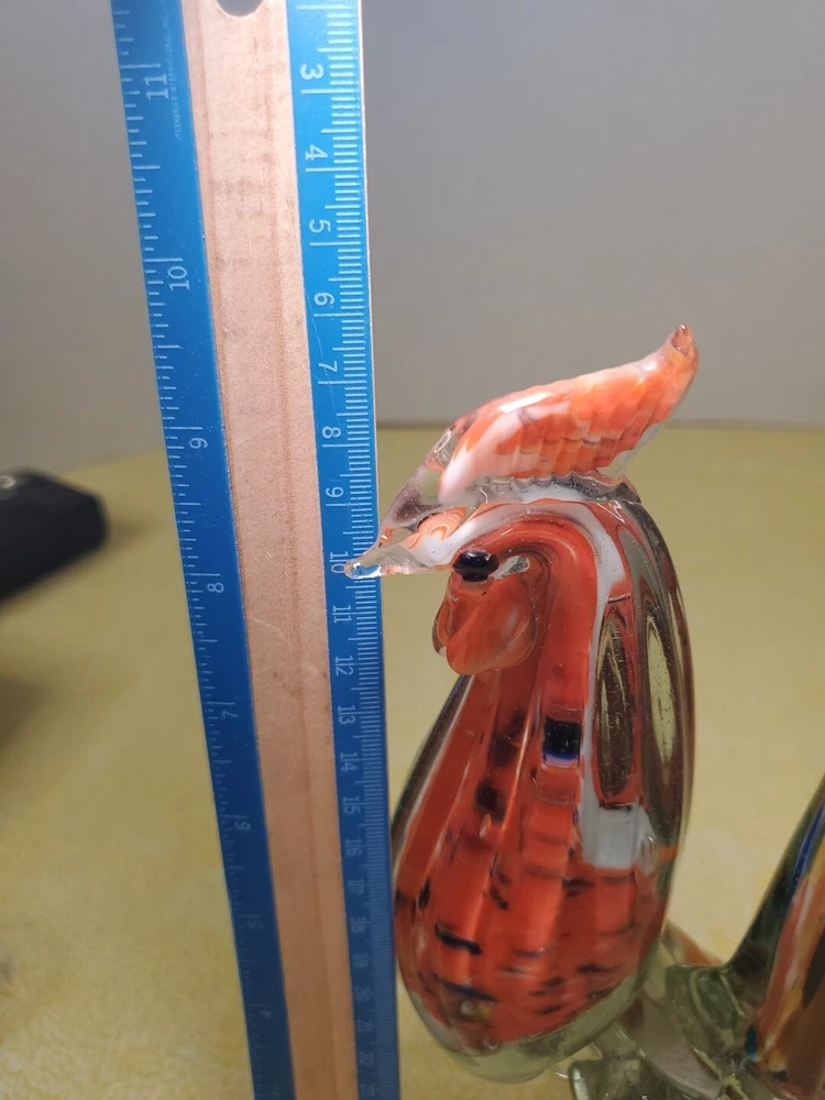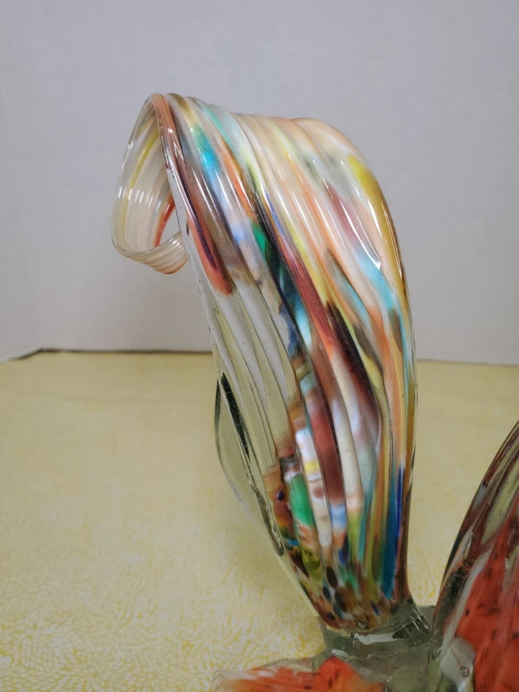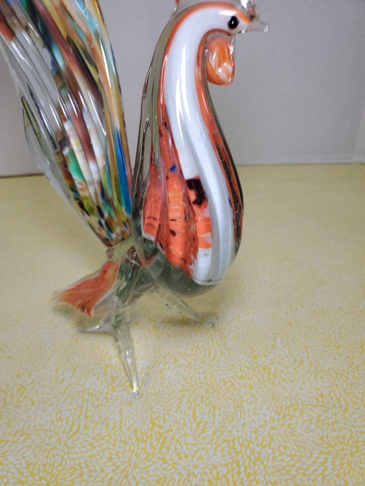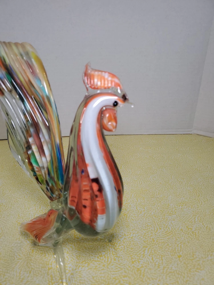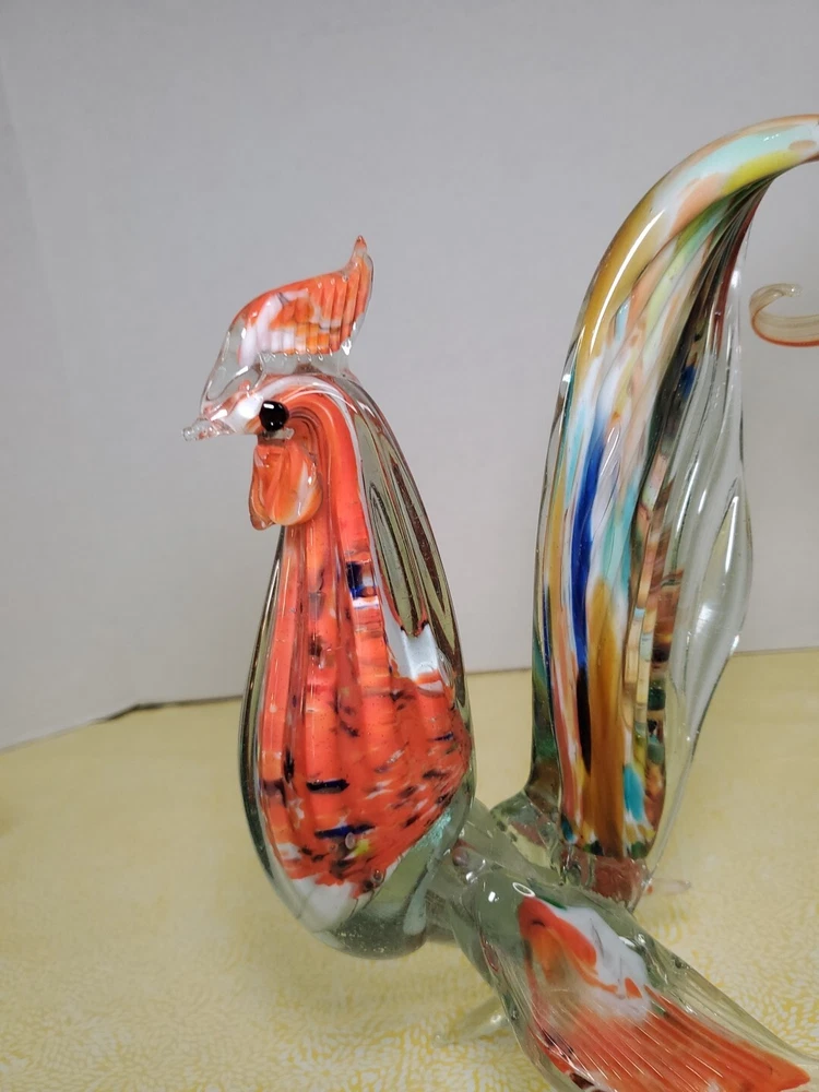 THANK YOU FOR VISITING OUR STORE. WE SHIP 6 DAYS A WEEK (UNLESS THERE IS A FEDERAL HOLIDAY). MOST ITEMS WILL SHIP IN A STURDY BOX AS NEEDED. PLEASE FEEL FREE TO REACH OUT IF YOU HAVE ANY QUESTIONS. WE WILL COMBINE SHIPPING WHEN AVAILABLE. This vintage Murano glass figurine depicts a rooster cockerel in all its glory. Handmade in Italy in the 1960s, this piece is a true work of art. The glass is blown in a swirl pattern, creating a unique and eye-catching design. The figurine is related to the Venetian art glass tradition, with influences from Rococo Baroque and Florentine Murano glass. The piece is perfect for collectors and lovers of vintage art glass. It does not require any additional parts and is ready to display. The colorful abstract design is sure to add a touch of elegance to any room. This Murano glass rooster cockerel figurine is a must-have for anyone who appreciates the beauty and artistry of handmade glass.