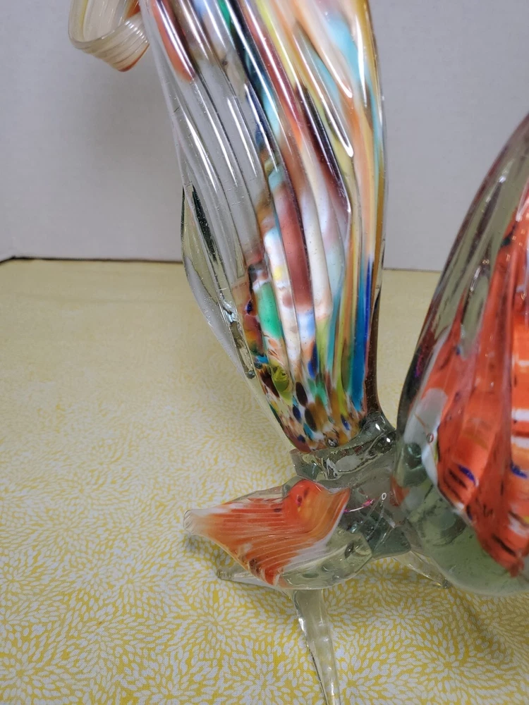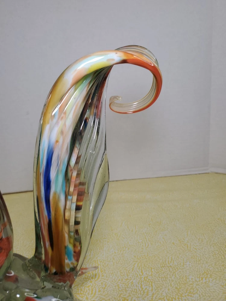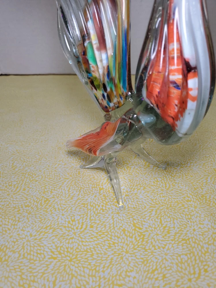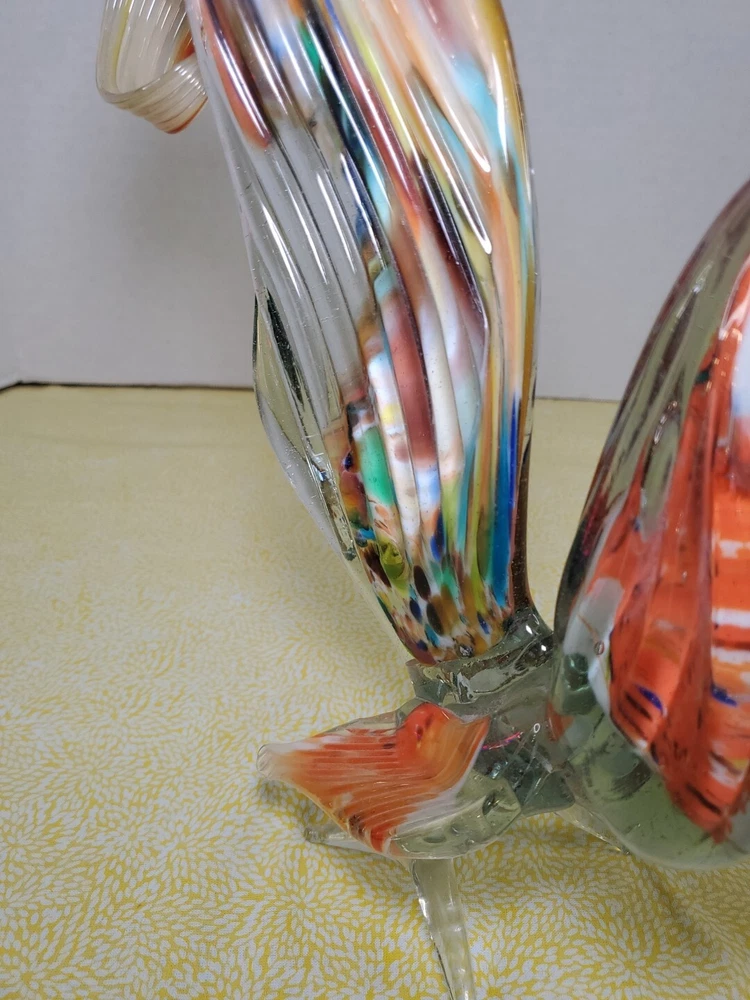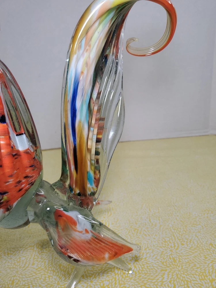 THANK YOU FOR VISITING OUR STORE. WE SHIP 6 DAYS A WEEK (UNLESS THERE IS A FEDERAL HOLIDAY). MOST ITEMS WILL SHIP IN A STURDY BOX AS NEEDED. PLEASE FEEL FREE TO REACH OUT IF YOU HAVE ANY QUESTIONS. WE WILL COMBINE SHIPPING WHEN AVAILABLE. This vintage Murano glass figurine depicts a rooster cockerel in all its glory. Handmade in Italy in the 1960s, this piece is a true work of art. The glass is blown in a swirl pattern, creating a unique and eye-catching design. The figurine is related to the Venetian art glass tradition, with influences from Rococo Baroque and Florentine Murano glass. The piece is perfect for collectors and lovers of vintage art glass. It does not require any additional parts and is ready to display. The colorful abstract design is sure to add a touch of elegance to any room. This Murano glass rooster cockerel figurine is a must-have for anyone who appreciates the beauty and artistry of handmade glass.