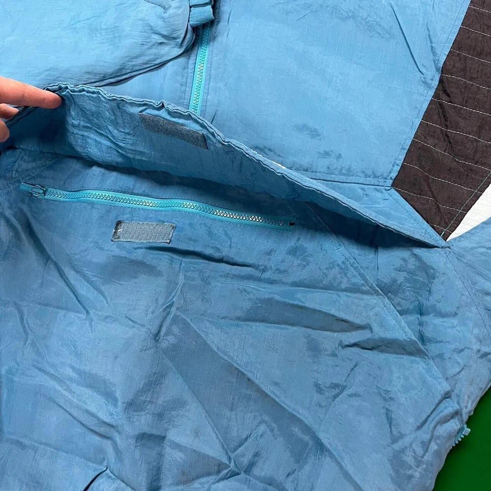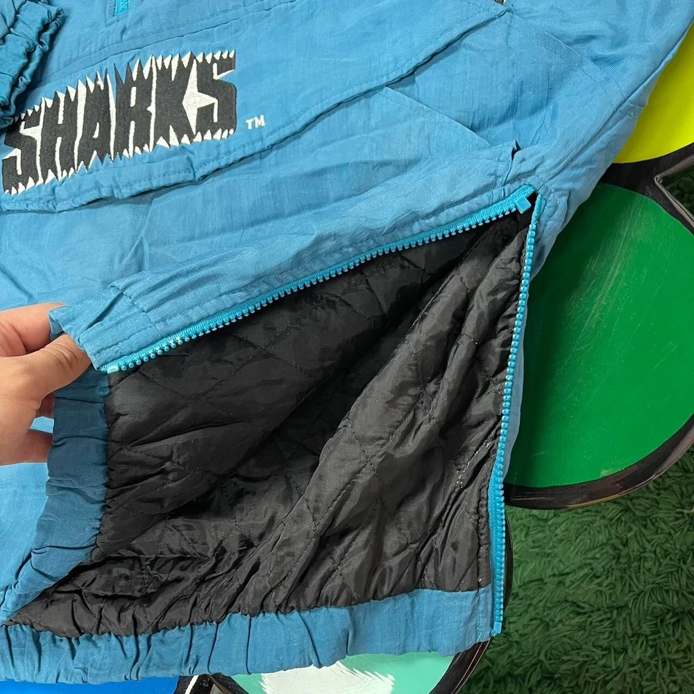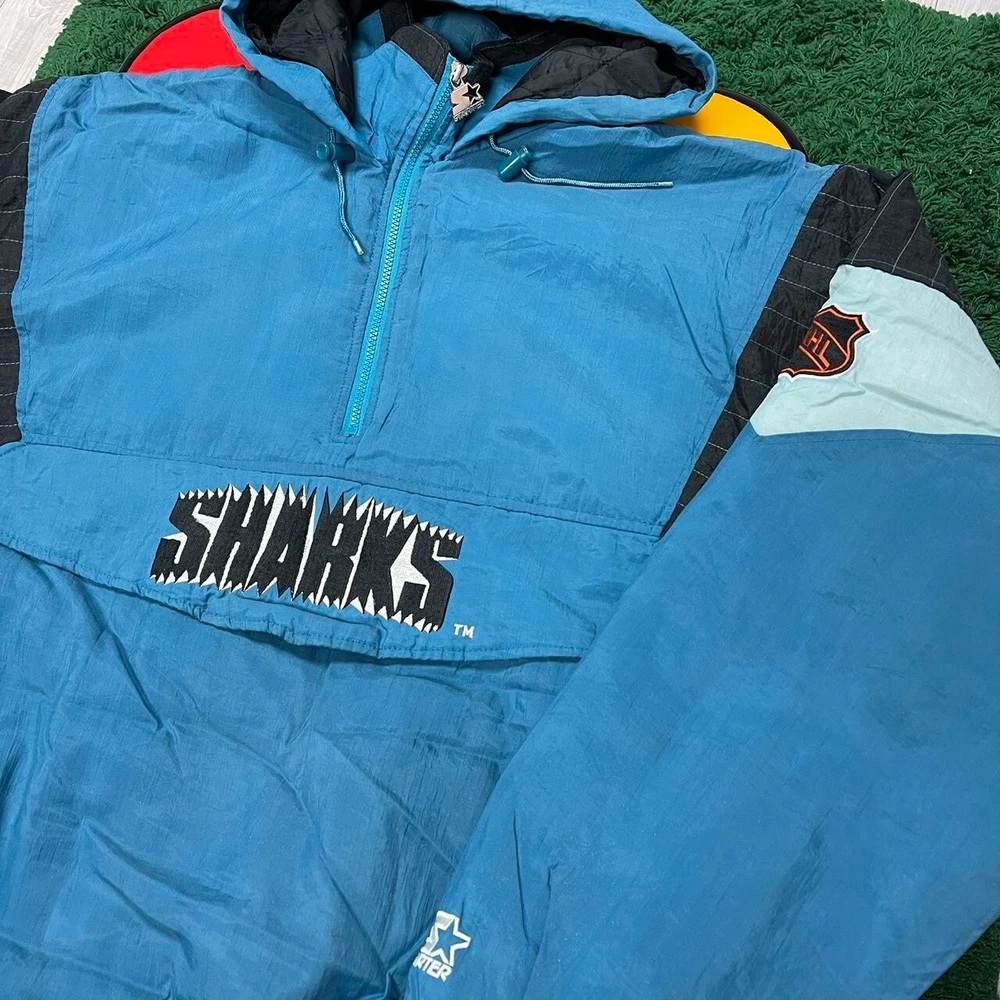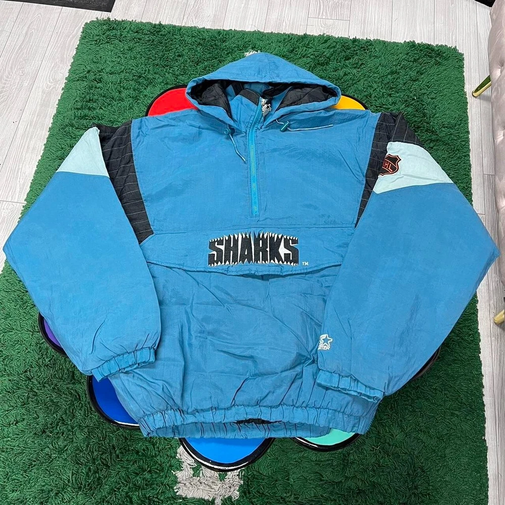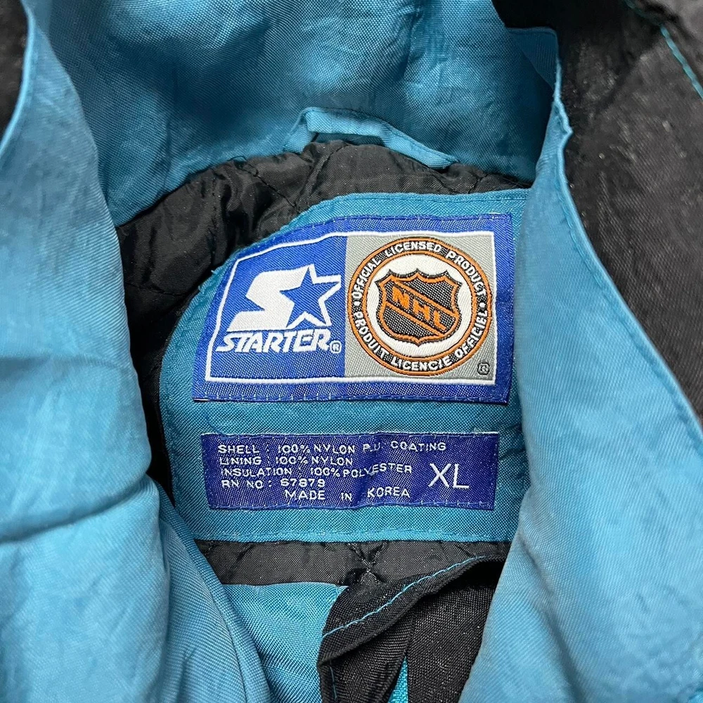 Vintage 90s NHL Hockey San Jose Sharks All Embroidered Front & Back Logo Heavy Weight Blue Puffer Starter Jacket 1990s Dated Size X-Large (side zipper doesn’t work but doesn’t affect the jacket) P2P 29 Length 29.5 #vintage #sharks #sanjosw #hockey #puffer
