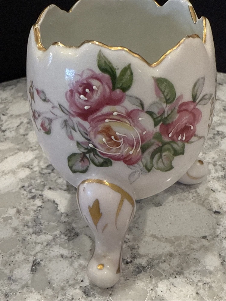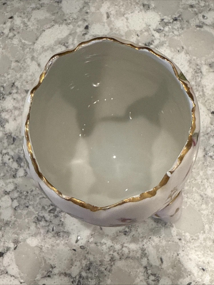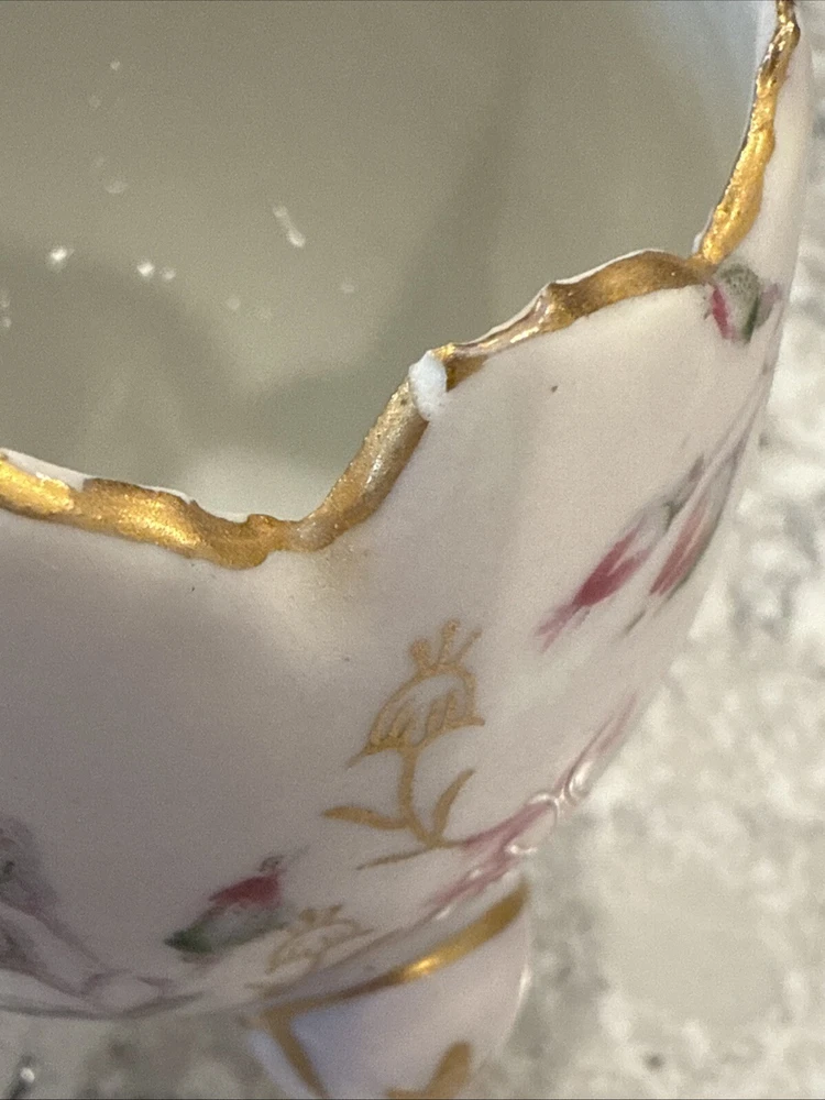 In great used condition, no major defects. One very tiny chip on rim as noted in photo. Paint is intact, gold accent paint intact.