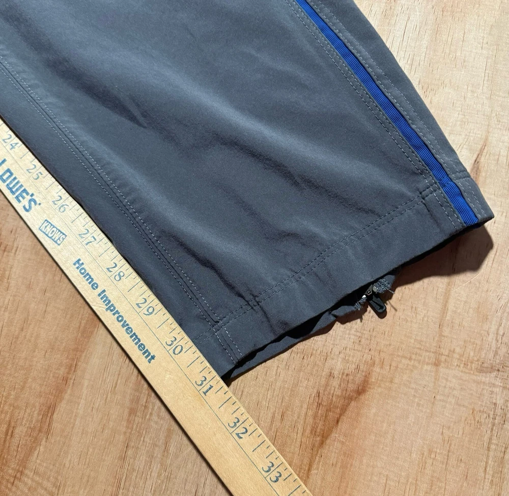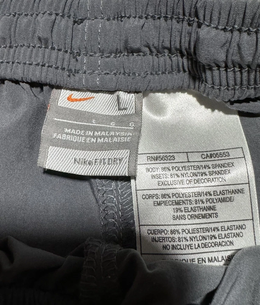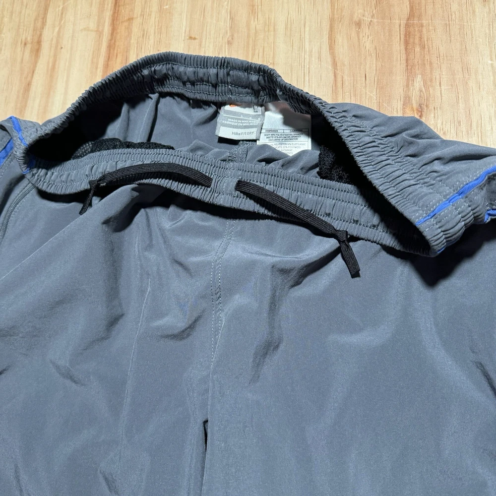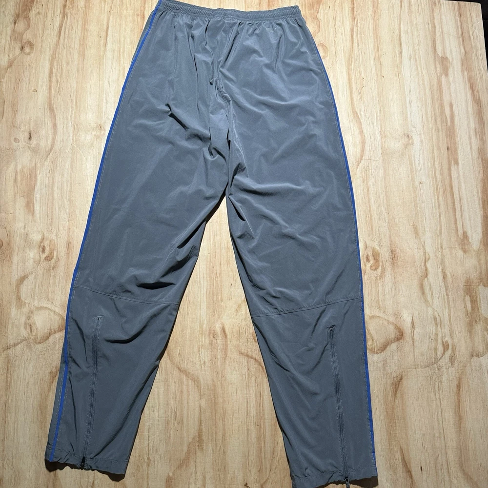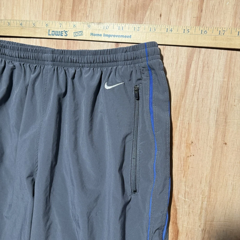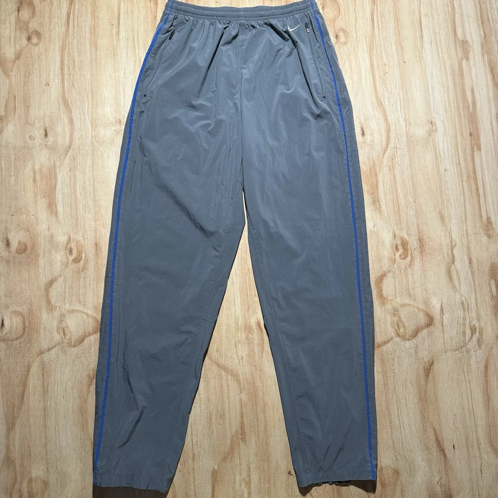 Excellent condition without holes or stains Elevate your activewear game with these vintage Nike Dri-Fit running track pants. These gray pants are made from a comfortable blend of poly spandex, featuring drawstring closures and zip ankles for a secure fit during cross training, running, or CrossFit activities. The pants also come with pockets for added convenience. Designed with an athletic fit, these pants are perfect for men who want to look and feel great during their workouts. The solid pattern and Nike branding add a touch of style to these functional pants. Made in Malaysia, these pants are a great addition to any activewear collection.