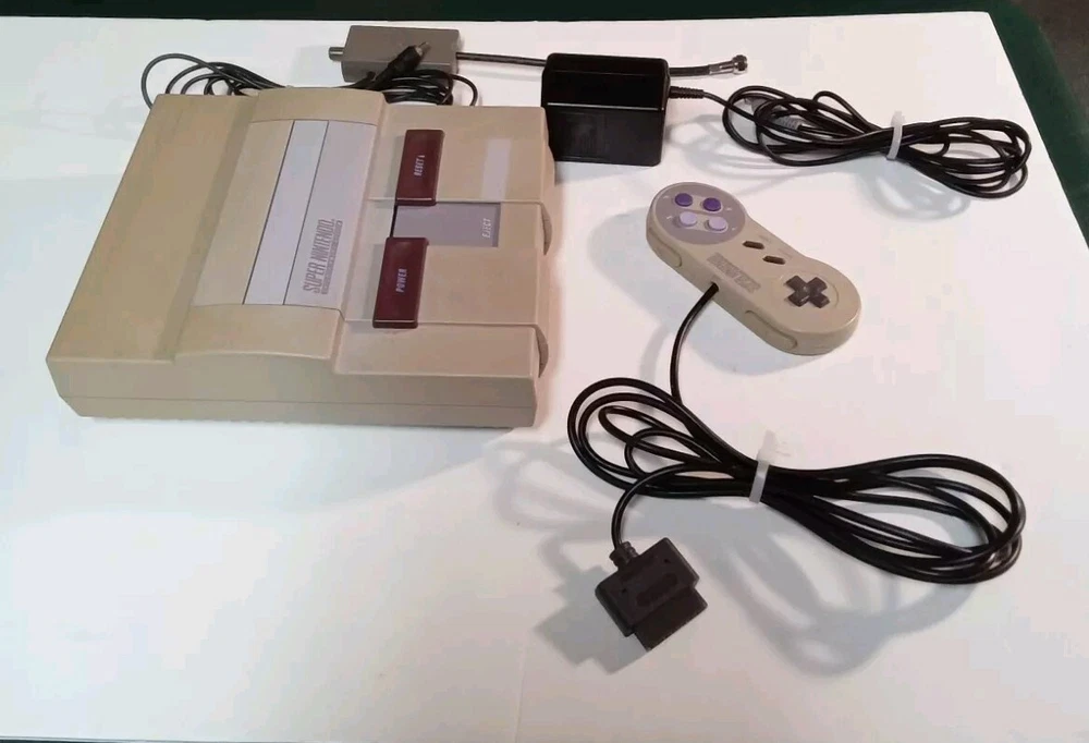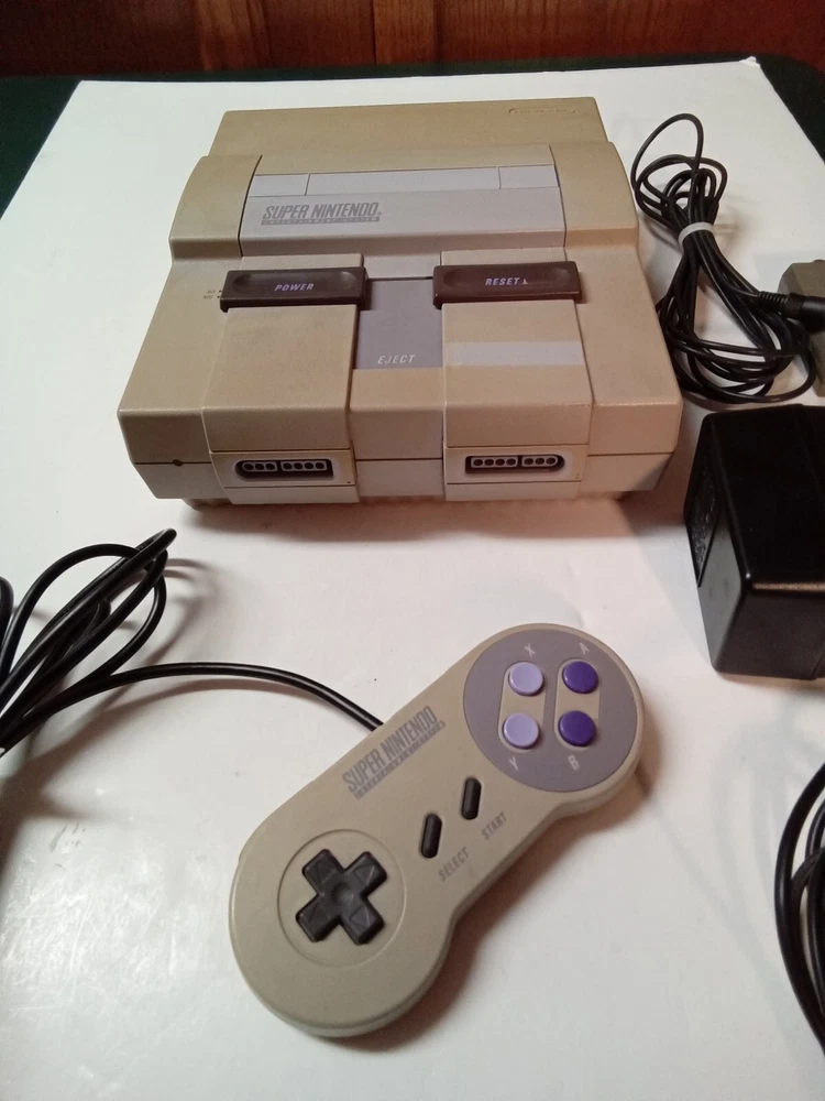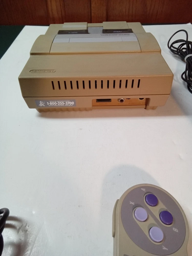 Dive into the nostalgia of classic gaming with the vintage Nintendo SNS-001 SNES Home Console. This timeless piece of gaming history brings the iconic Super Nintendo experience right to your living room. With its classic gray color and authentic Nintendo design, it's a perfect addition to any collector's or gamer's collection. The console comes with one controller, ensuring you can start playing right away. It's manufactured in Japan and features Composite RCA connectivity options for easy setup with your TV. Rediscover the joy of 16-bit gaming with this fully tested and working Nintendo SNES console, 1 controller and cords. The system is in used condition. See photos.