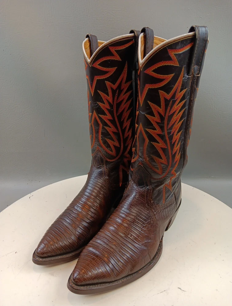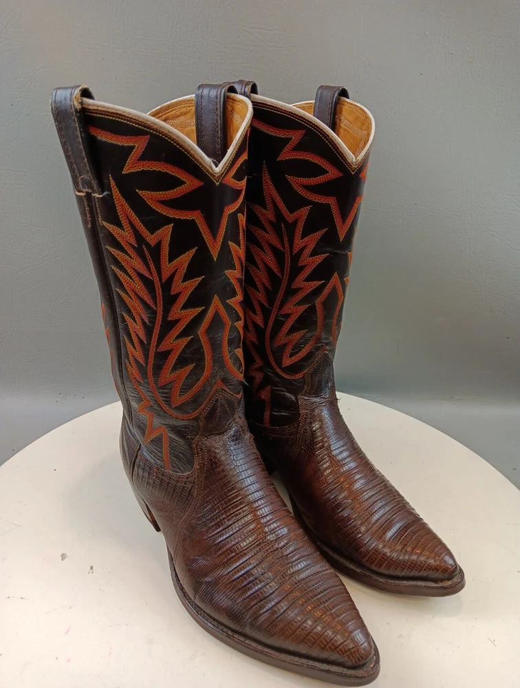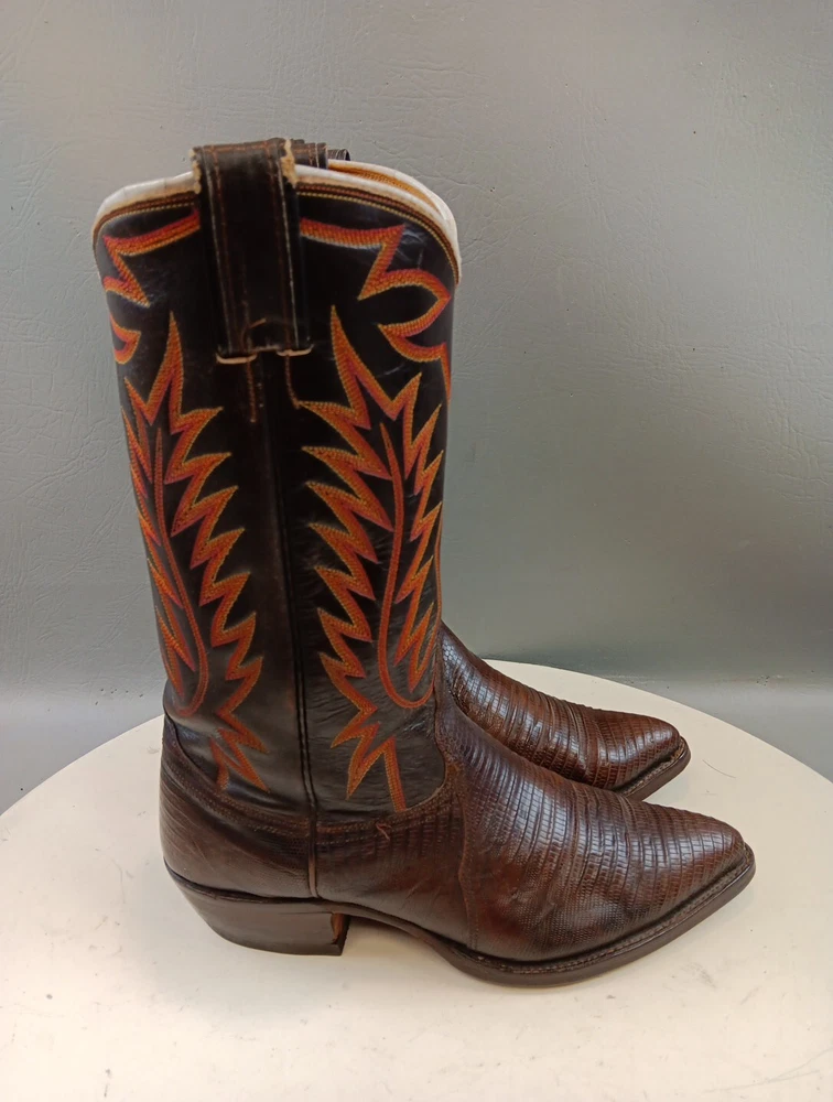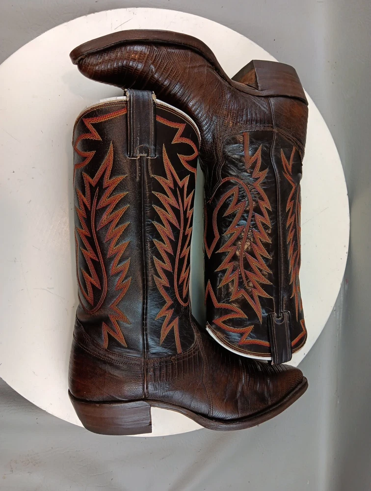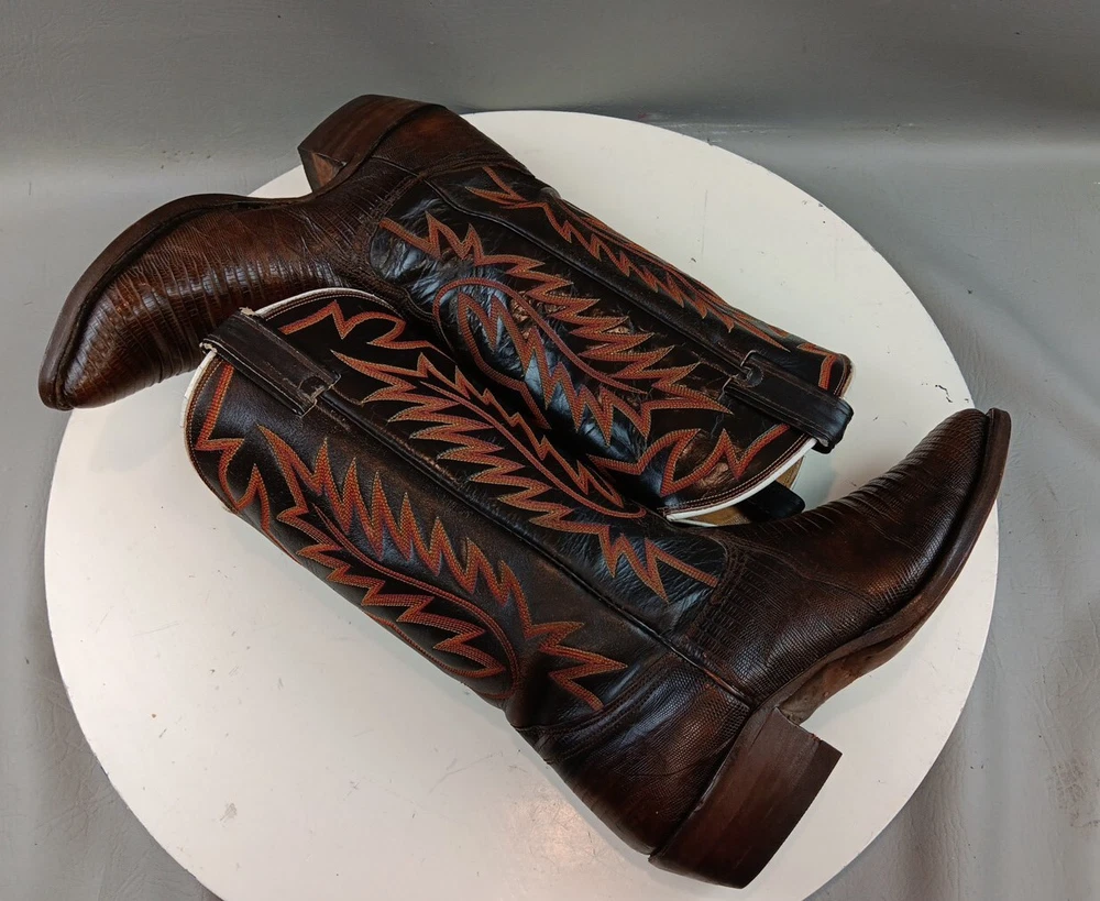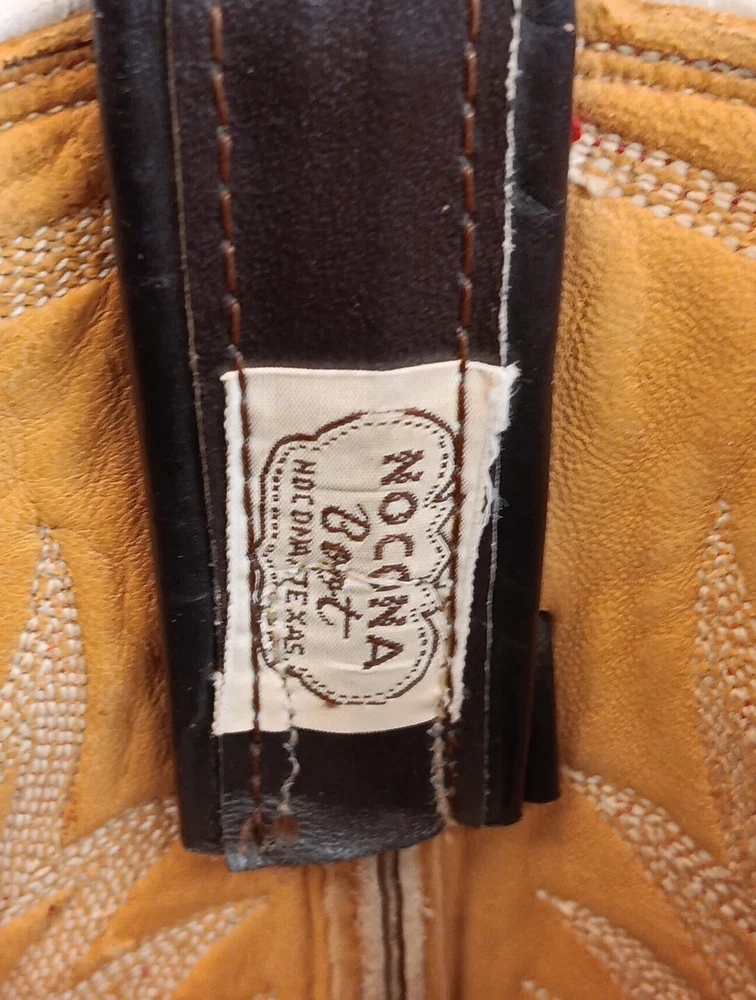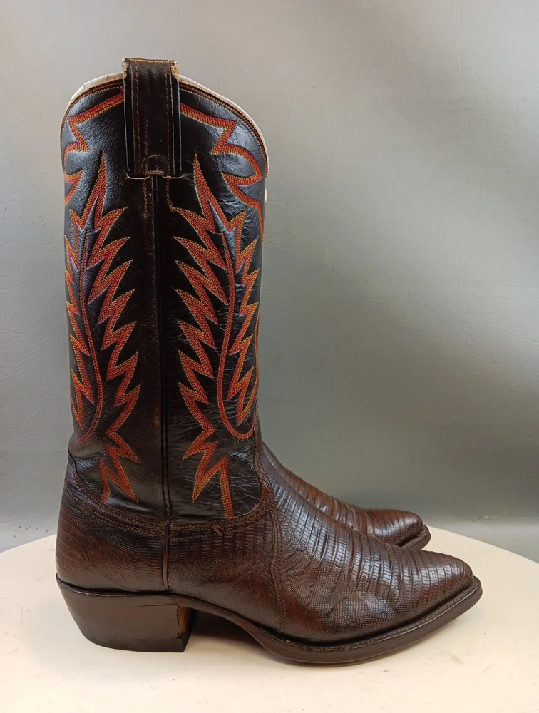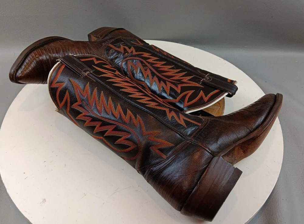 There are some signs of wear and tear. See photos for more details. These vintage Nocona cowboy boots are a must-have for any Western enthusiast. Crafted with brown lizard skin and a leather lining, these boots feature an almond toe shape and a mid-calf shaft style. The pull-on closure and leather outsole provide both comfort and durability, making them perfect for any cowboy task. The boots are handmade in the United States and showcase a unique lizard skin pattern. With a men's size 9D, these boots are perfect for any cowboy looking for a stylish and functional addition to their wardrobe. The insole is also made of leather, providing a comfortable fit for all-day wear. Get your hands on these beautiful Nocona boots and add a touch of Western style to your wardrobe today.