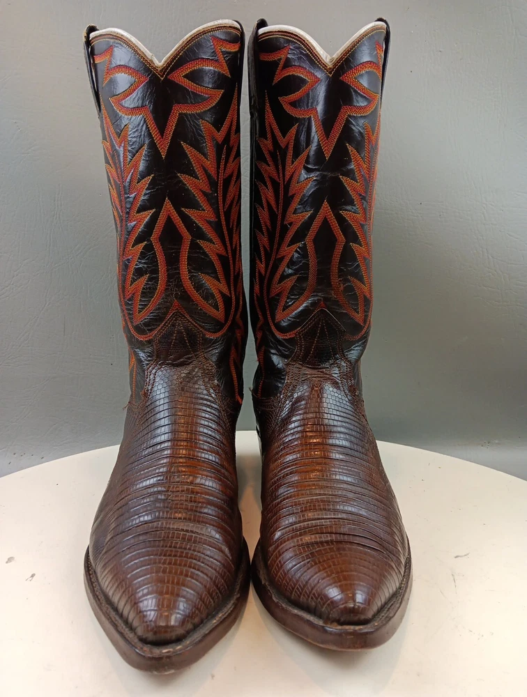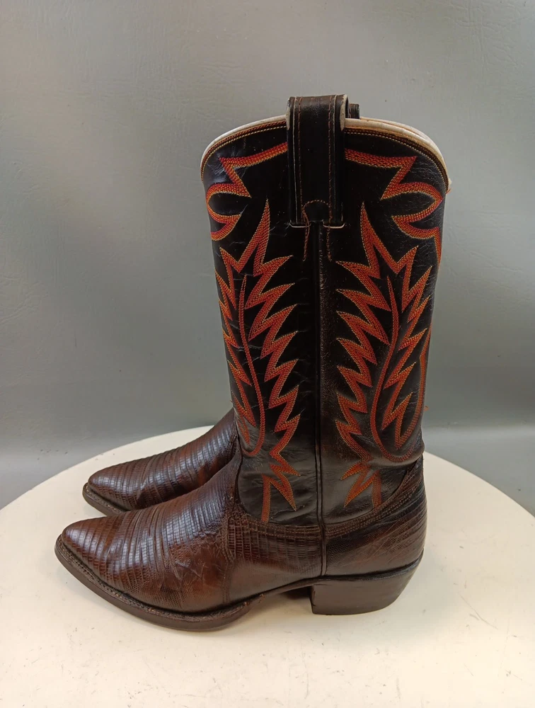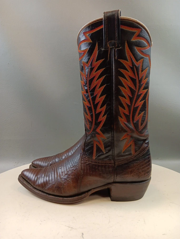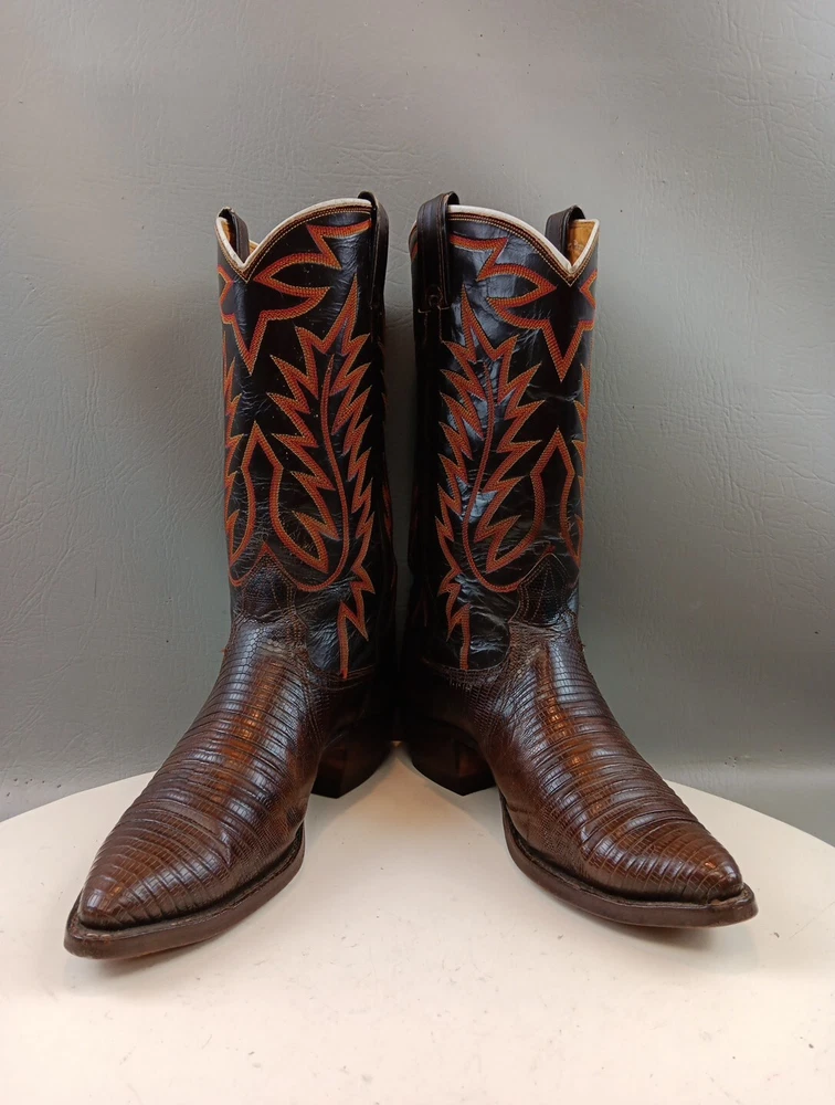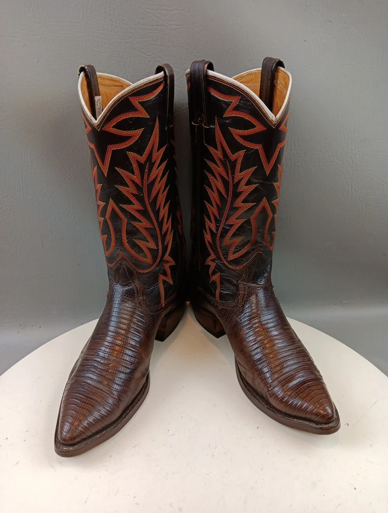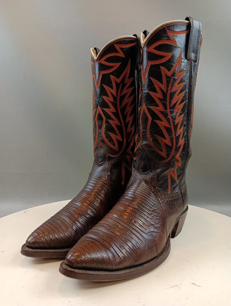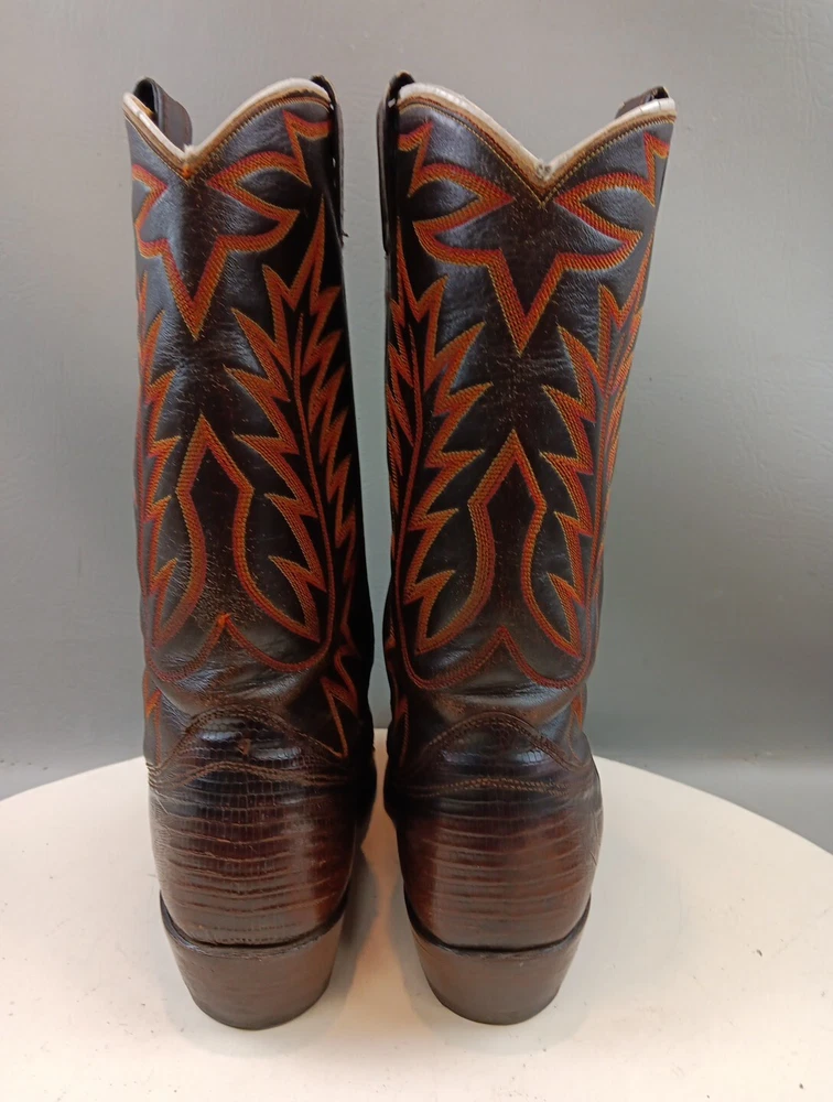 There are some signs of wear and tear. See photos for more details. These vintage Nocona cowboy boots are a must-have for any Western enthusiast. Crafted with brown lizard skin and a leather lining, these boots feature an almond toe shape and a mid-calf shaft style. The pull-on closure and leather outsole provide both comfort and durability, making them perfect for any cowboy task. The boots are handmade in the United States and showcase a unique lizard skin pattern. With a men's size 9D, these boots are perfect for any cowboy looking for a stylish and functional addition to their wardrobe. The insole is also made of leather, providing a comfortable fit for all-day wear. Get your hands on these beautiful Nocona boots and add a touch of Western style to your wardrobe today.