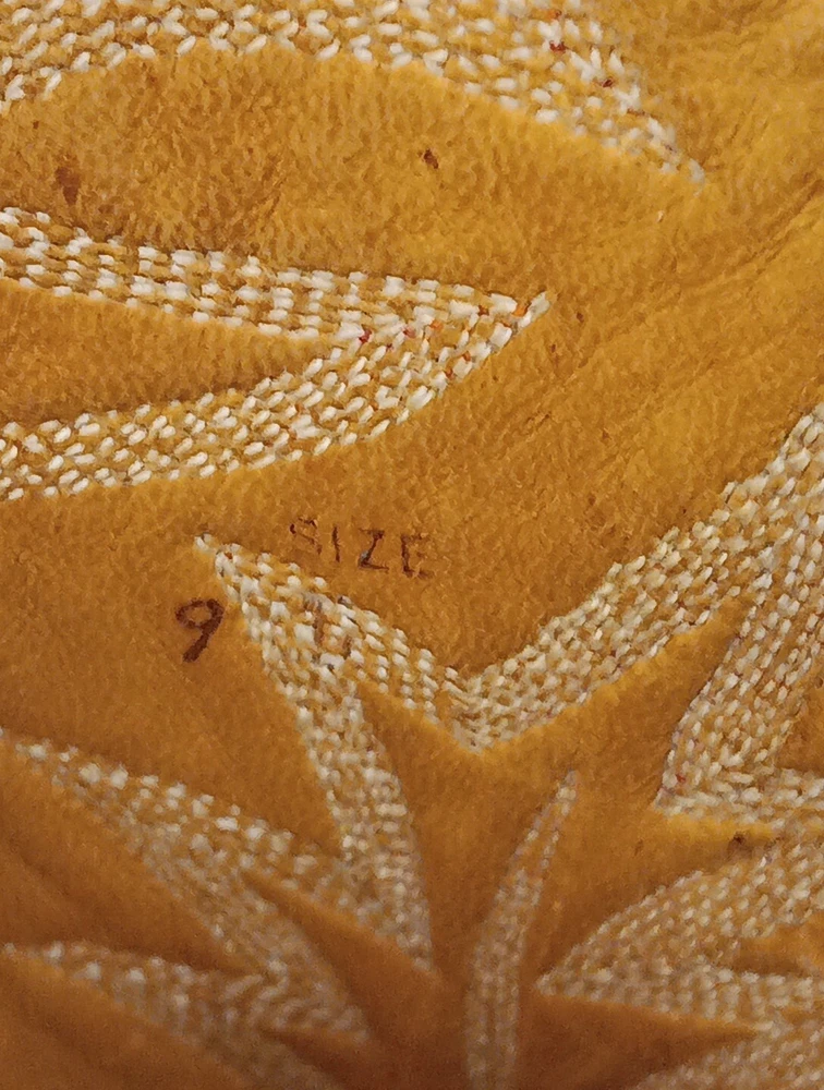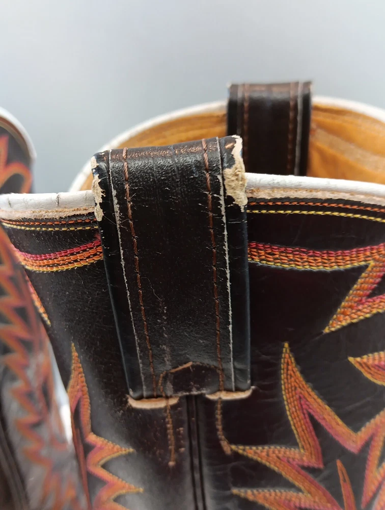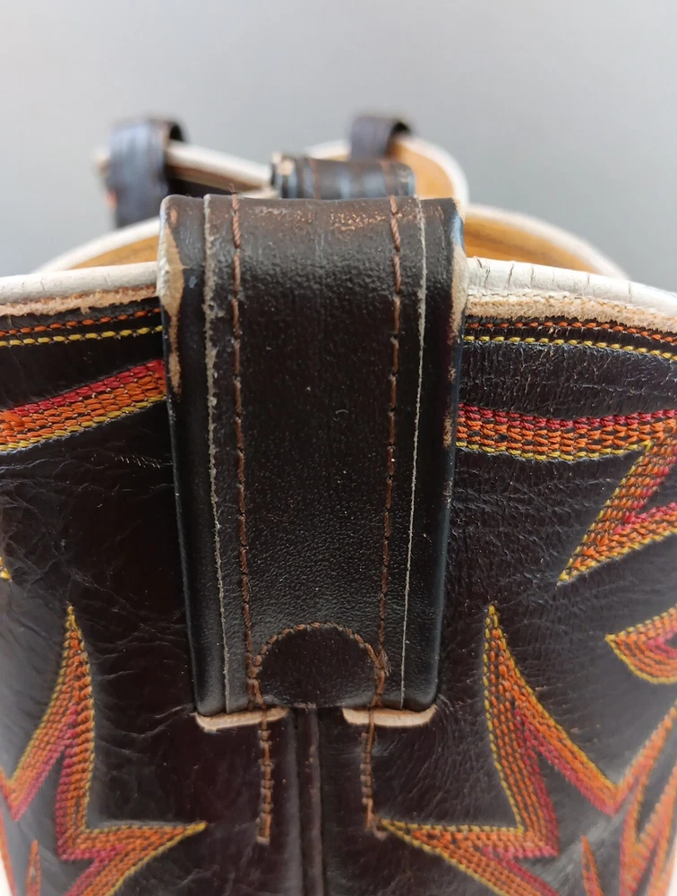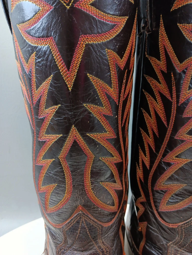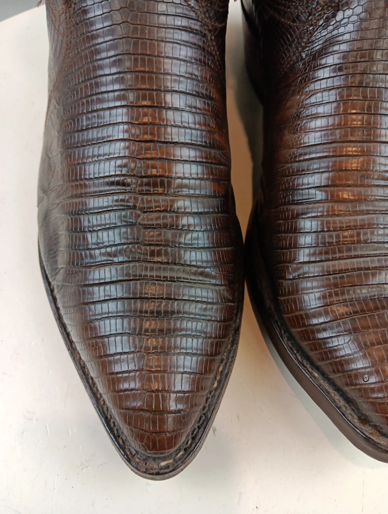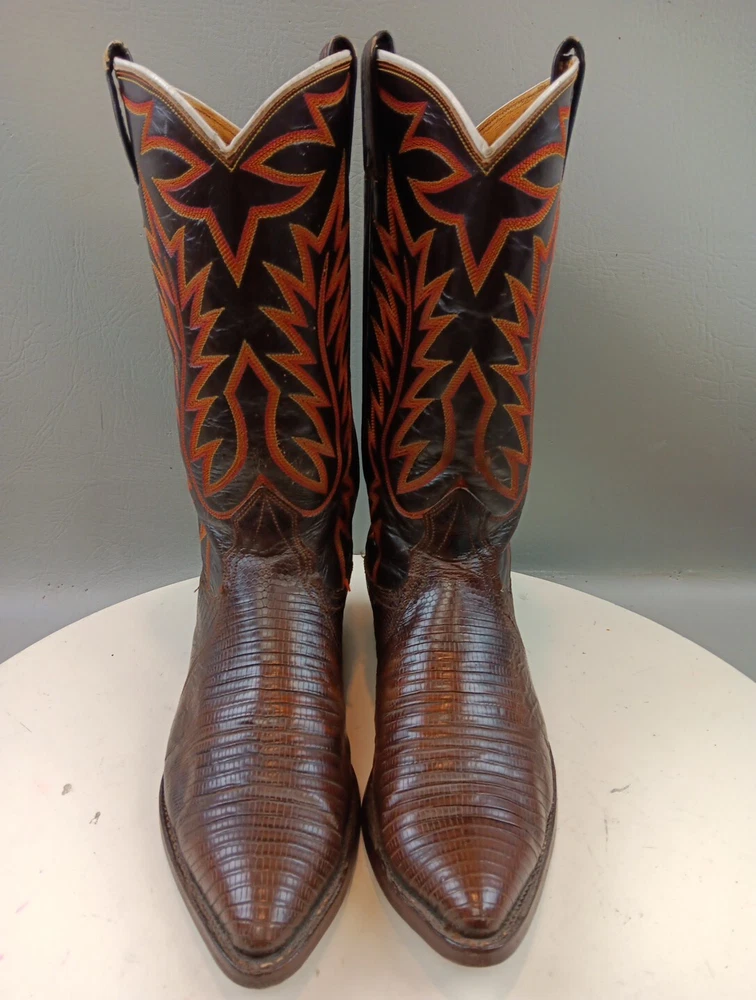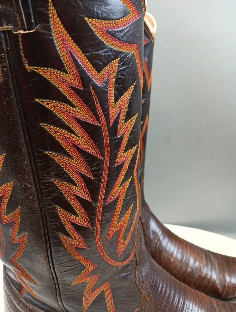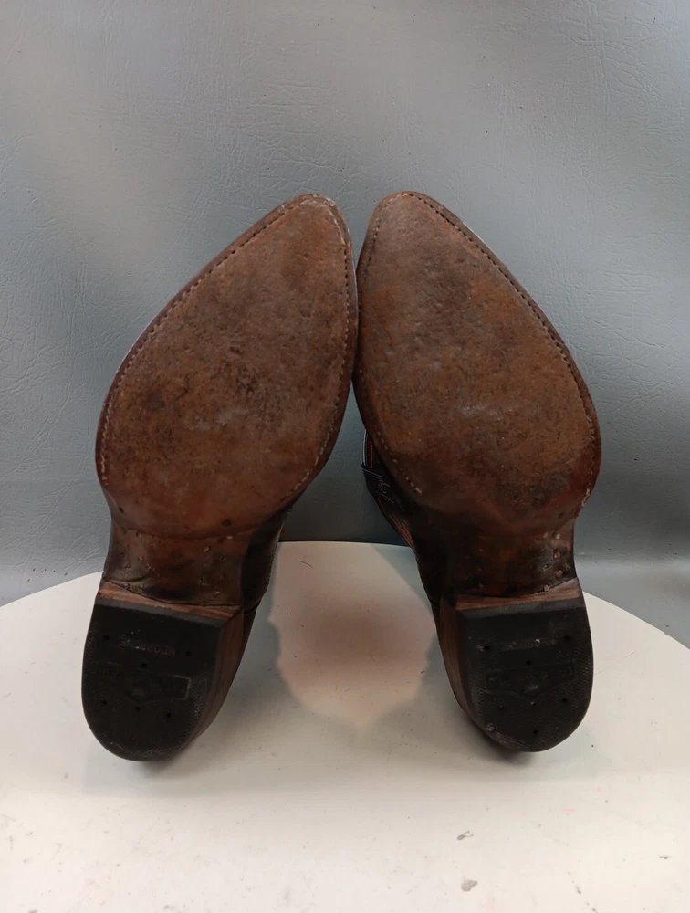 There are some signs of wear and tear. See photos for more details. These vintage Nocona cowboy boots are a must-have for any Western enthusiast. Crafted with brown lizard skin and a leather lining, these boots feature an almond toe shape and a mid-calf shaft style. The pull-on closure and leather outsole provide both comfort and durability, making them perfect for any cowboy task. The boots are handmade in the United States and showcase a unique lizard skin pattern. With a men's size 9D, these boots are perfect for any cowboy looking for a stylish and functional addition to their wardrobe. The insole is also made of leather, providing a comfortable fit for all-day wear. Get your hands on these beautiful Nocona boots and add a touch of Western style to your wardrobe today.