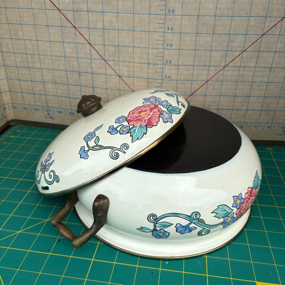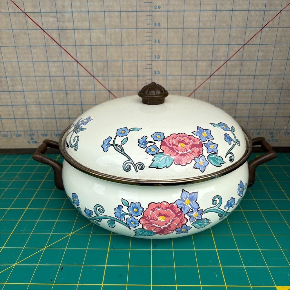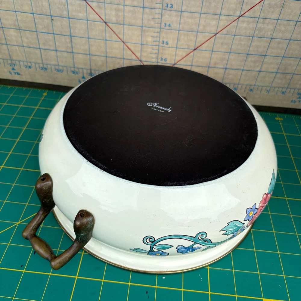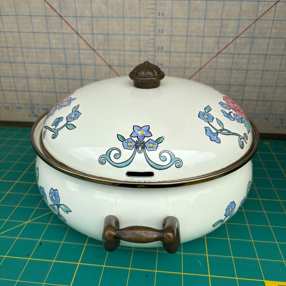 Vintage Normandy Dutch Oven Enamel Serving Pot with Lid Floral Design Brass Handles 10.5"w x 4"h 13.5w (with handles) For inventory = Alaska Shelf #2