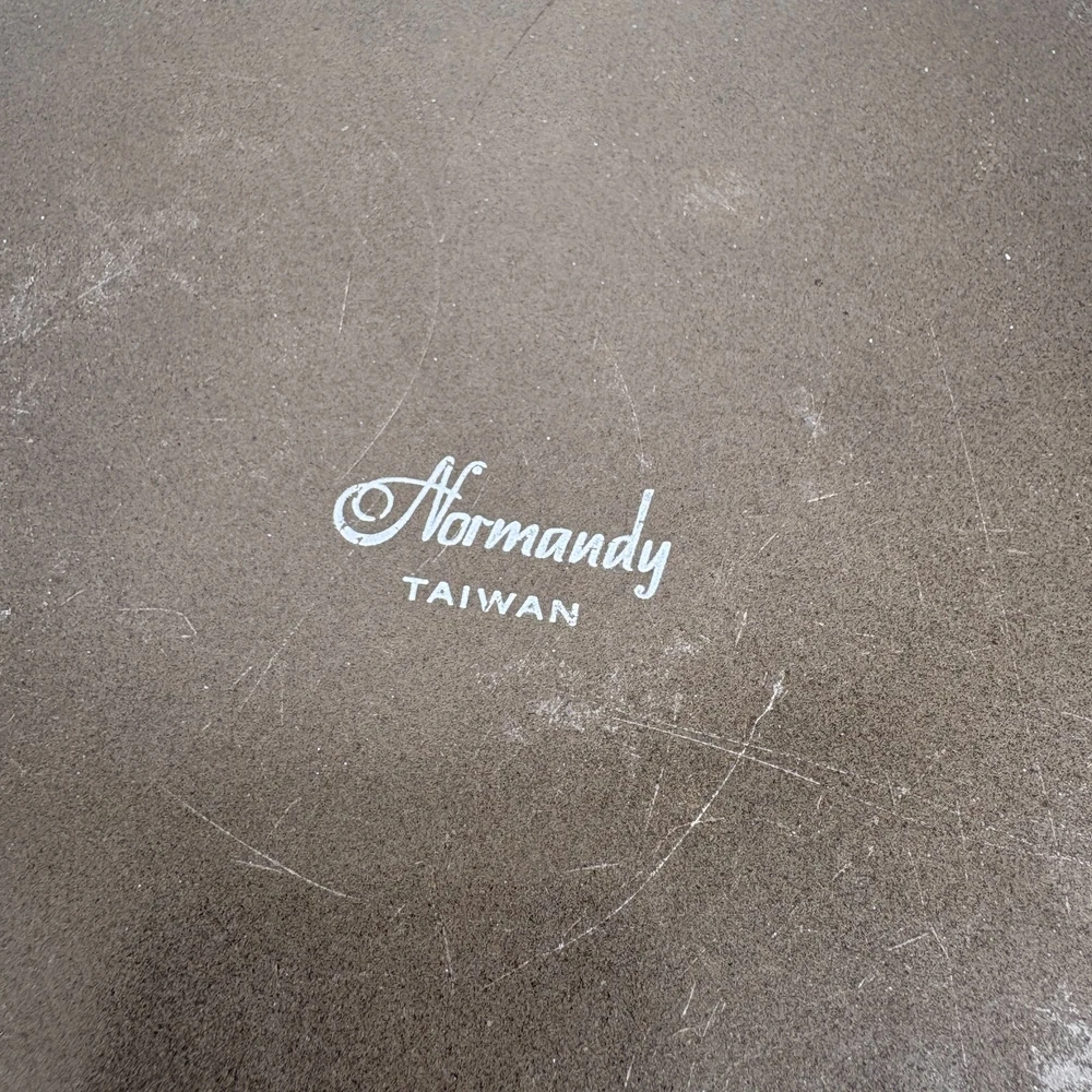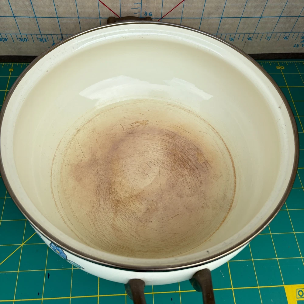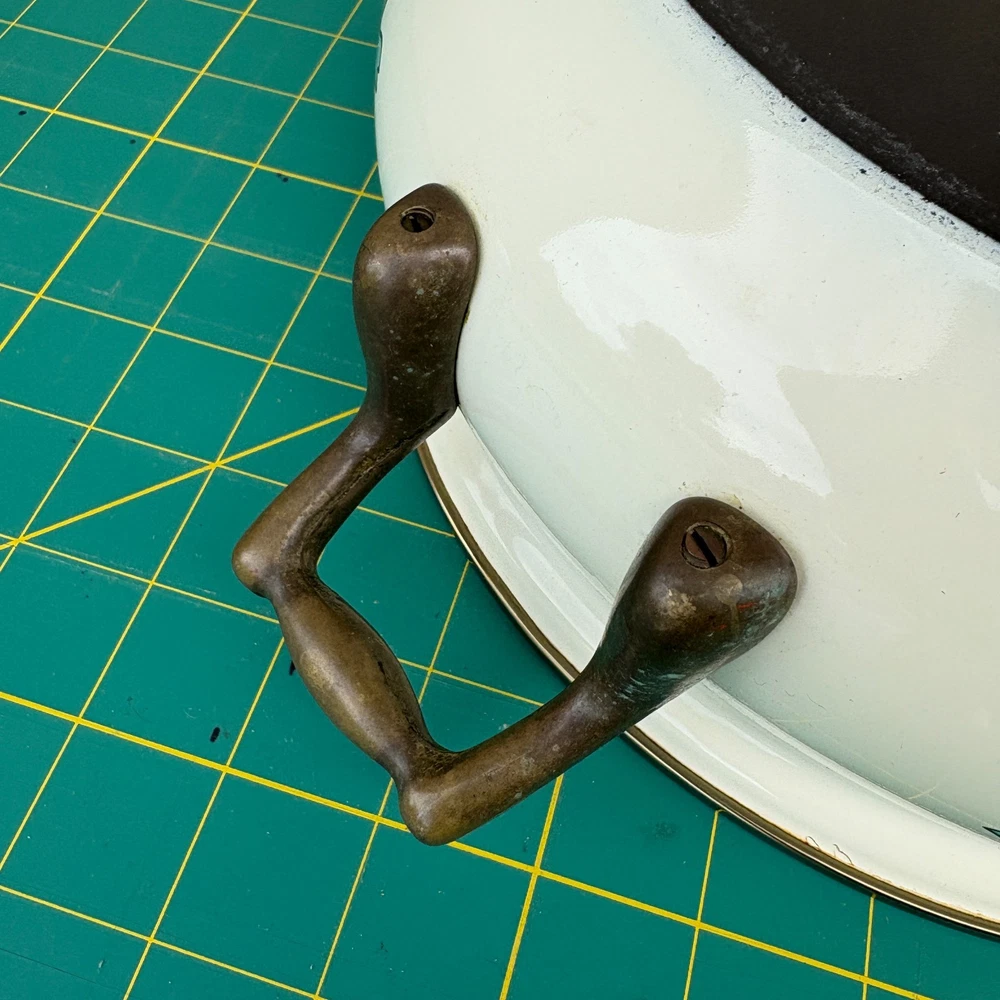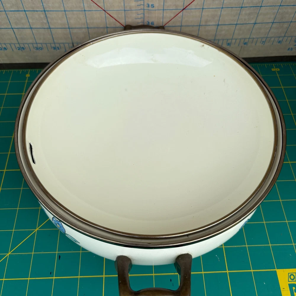 Vintage Normandy Dutch Oven Enamel Serving Pot with Lid Floral Design Brass Handles 10.5"w x 4"h 13.5w (with handles) For inventory = Alaska Shelf #2