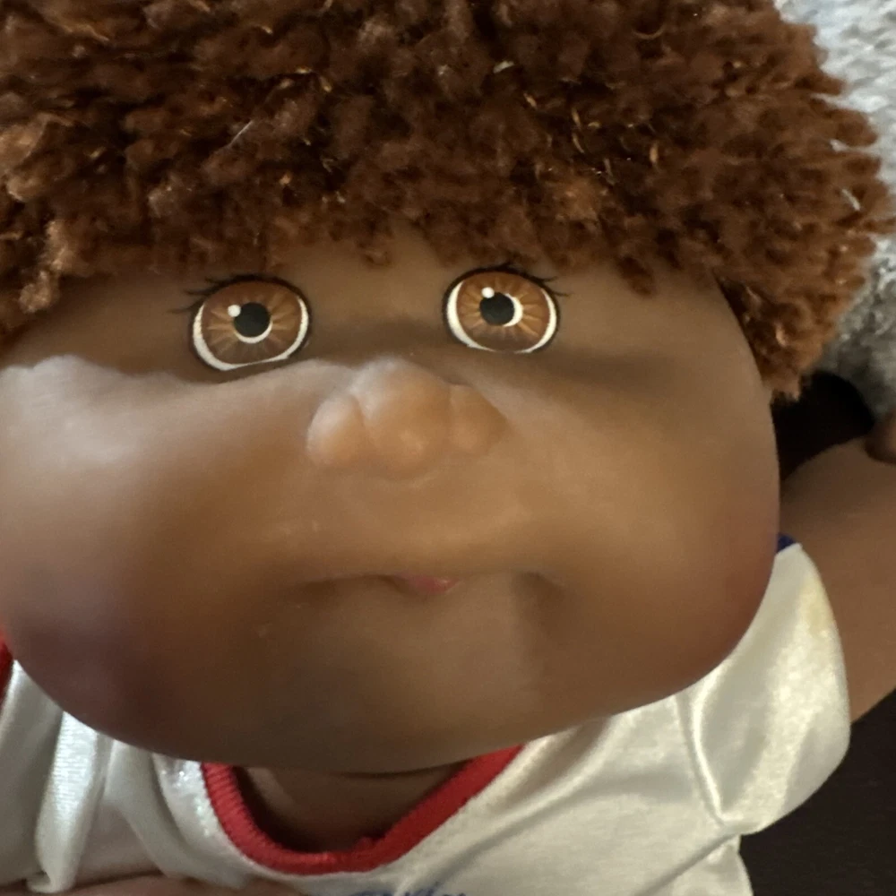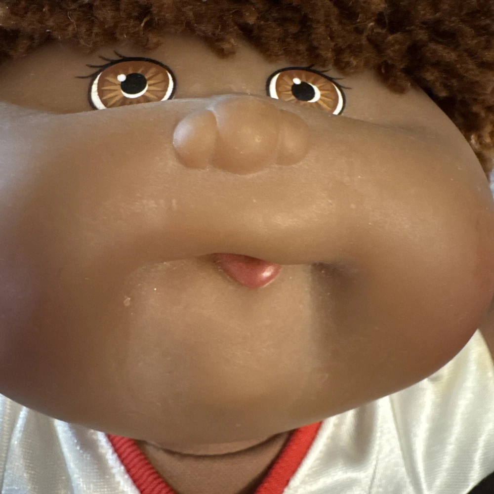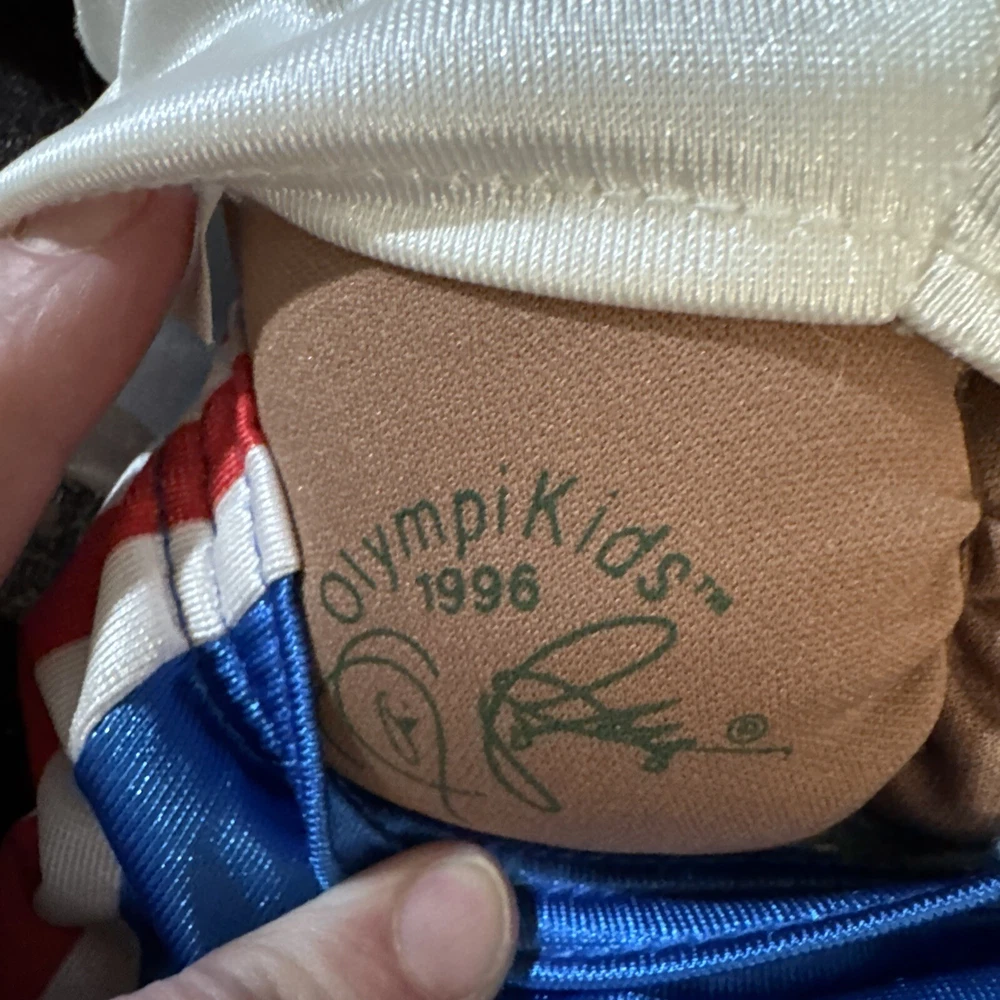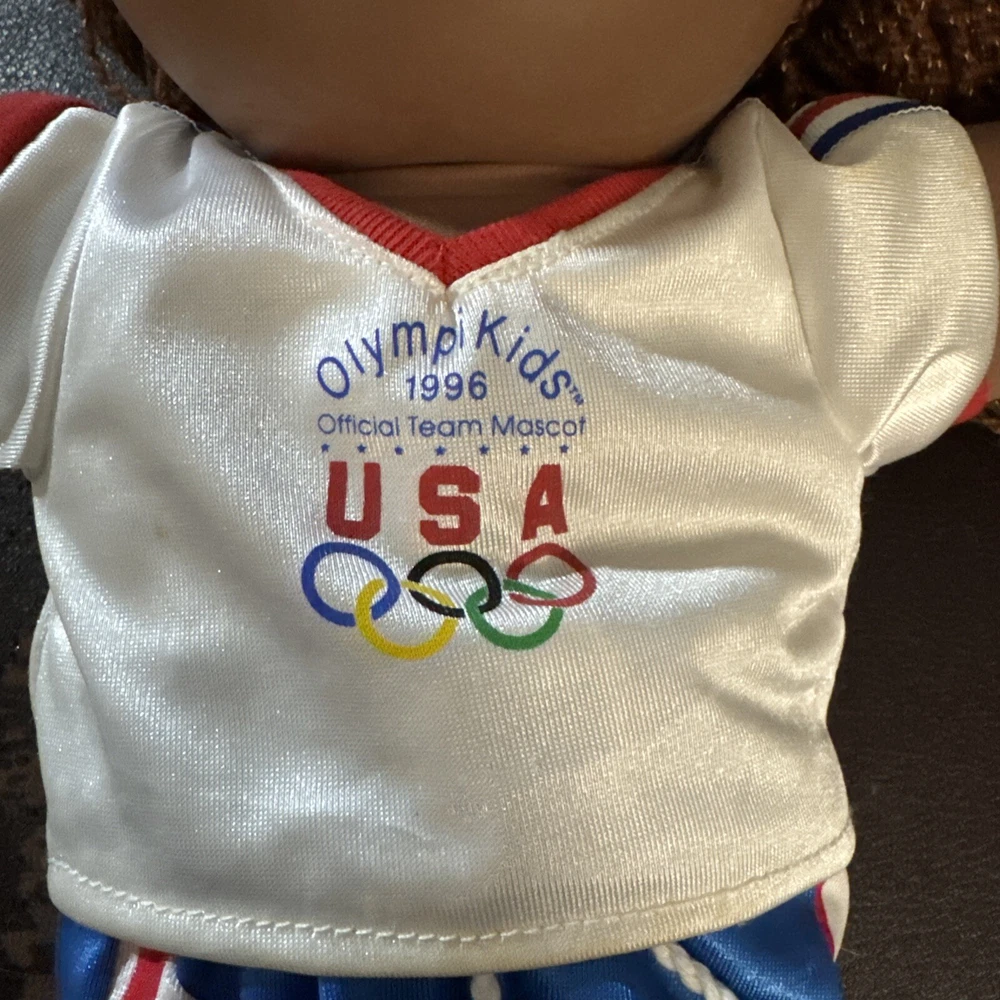 This vintage Cabbage Patch Kid from 1996 is part of the Olympic Kids collection and features an African American girl doll with medium dark complexion, brown hair, and brown eyes. The doll is 15 inches tall and comes with a soccer outfit. It is signed and considered a collectible item, making it a unique addition to any Cabbage Patch Kids collection.
