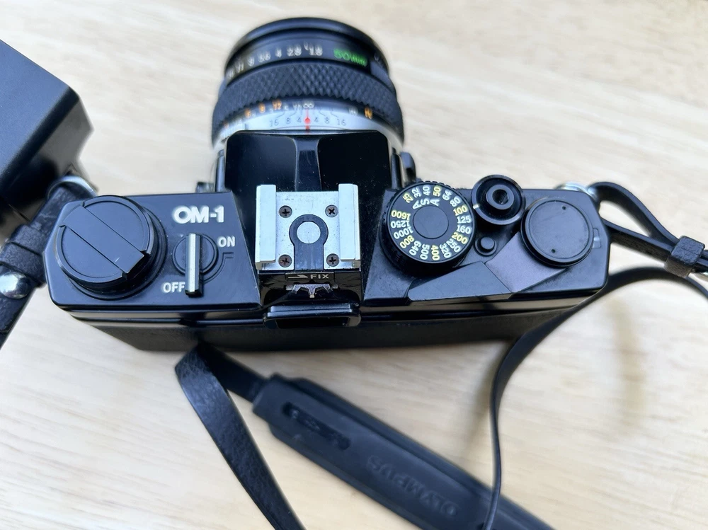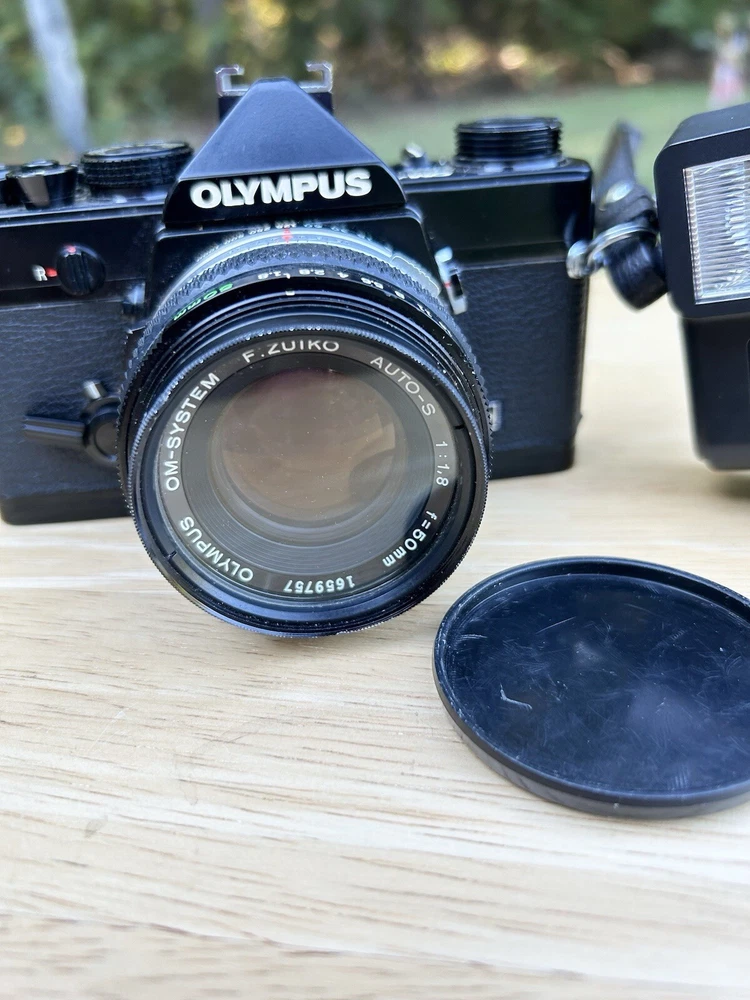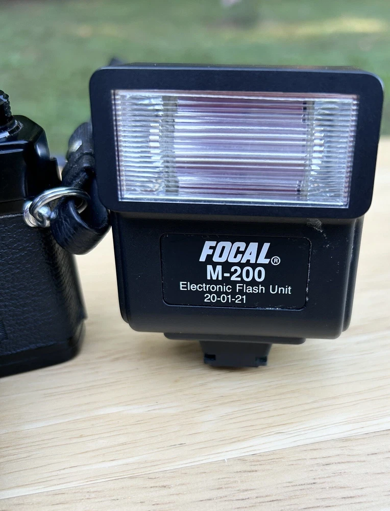 VTG Olympus OM-1 35 MM Camera W/ 50 MM Lens & Focal M-200 Electronic Flash Unit UNTESTED SHUTTER WORKS Made in Japan