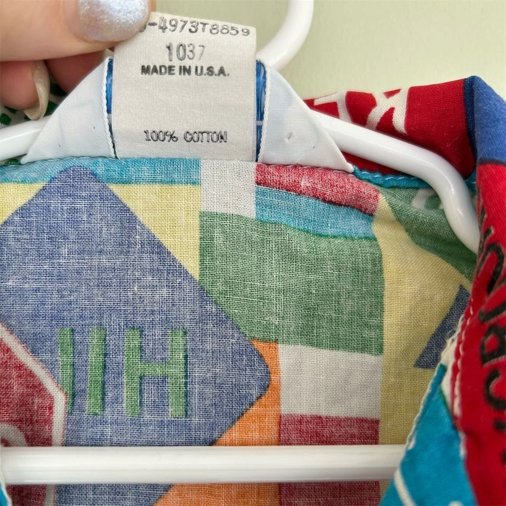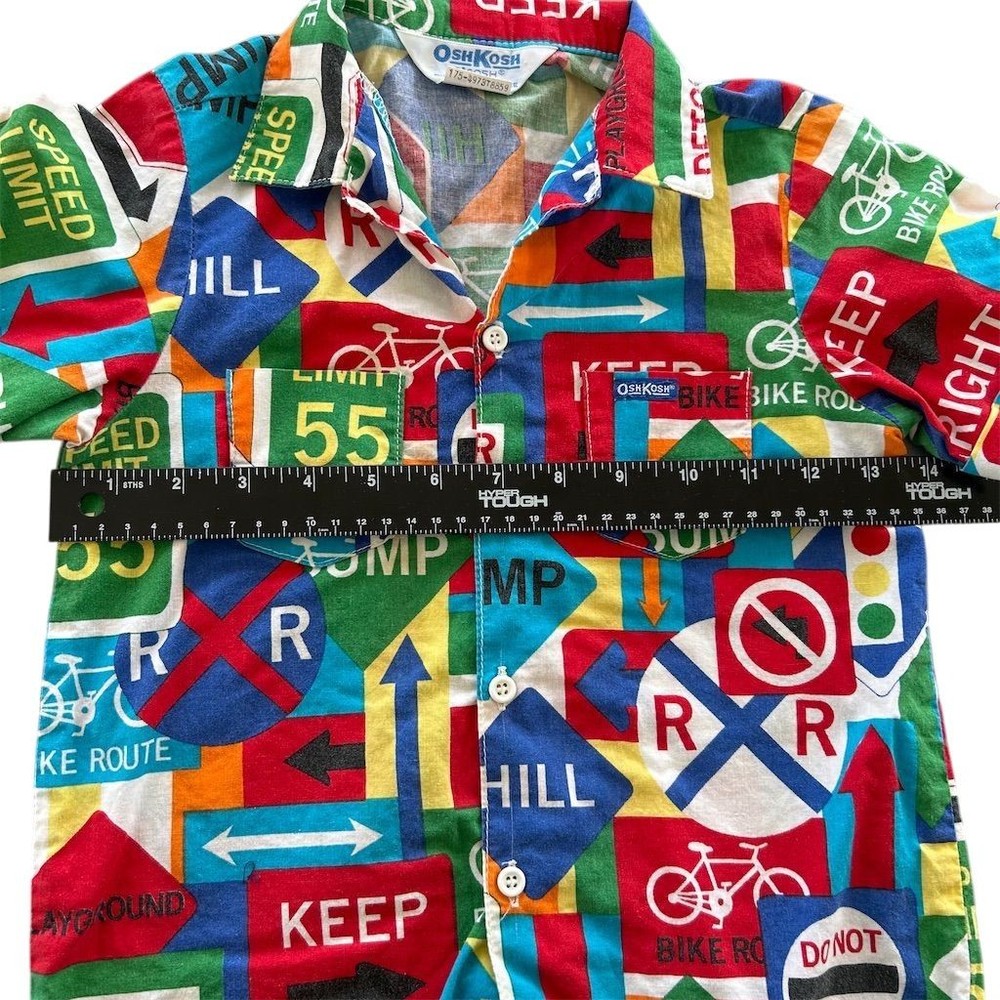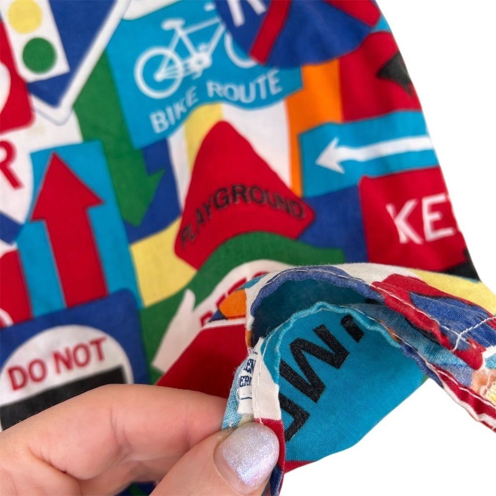 Kids road signs graphic collared short sleeve shirt. Vibrant allover print featuring traffic signs, speed limits, and bike routes. Button front closure with a chest pocket. Perfect for casual outings or themed parties. Measurements: • Chest (pit to pit): 15 in • Length (shoulder to hem): 18 in • Sleeve length: 6 in Department: Unisex Kids Type: Casual Sleeve Length: Short Sleeve Theme: USA Closure: Button Fabric Type: Cotton Pattern: Graphic Print Material: 100% Cotton All items come from a smoke free, pet friendly home. All of items unless NWT or Dry Clean Only are washed with Tide. We try our best to disclose any flaws with items, if we miss something please reach out and let us know. We offer combined shipping on all our items. We do take measurements of our clothing listed for sale. Please compare the measurements to something you already own.