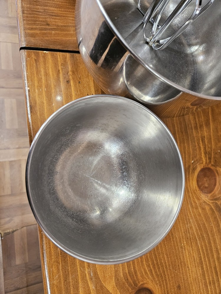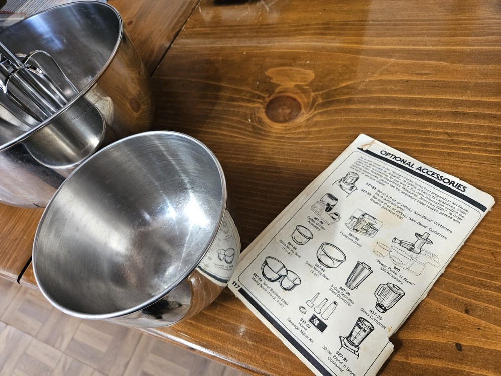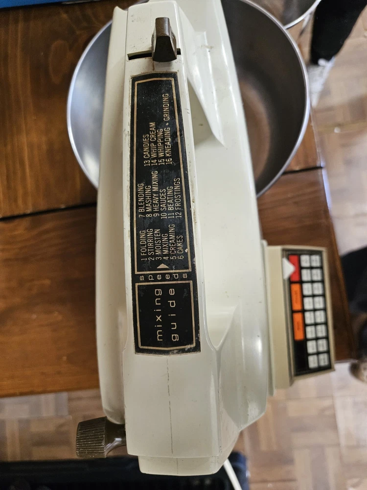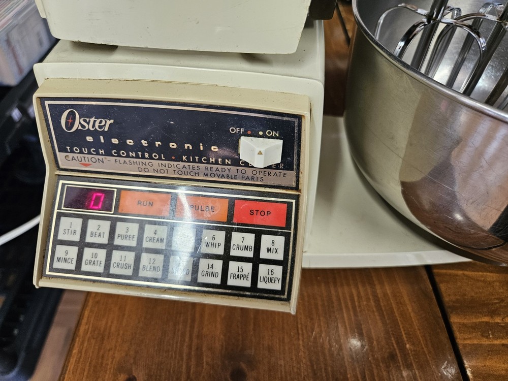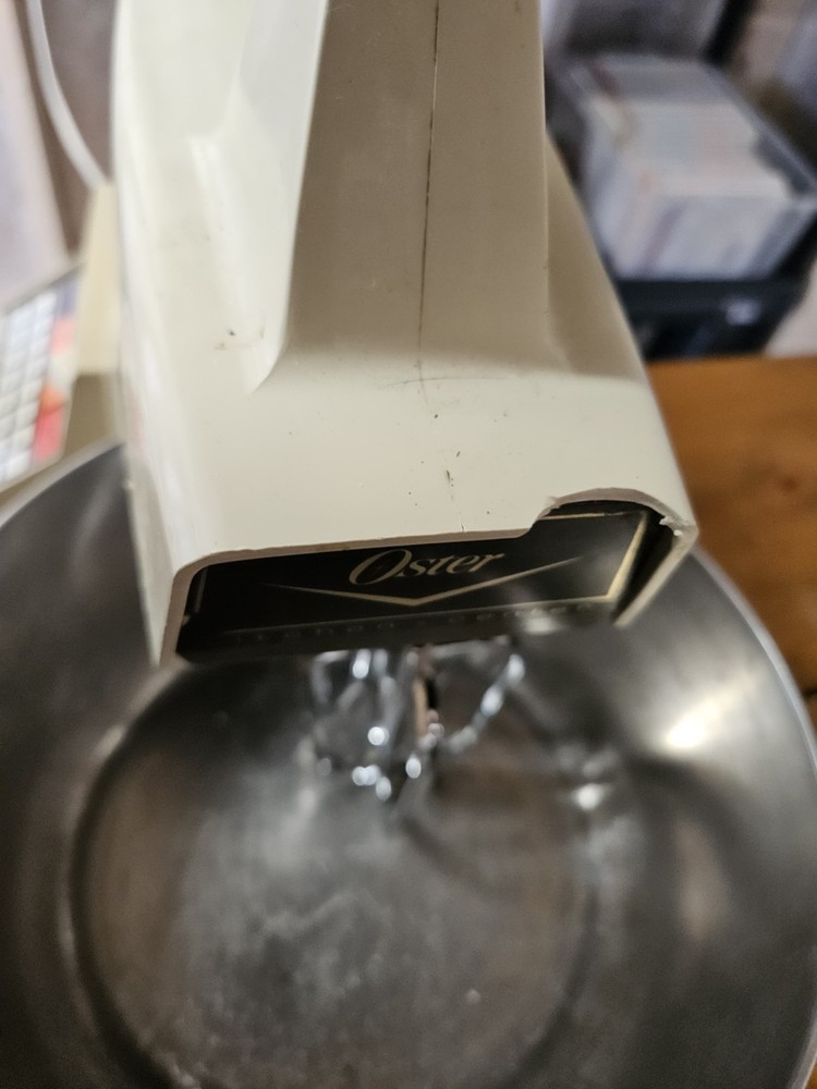 note*** you can see in pics there is a chip at the top but otherwise good shape and has been tested. Get everything that is included in the pictures. The VTG Oster Regency Kitchen Center is a versatile 16-speed multi-use machine perfect for your countertop. With its electric power source and durable plastic material, this almond-colored appliance from Oster is designed for whipped cream, dough, and smoothie making. The unit quantity is one, making it a convenient and efficient addition to your kitchen arsenal.