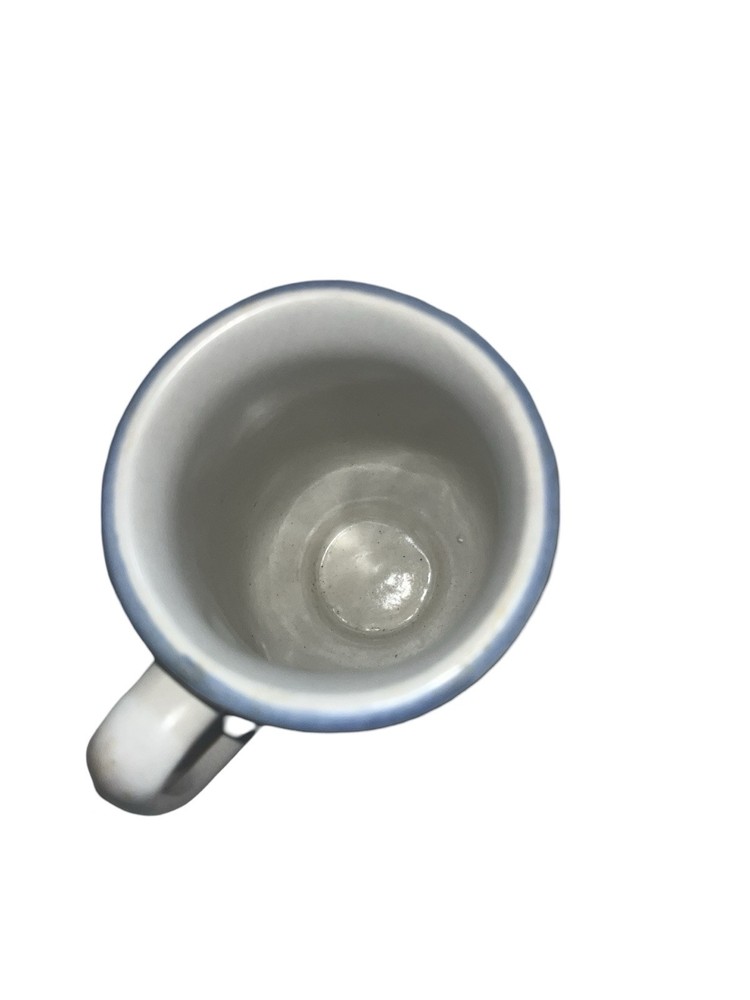 This vintage Pfaltzgraff Yorktowne stoneware mug from 1976 features a round shape with a Dutch Colonial style. It has a capacity of 9 oz and stands at 5 inches tall with a matte finish. The mug is decorated with a blue and white floral pattern, suitable for all occasions. It is dishwasher safe, has a handle, and is part of the American-themed production line.
