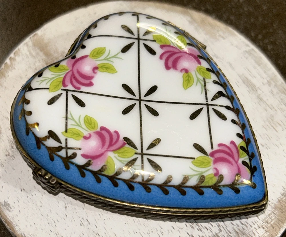 VTG Porcelain Je t'aime Love Heart Shaped Trinket Pill Box Limoges Style Hand Painted Pink Flowers With Gold Accents On Baby Blue And White Porcelain 3” Long 2.5” Wide Beautiful Item Very Good Condition See All Pics As Part Of Full Description