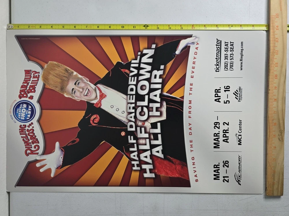 πͺβ¨ Step Right Up, Ladies and Gentlemen! Behold a Piece of Circus History! ππ€ΉβοΈ Are you ready to marvel at a rare treasure from the world of extravaganza? Presenting an authentic vintage Ringling Bros. and Barnum & Bailey Circus rigid poster from the 135th edition of "The Greatest Show on Earth" ! π This isn't just any poster; it's a thick, rigid display show board that once stood tall, luring in crowds with promises of dazzling performances and heart-stopping stunts! π π© What Makes This Display Board Spectacular? π© Unique Design : Featuring a show-stopping clown with an unforgettable hairdo and the catchy slogan: β** Half Daredevil. Half Clown. All Hair. β πβοΈ Quality Material : Unlike regular posters, this board is thick and rigid , perfect for display and durable enough to withstand the sands of time. No rolling up this masterpiece! Iconic Dates : Advertises show dates at DC Armory, MCI Center , and the Patriot Center from March 21 - April 16, 2004 . A golden era for the legendary circus! π Dimensions : Measures approximately 22 inches by 14 inches , giving it a commanding presence on any wall or display area. πͺ A Glimpse into Circus History πͺ The 135th edition in 2004 was a momentous year for Ringling Bros. and Barnum & Bailey, famous for their breathtaking performances and larger-than-life characters. Did you know? Fun Fact : The 2004 show introduced new acts and continued the tradition of bringing joy to millions around the world. This poster is a vibrant reminder of that magic! π Historical Significance : Known as "The Greatest Show on Earth," the Ringling Bros. and Barnum & Bailey Circus has an illustrious history dating back to 1871. Having a piece from the 135th edition is like holding a piece of legendary entertainment history! π π Condition π This rigid display board has been lovingly preserved and is in excellent vintage condition : Front : Vivid colors with minimal signs of wear. Some minor corner imperfections and slight shelf wear as seen in the photos, but nothing that detracts from its overall appeal. β¨ Back : Clean and mostly untouched, back side is blank as designed to focus all attention on the mesmerizing front. π§Ό π Perfect For: π Circus Enthusiasts : Add a unique and rare piece to your collection! π© Vintage Collectors : Own a piece of history from the most famous circus in the world! π Decor Enthusiasts : Brighten up your space with this vibrant, rigid display board! πΌοΈ Fun Fact Lovers : Impress friends with cool trivia about the 135th edition show! π Don't miss your chance to own a genuine piece of circus history thatβs sure to be a conversation starter and a cherished collectible! π€‘π Grab it now before it disappears into the annals of time! Note: This is a collectible item and not a toy. Please handle with care and keep away from children. π€Ή πͺβ¨