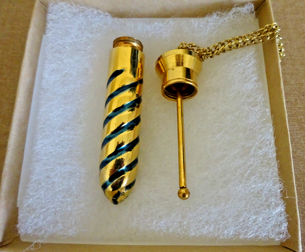 VTG SOLID BRASS PERFUME BOTTLE PENDANT THREADED CAP DAUBER ON GOLD TONE CHAIN