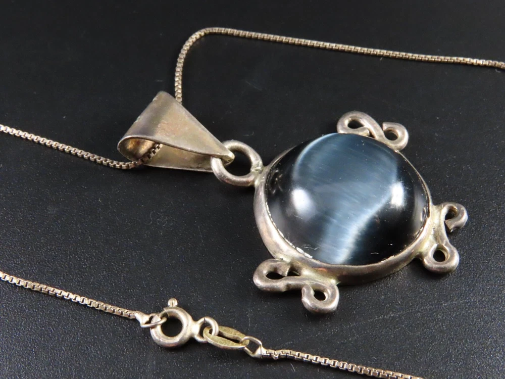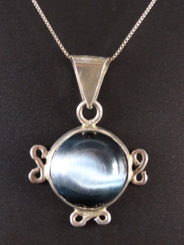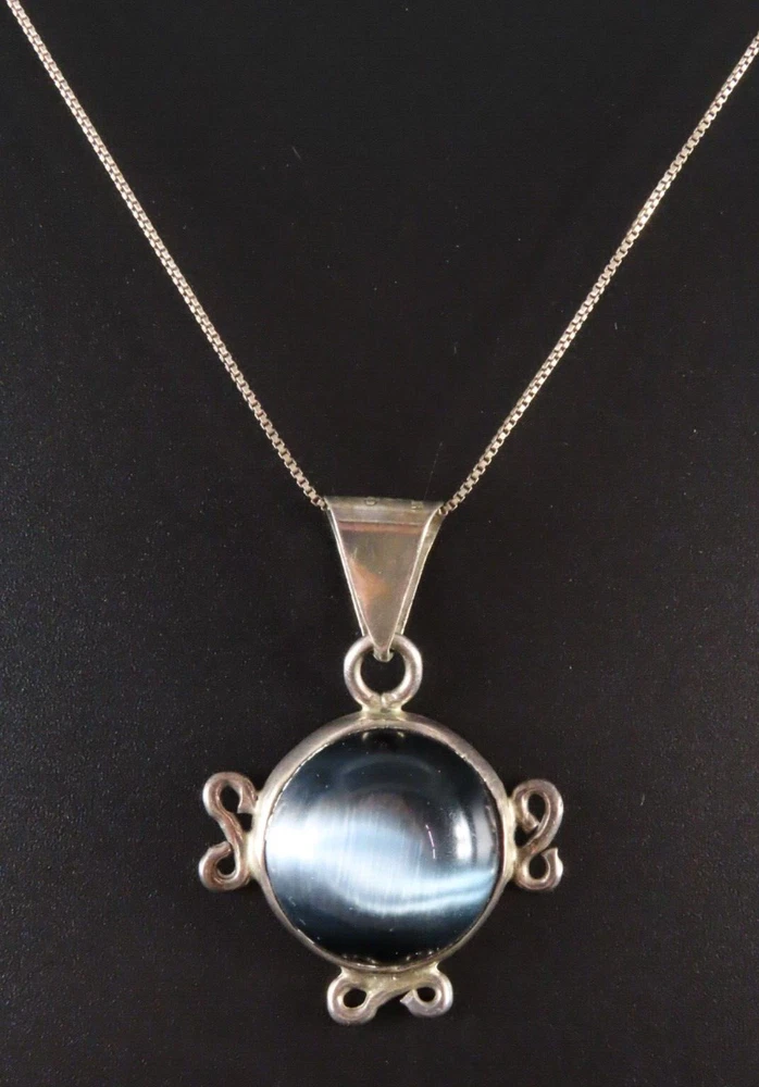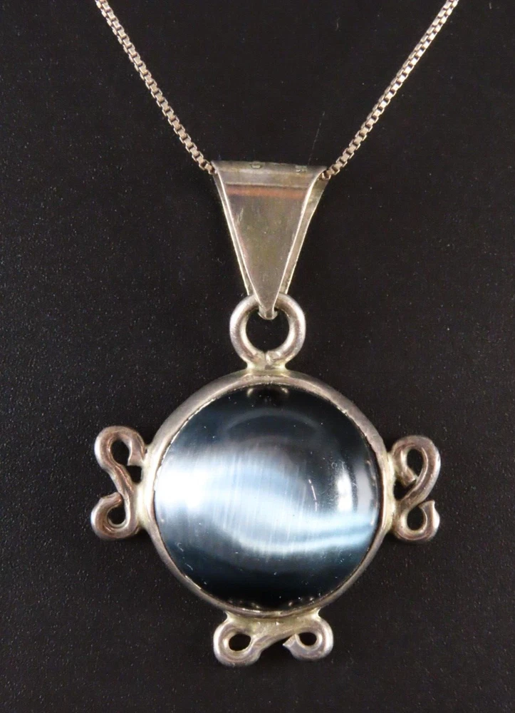 VTG STERLING SILVER Taxco Mexico CHAIN NECKLACE Blue-Gray Cats Eye GLASS PENDANT