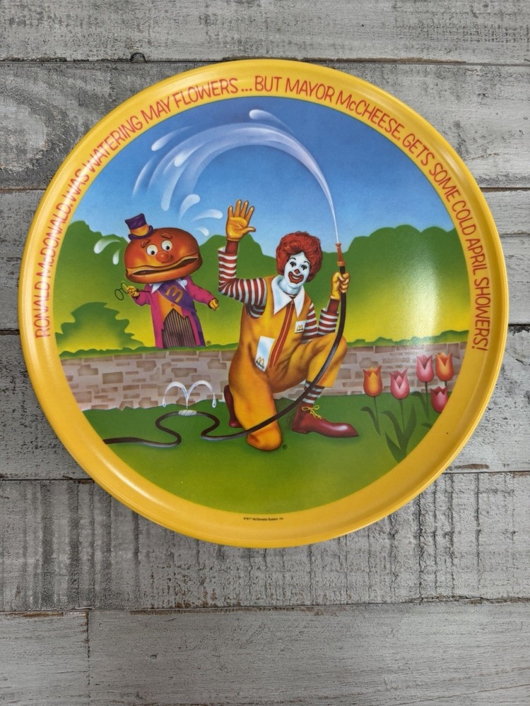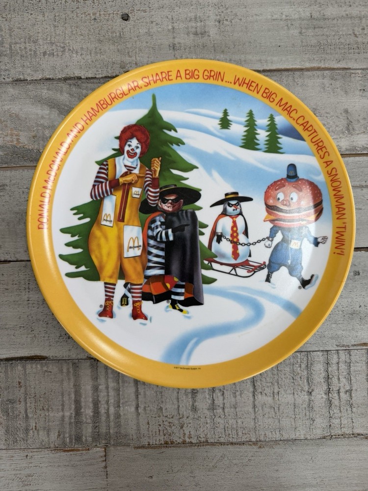 The product is a set of four 10" plastic plates featuring Ronald McDonald's character design, produced by McDonald's. The plates are multi-color and fall under the theme of restaurants & fast food collectibles. This vintage set is an original piece of advertising memorabilia from the fast-food giant, making it a unique and nostalgic addition to any collection.