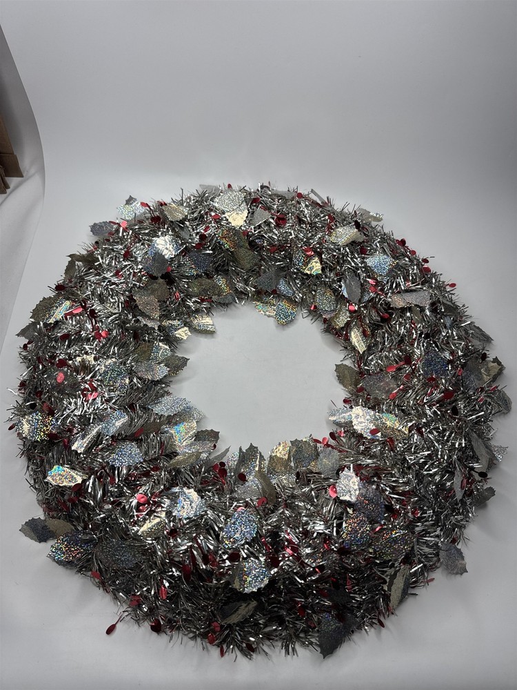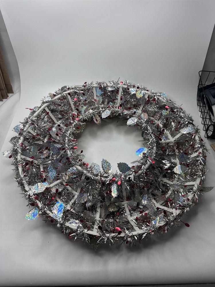VTG Silver Tinsel Foil Christmas Wreath 18" Holographic Holly Red Berry Decor