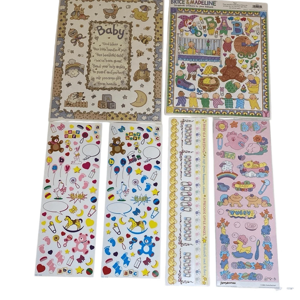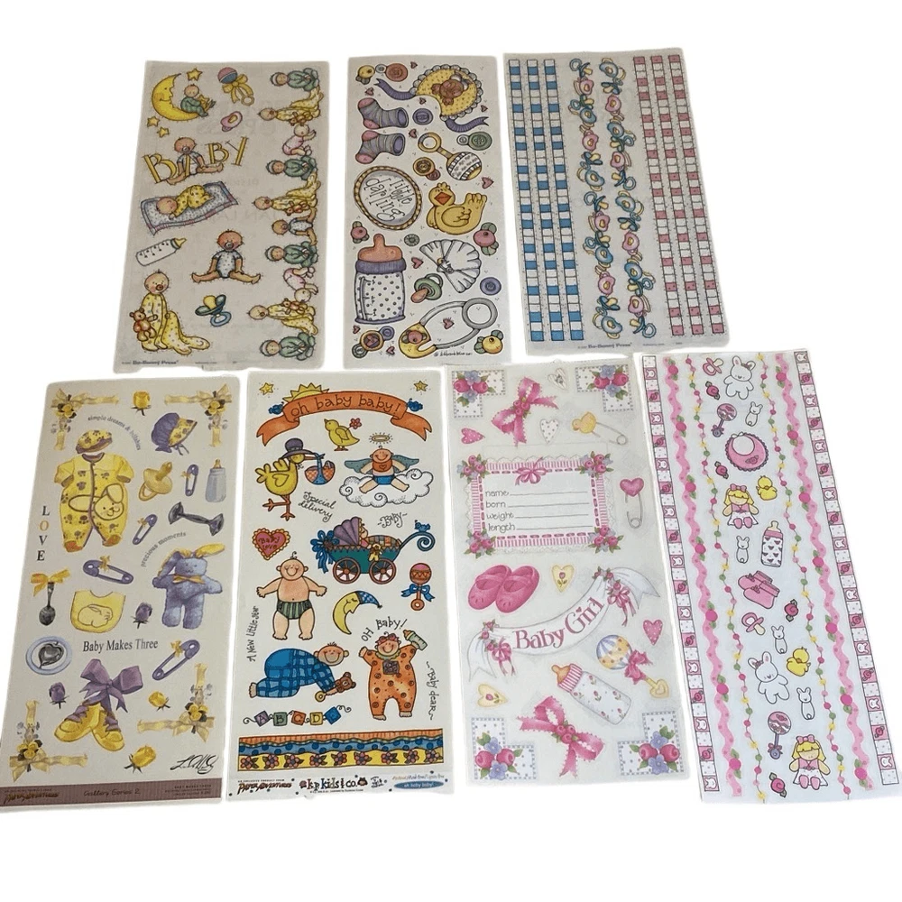 VTG Stickers Mix Lot 24 Sheets Baby Girl Boy Toys Scrapbooking Variety READ 24 sheets vintage baby theme stickers. Variety of brands and images. only 1 sheet is partial. Please see pictures.