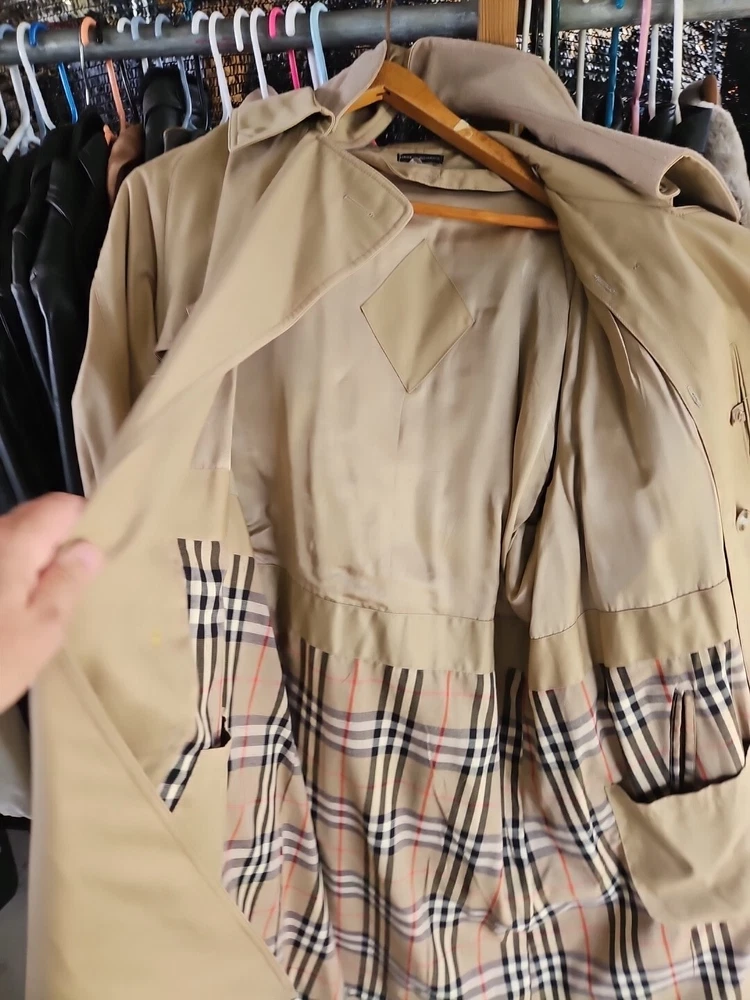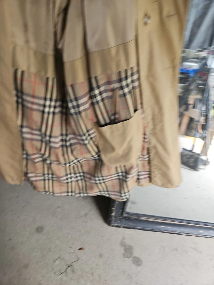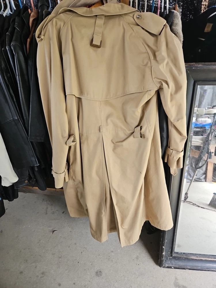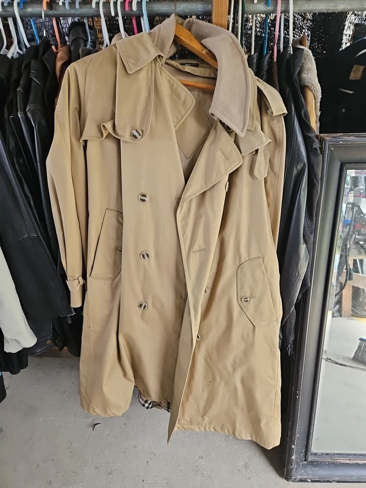 This vintage Stormport trench coat is a timeless classic for men who appreciate designer and French fashion. The coat features a cotton blend outer shell material with a gabardine fabric type and a beige check pattern. It has a button closure with a belt and Nova accents, and is lined with wool for added warmth during the winter, fall, and spring seasons. The coat has a regular fit and is available in size 44R for big and tall men. It also includes various features such as pockets, removable lining, and a hidden button-front closure. The Burberry Trench Coat model is part of the Burberrys' product line and is perfect for casual occasions and travel.