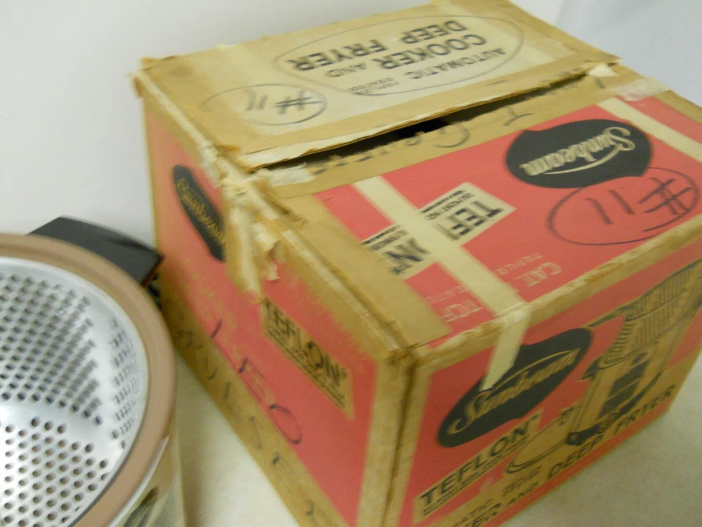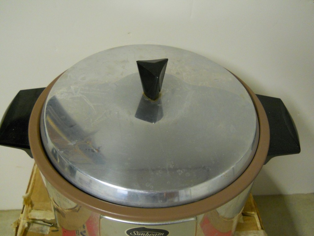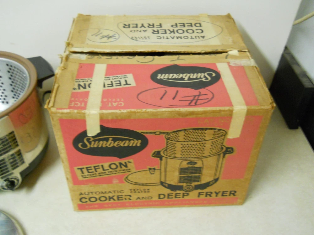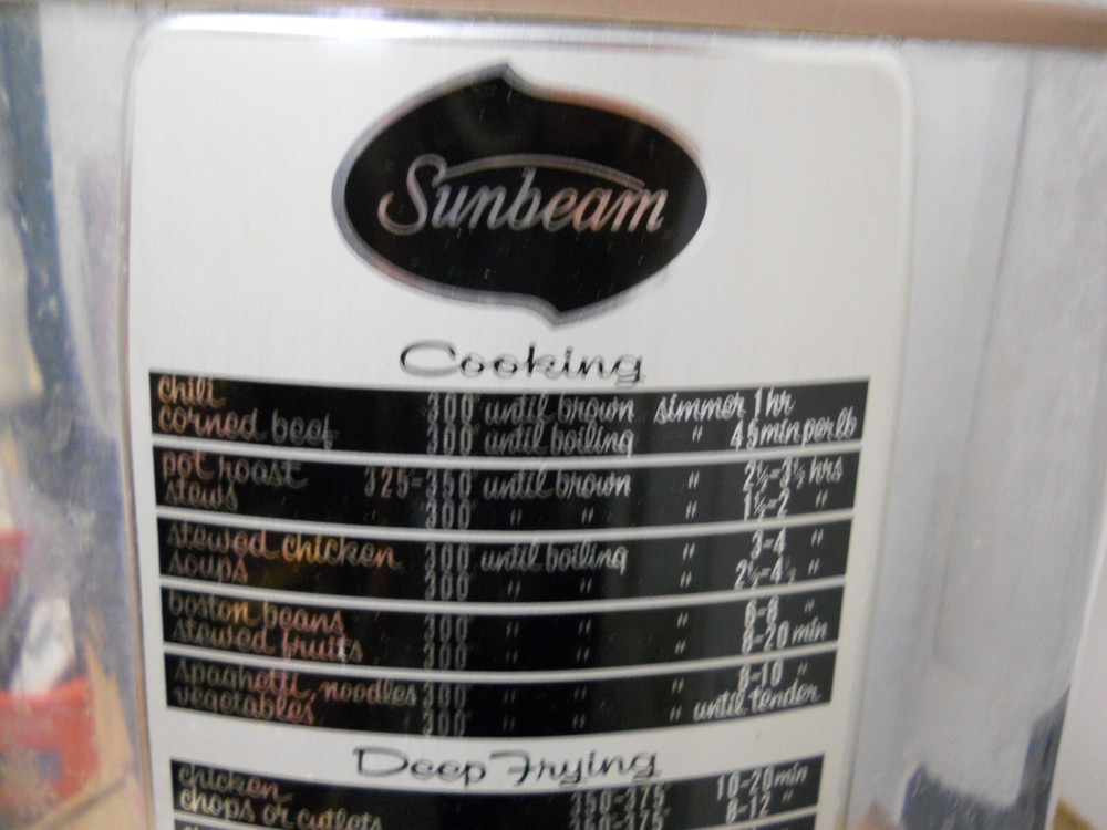 VTG Sunbeam Automatic Cooker & Deep Fryer w/ Strainer Basket Teflon Non Stick Pre-owned condition. Tested and works. Has some staining in the bottom and some wear to the bottom. Comes with strainer basket with handle. Come in original box. Box is damaged. Being sold as is. ****************************** PLEASE READ : I buy mostly estates, close outs, shelf pulls, and auction items. As the history of the item is not always known. I will describe all of my items listed to the best of my ability, if there are any flaws to the item it will be noted in the listing and photos of the flaw shown. At times I may miss a flaw, as I am only human. Please contact me and I will make it right and make sure that you are happy with you interaction and purchase from Big Man Tim's Treasures. Please see all photos and ask any qu estions BEFORE purchasing. FREE SHIPPING! Love this item? Check out the other items in my Ebay store! Please check back on a regular basis, as we list new items daily!! 030525EP warehouse