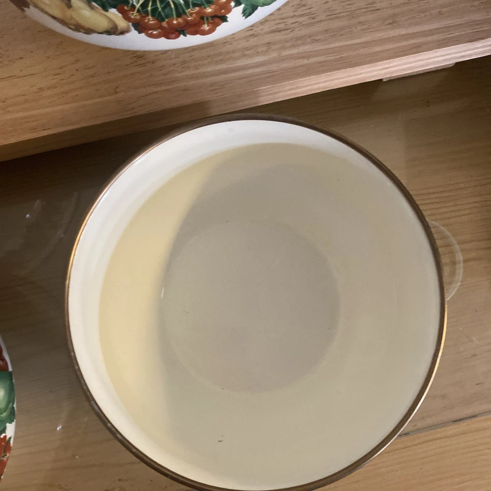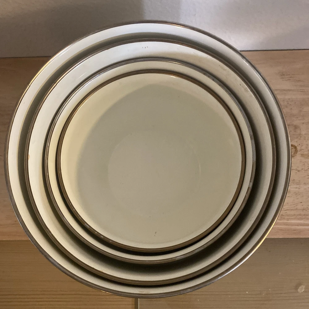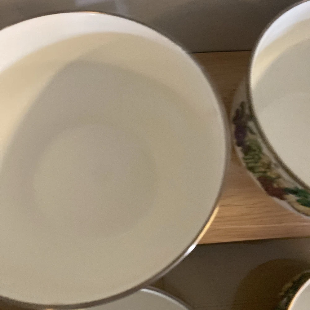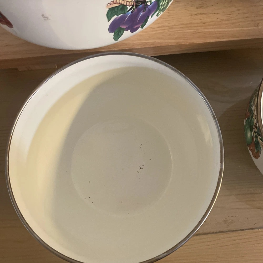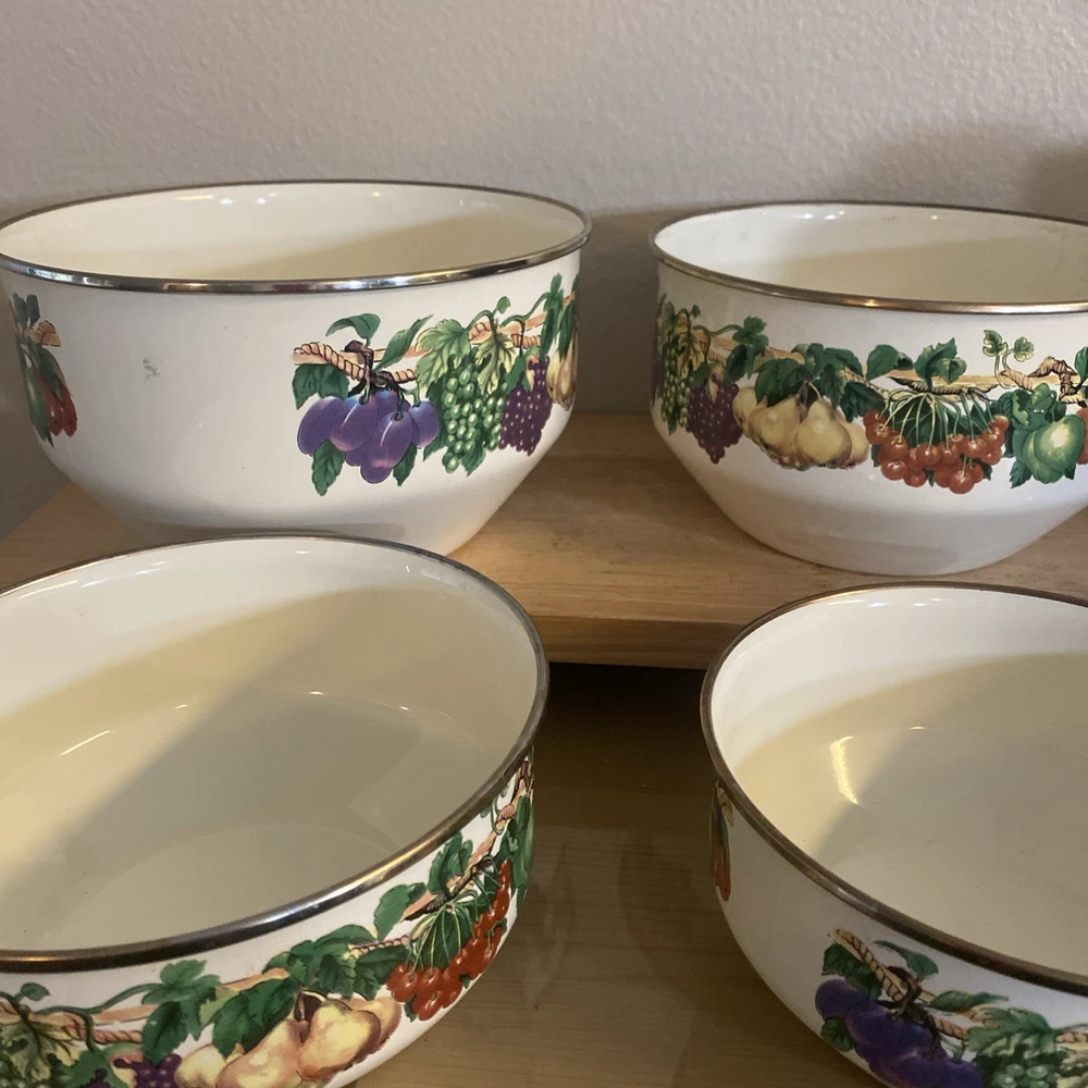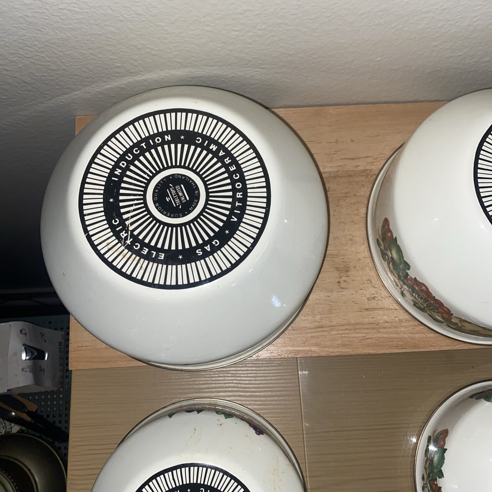 The VTG Tabletop Unlimited Vitroceramic Kensington Garden Bowls Set Of 4 is a vintage set of multicolor induction pans with a ceramic surface coating. These everyday induction pans are original and vary in capacity. Perfect for adding a touch of nostalgia to any kitchen, these bowls are designed for use on induction stoves and can add a whimsical touch to your cooking experience. Please look at photos - two of the bowls have silver rims the other two are goldish. Overall good condition see photos though for Minor imperfections