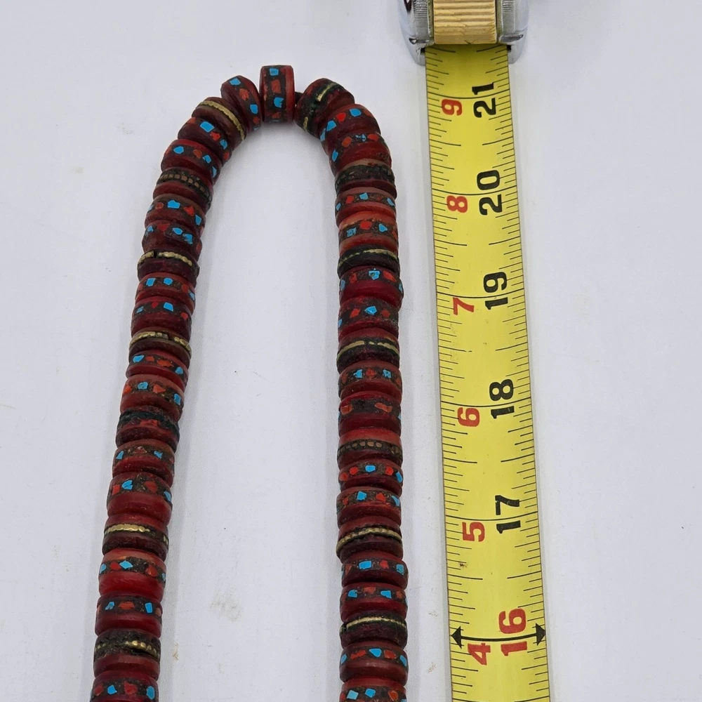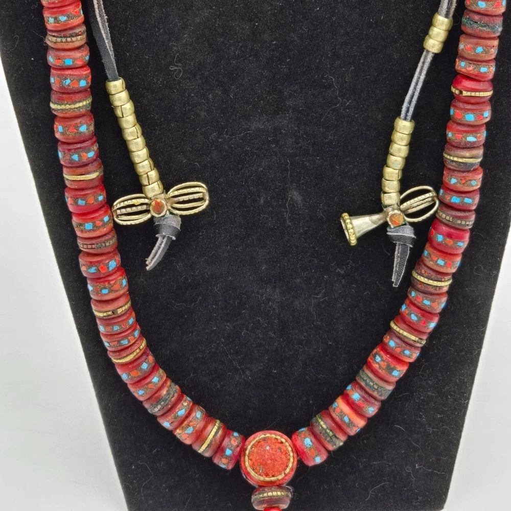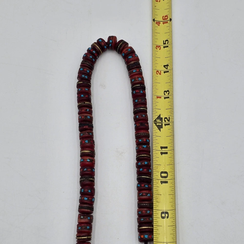 Handcrafted using traditional Tibetan techniques, this necklace features intricate beads with brass and turquoise accents. Ideal for adding an exotic touch to your ensemble. • Handmade craftsmanship • Brass and turquoise beads • Unique Tibetan design • Inlay brass and turquoise • Lightweight and comfortable Features: • Red Ones are a Rare Find! • Leather Cords • Two Brass Bell and Dorje Counters • 11-12mm Diameter Beads • Japa Mala Includes a Large, Guru Bead with Crushed Turquoise • Mala Prayer Beads, Inlay Accents • 36" Total Length Size: Unisex 30" Condition: Pre-Owned Good Good condition Gently used There's a small frayed cord attached to the bells, see pic 4 There may be some scratches due to normal use. Please read the description for further details and measurements, Thank you!