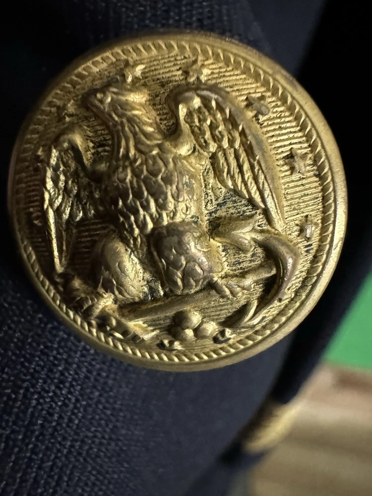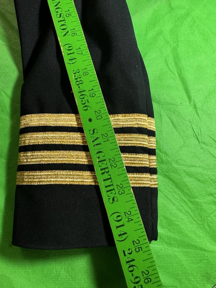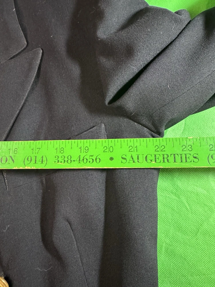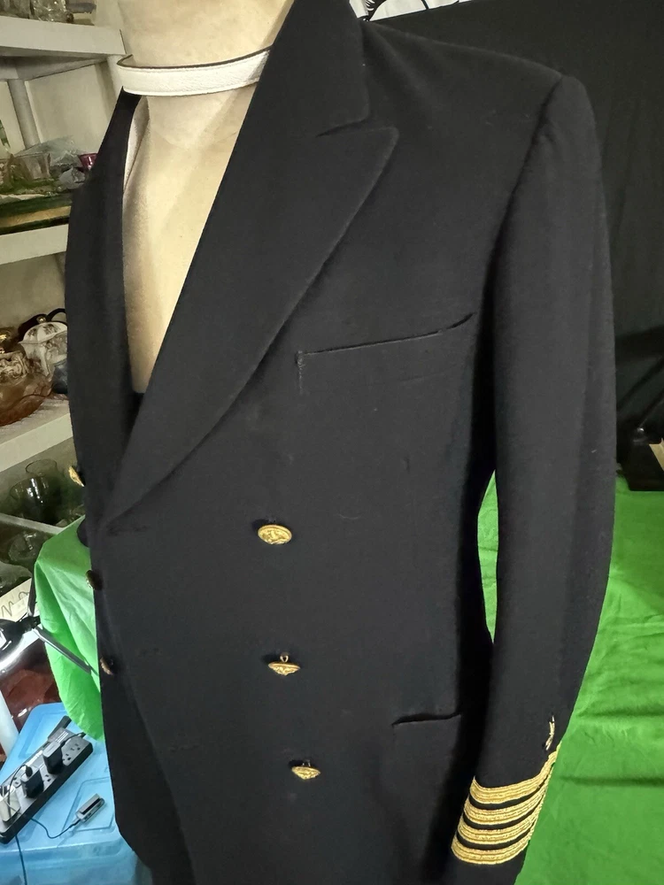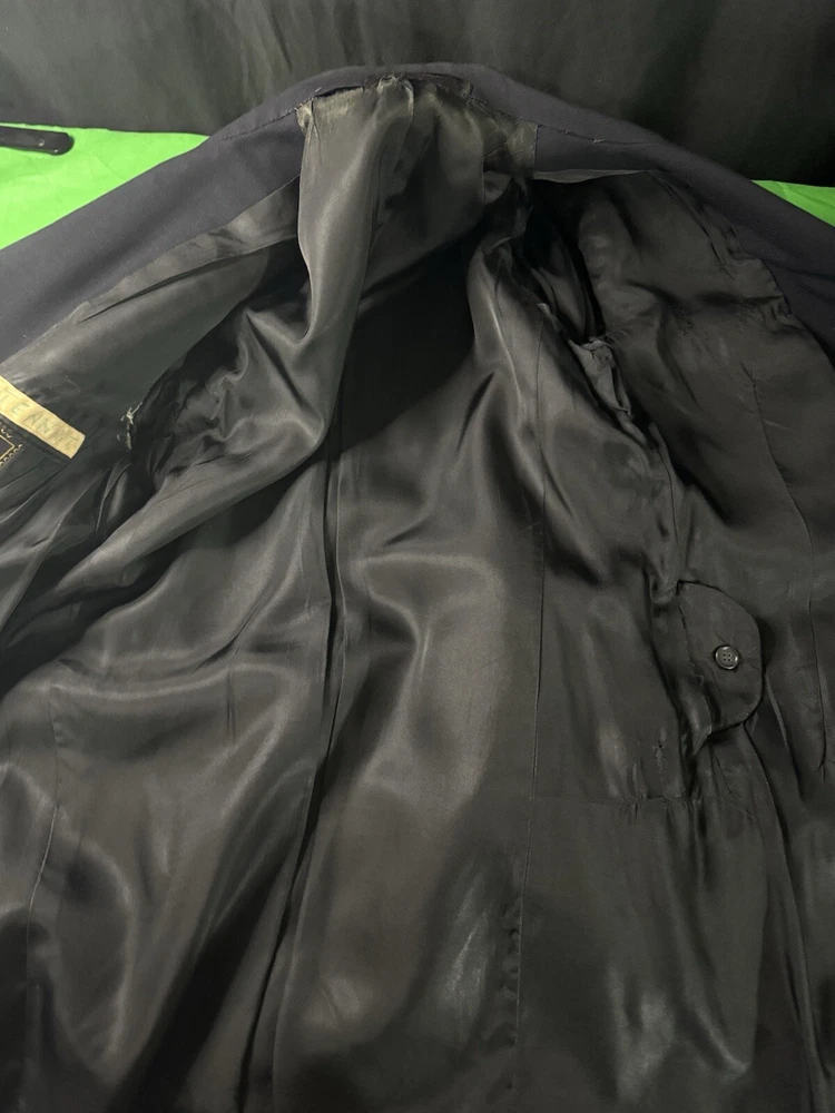 Vintage U.S. Navy Captain’s Dress Uniform – Double-Breasted Jacket & Pants – Rogers Peet Co. Description: This vintage U.S. Navy officer’s uniform includes a double-breasted dress jacket and matching pants, tailored by the esteemed Rogers Peet Company of New York and Boston. The jacket features four gold sleeve stripes and a star, indicating the rank of Captain (O-6), as well as gold eagle buttons. A rare and collectible piece, perfect for military collectors, historical reenactments, or classic menswear enthusiasts. Details: • Era: Likely mid-20th century • Brand: Rogers Peet Company • Rank: Captain (O-6) – Four gold sleeve stripes with a star • Jacket Features: • Double-breasted design • Gold U.S. Navy eagle buttons • Peak lapels • Fully lined interior • Name tag sewn inside (partially faded) • Pants: Matching navy blue trousers included Condition: • Pre-owned vintage condition with some expected wear (please review photos). • Fabric is well-preserved, but minor signs of aging may be present. Shipping & Returns: • Ships within 1-2 business days • No returns, so please review all photos and ask any questions before purchasing. ⚓ A stunning and historic U.S. Navy officer’s uniform, perfect for collectors or display! ⚓