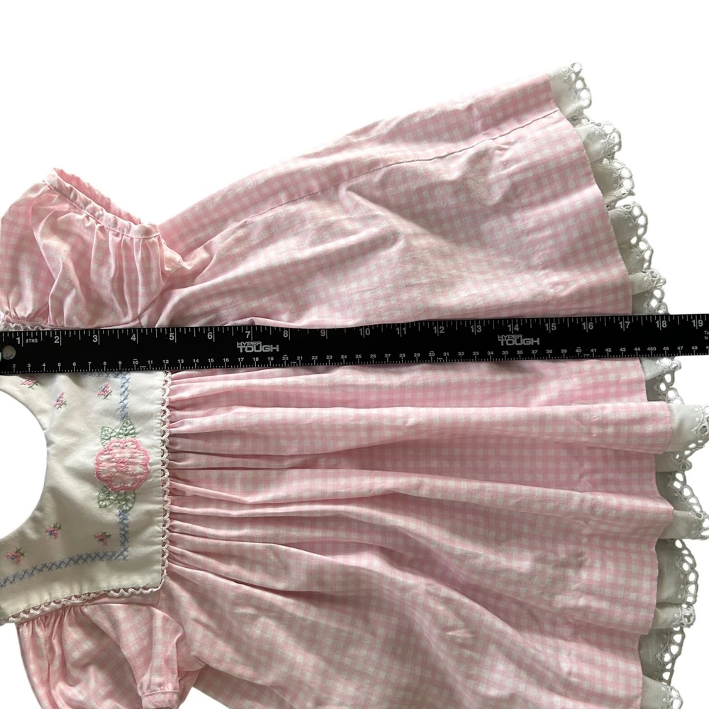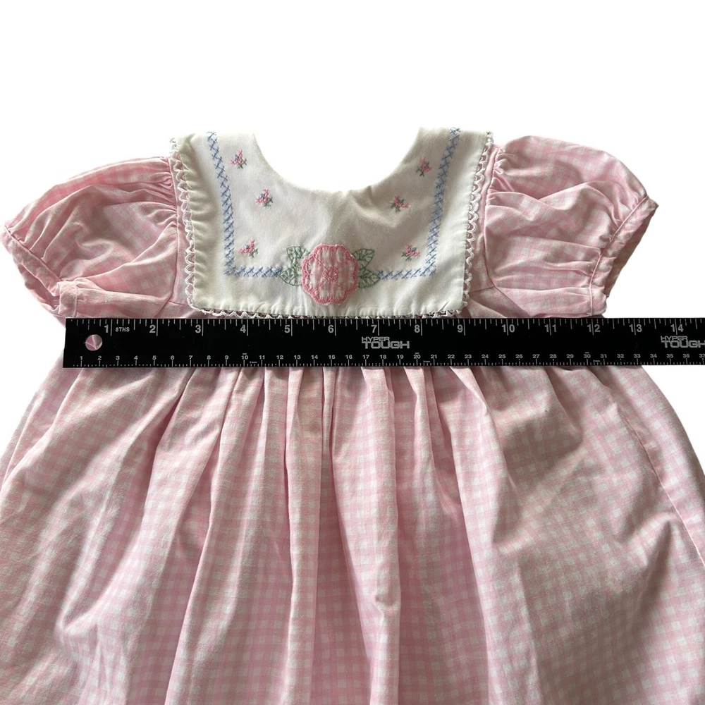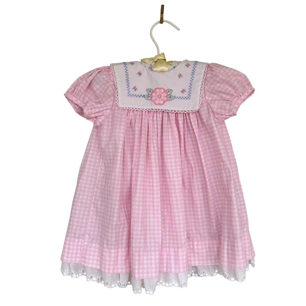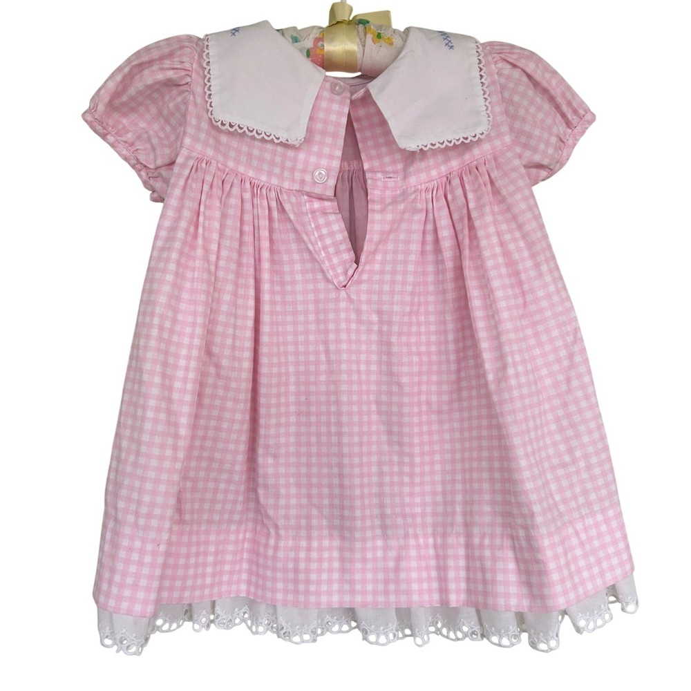 Adorable pink gingham dress for baby girls. Features a white Peter Pan collar adorned with delicate pink flower embroidery and blue cross-stitch detailing. The dress has short puff sleeves, a smocked yoke, and a ruffled hem with white eyelet lace trim. Perfect for everyday wear, parties, or special occasions. Measurements: • Chest: 13 in • Length: 18 in Style: Sundress Dress Length: Knee Length Department: Girls Sleeve Length: Short Sleeve Occasion: Casual, Party Fabric Type: Woven Pattern: Gingham Season: Spring, Summer Material: Cotton Neckline: Collared Sleeve Type: Cap Sleeve Closure: Button Accents: Embroidered, Lace Features: Empire Waist Keywords: baby girl dress, gingham dress, embroidered collar, smocked dress, eyelet lace, puff sleeve, Easter dress, birthday outfit, vintage style, spring dress, summer dress, baby shower gift All items come from a smoke free, golden retriever dog friendly home. All of items unless NWT or Dry Clean Only are washed with Tide or according to care tag if hand wash only. We try our best to disclose any flaws with items, if we miss something please reach out and let us know. We can offer combined shipping on all our items. Please compare the items measurements to something you already own. We ship M-F within business days.