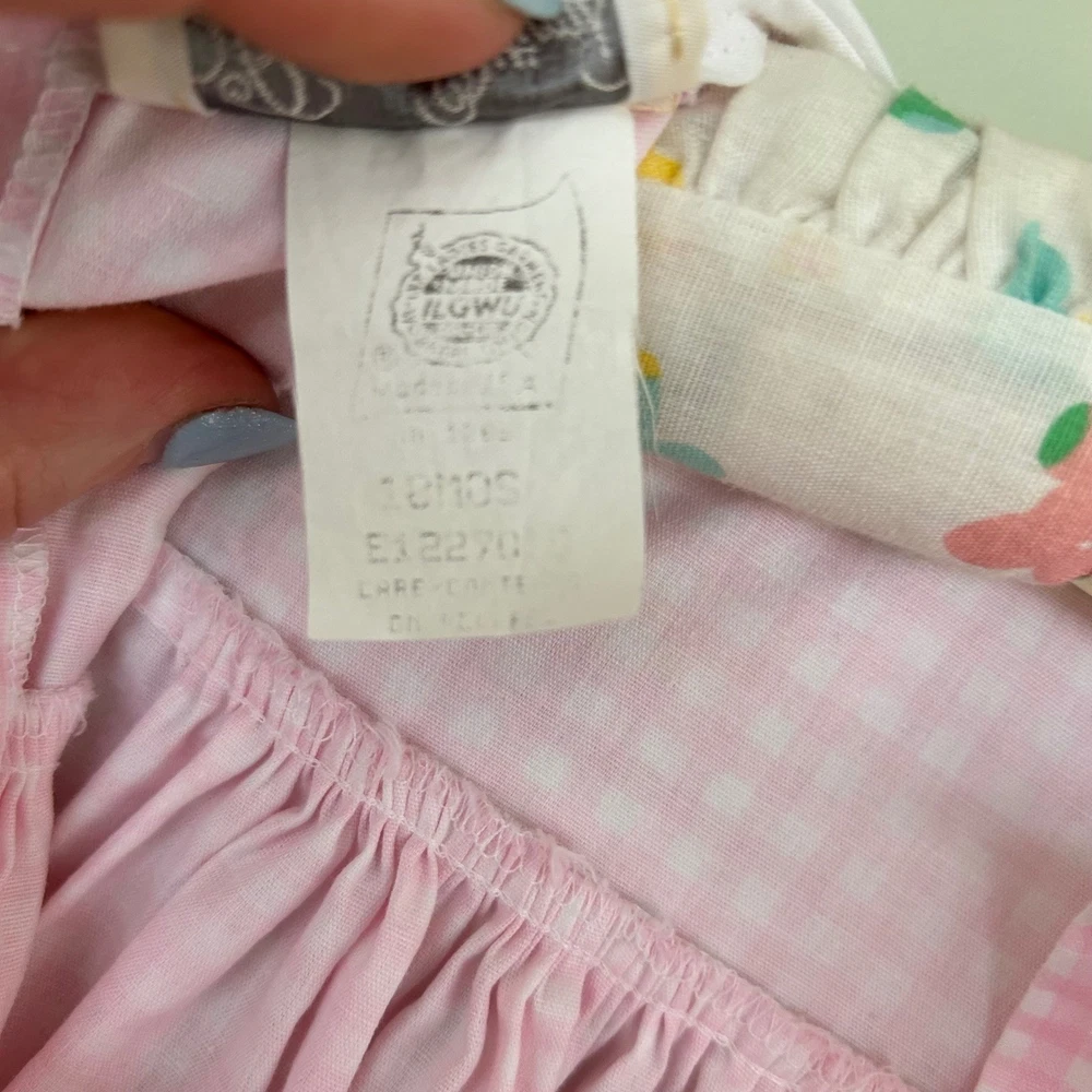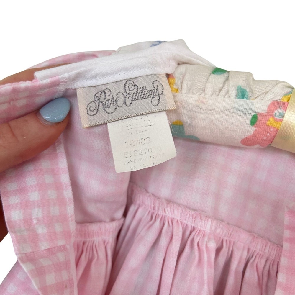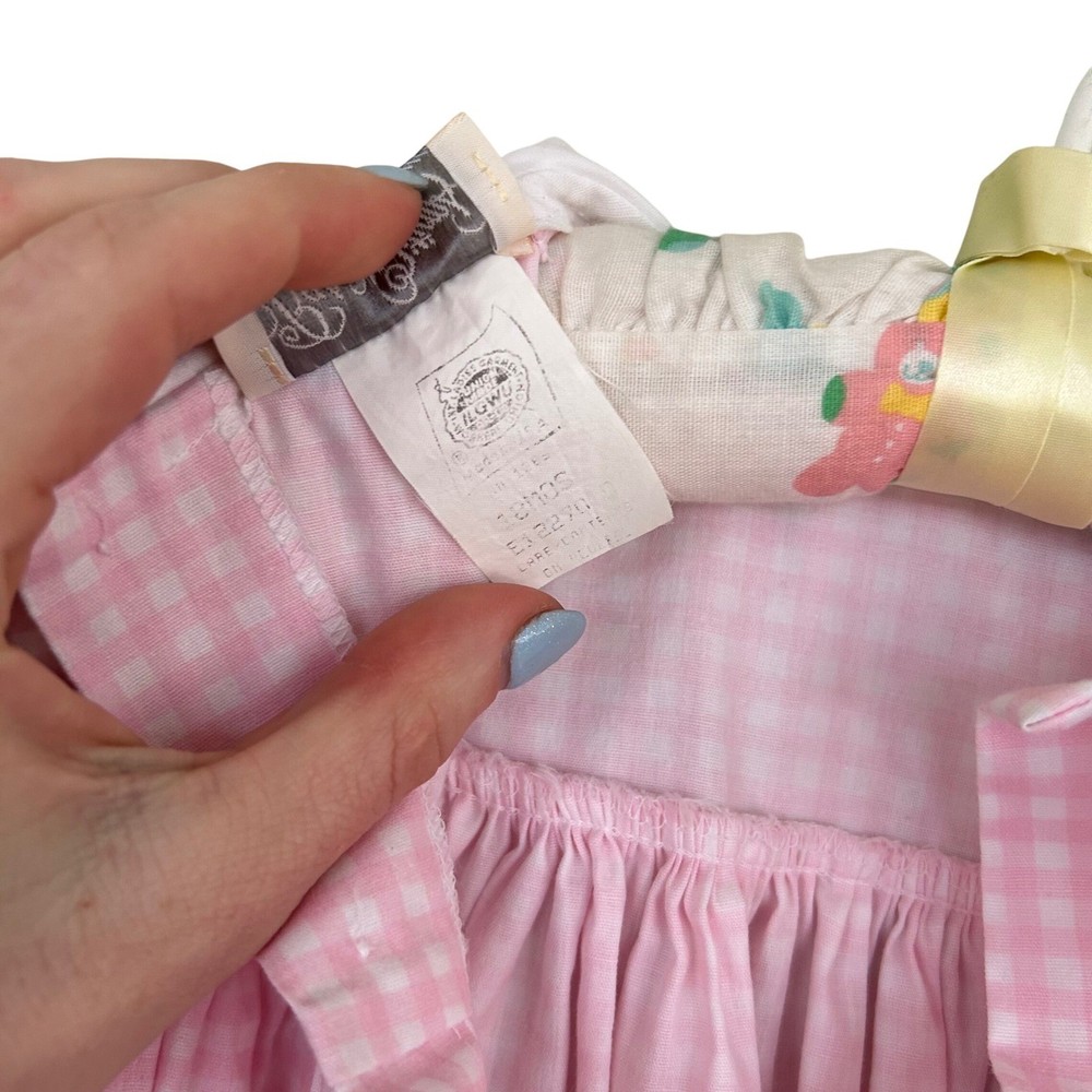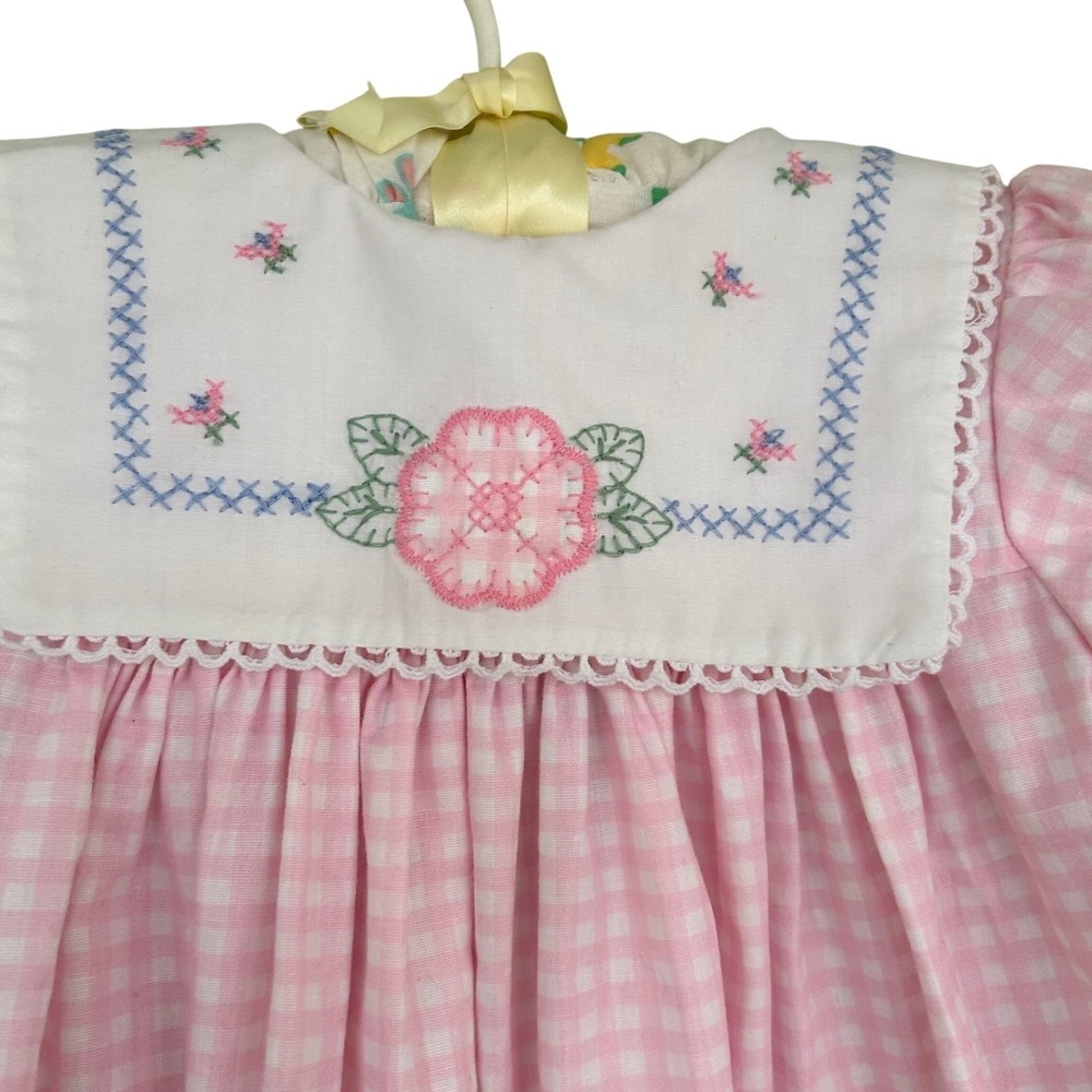 Adorable pink gingham dress for baby girls. Features a white Peter Pan collar adorned with delicate pink flower embroidery and blue cross-stitch detailing. The dress has short puff sleeves, a smocked yoke, and a ruffled hem with white eyelet lace trim. Perfect for everyday wear, parties, or special occasions. Measurements: • Chest: 13 in • Length: 18 in Style: Sundress Dress Length: Knee Length Department: Girls Sleeve Length: Short Sleeve Occasion: Casual, Party Fabric Type: Woven Pattern: Gingham Season: Spring, Summer Material: Cotton Neckline: Collared Sleeve Type: Cap Sleeve Closure: Button Accents: Embroidered, Lace Features: Empire Waist Keywords: baby girl dress, gingham dress, embroidered collar, smocked dress, eyelet lace, puff sleeve, Easter dress, birthday outfit, vintage style, spring dress, summer dress, baby shower gift All items come from a smoke free, golden retriever dog friendly home. All of items unless NWT or Dry Clean Only are washed with Tide or according to care tag if hand wash only. We try our best to disclose any flaws with items, if we miss something please reach out and let us know. We can offer combined shipping on all our items. Please compare the items measurements to something you already own. We ship M-F within business days.