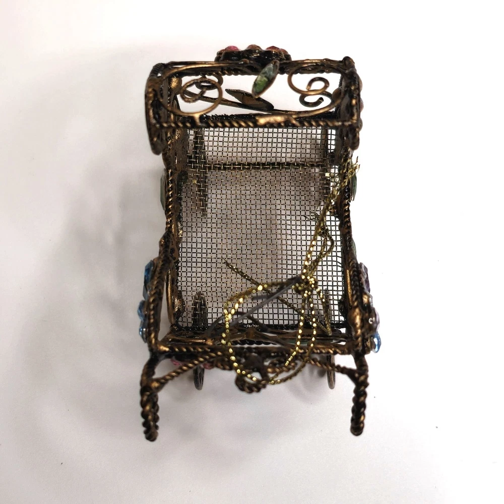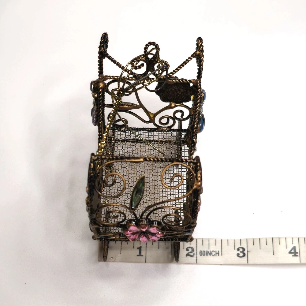 This intricately designed retro baby carriage features ornate floral and rhinestone accents, making it an exquisite decorative piece. Its unique craftsmanship and antique finish offer a touch of elegance and charm to any collection or decor setting. • Ornate metal wiring • Floral and rhinestone accents • Ornate craftsmanship • Antique style decorative piece • Unique design Features: • Hanging Ornament, Ornate Wire Details Size: 3" x 4" Condition: Pre-Owned Good Good condition Gently used Please be sure review all photos and description closely before purchasing, thank you! Smoke free work space Please read the description for further details and measurements, Thank you!