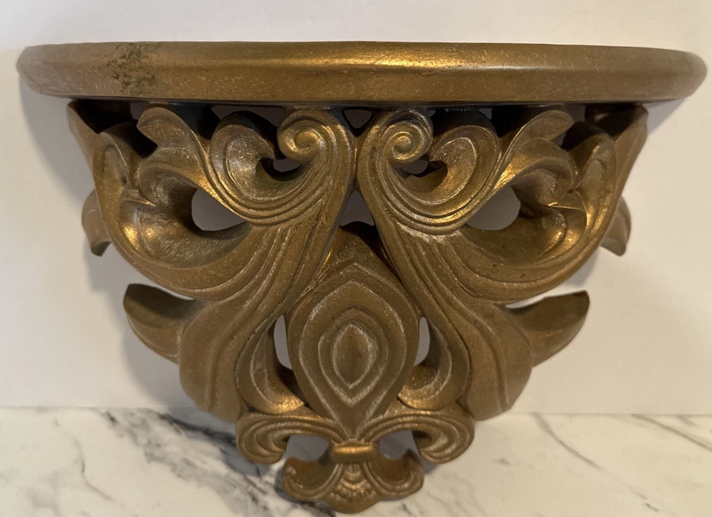 VTG Wall Shelf Gold Color Painted 12” Old World Victorian Plastic Home Interior Pre-Owned vintage 70’s. Has some minor blemishes as shown in photos. See all photos for best representation & for measurements. Thank you for looking and supporting my small business!