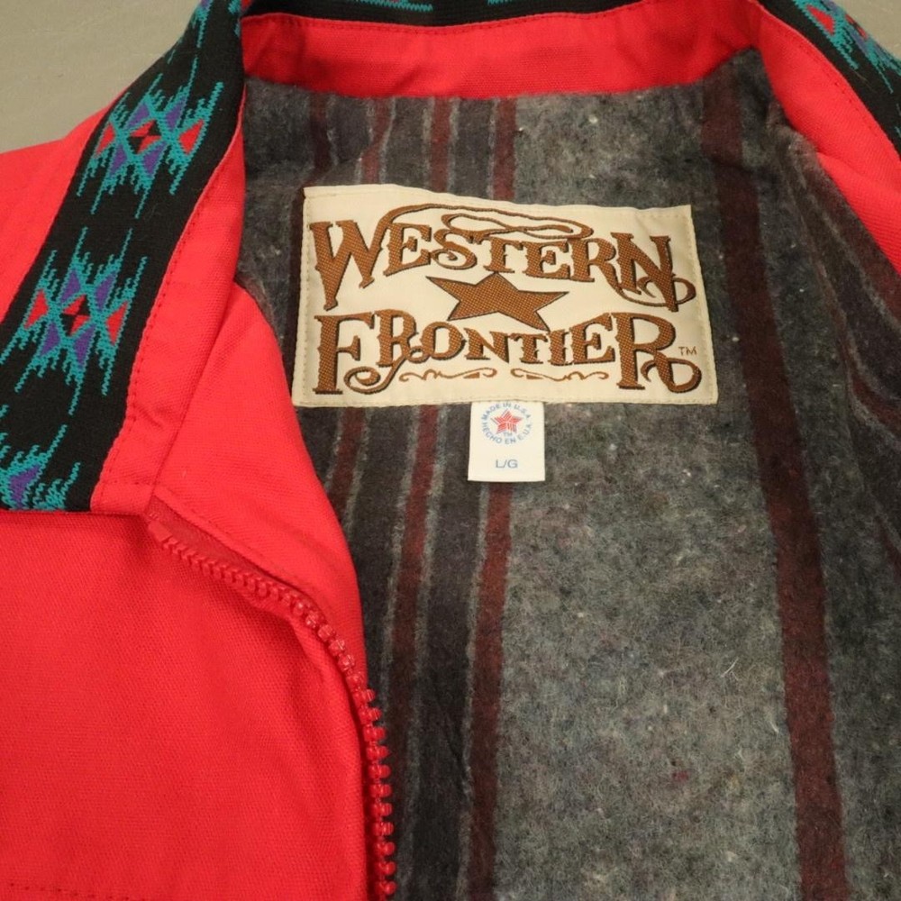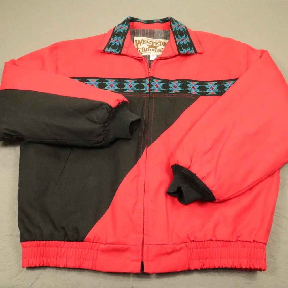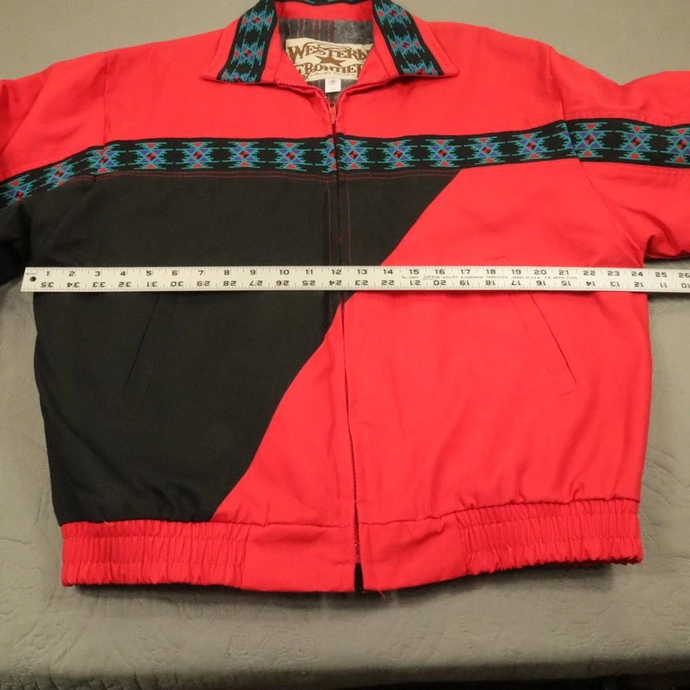 Brand: Western Frontier Style: Mens Western bomber jacket with full zip front, elastic waistband and cuffs, and front welt hand pockets. Color: Red and black colorblock canvas shell with teal and purple geometric trim across chest, sleeves, and collar. Logos/Branding: Western Frontier woven label at inner neck; coordinating geometric jacquard trim provides classic Western motif. Size on tag: Mens Large (L/G). Material: Cotton blend canvas outer shell with wool blanket lining and wool insulation. Country of origin: Made in U.S.A.