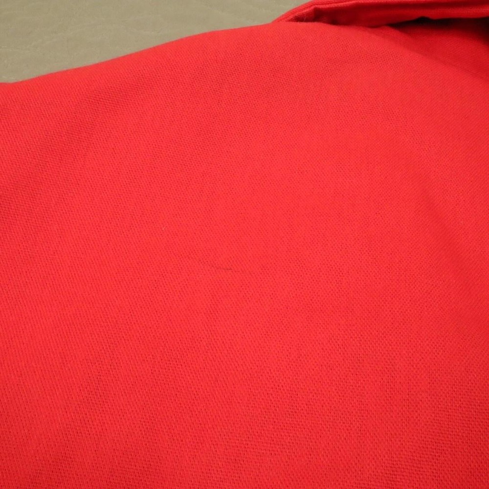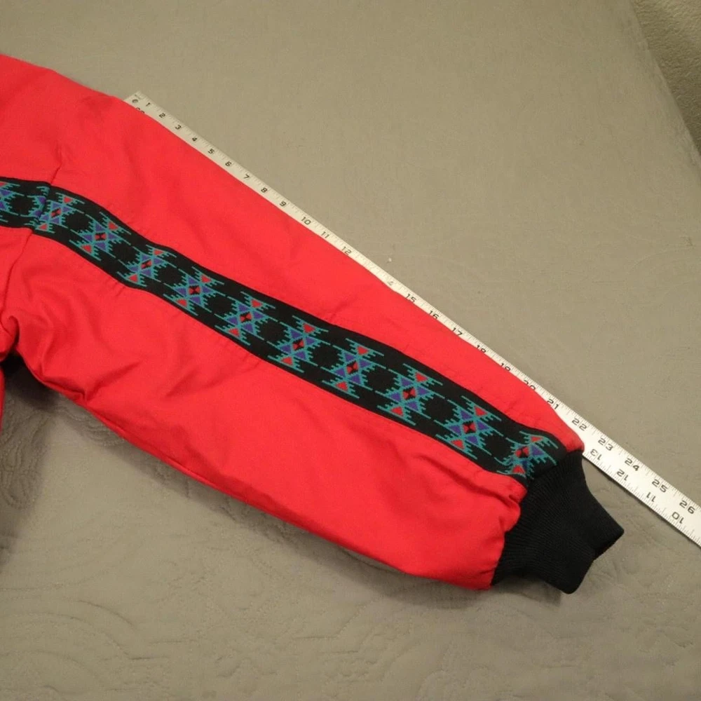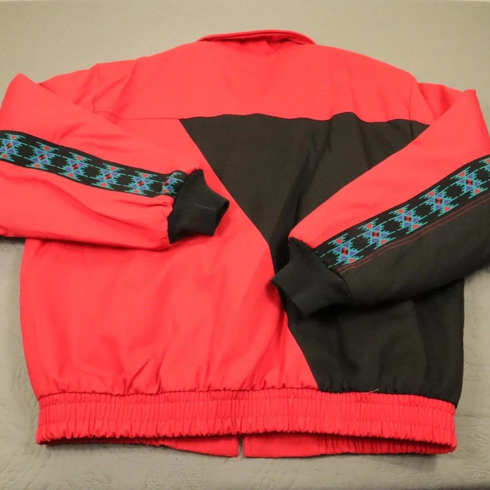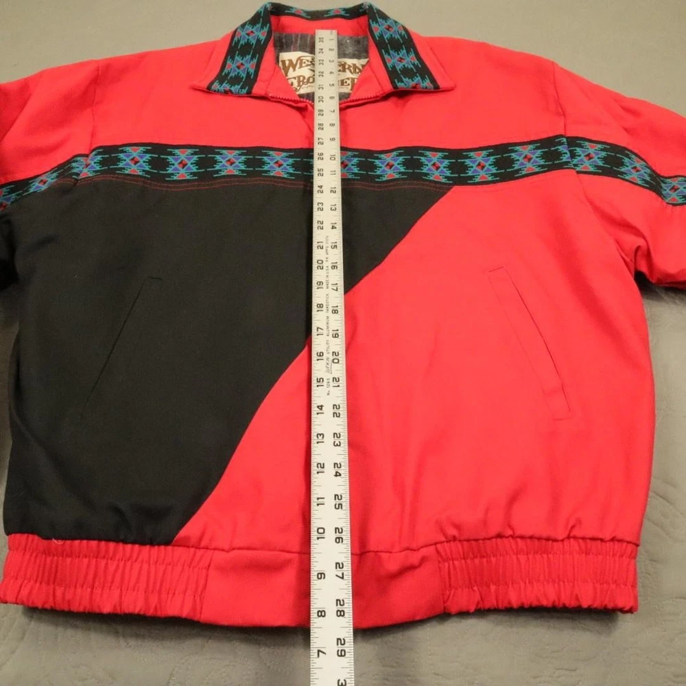 Brand: Western Frontier Style: Mens Western bomber jacket with full zip front, elastic waistband and cuffs, and front welt hand pockets. Color: Red and black colorblock canvas shell with teal and purple geometric trim across chest, sleeves, and collar. Logos/Branding: Western Frontier woven label at inner neck; coordinating geometric jacquard trim provides classic Western motif. Size on tag: Mens Large (L/G). Material: Cotton blend canvas outer shell with wool blanket lining and wool insulation. Country of origin: Made in U.S.A.