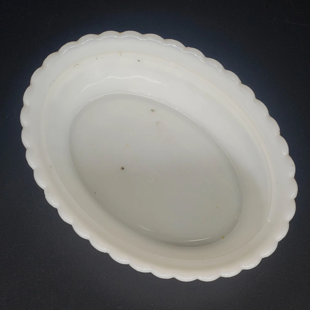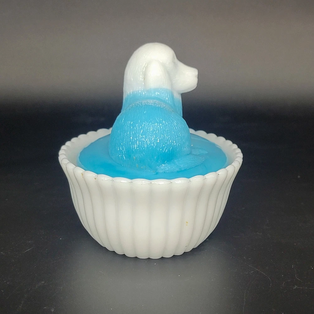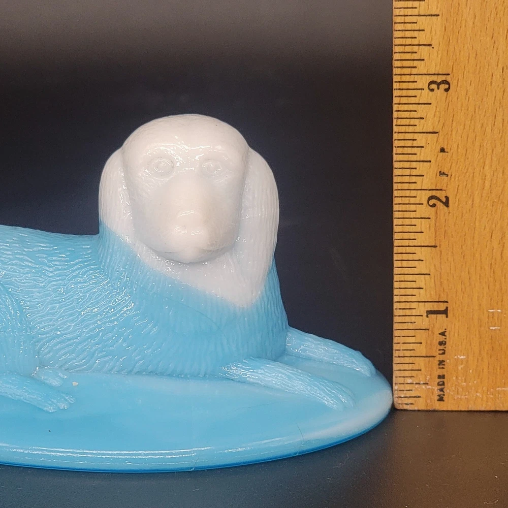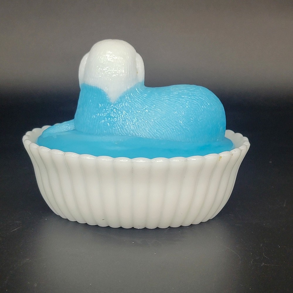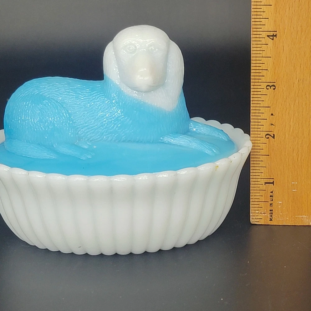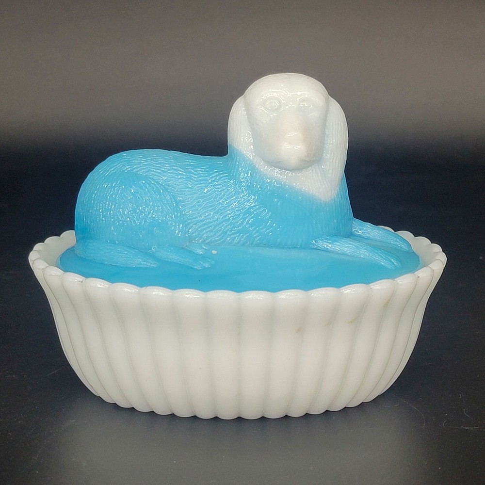 Vintage Westmoreland milk glass covered dish showcases a nicely-marked dog motif. The charming oval-shaped piece, measuring 5.25 inches in length and 4-1/8 inches in height, features a slag glass design in a serene shade of blue, complemented by a vertical rib base that adds a touch of elegance. The lid is inscribed with the number "4" and the dish with the number "5". This decorative candy dish or trinket box originated in the United States, and is a testament to the timeless craftsmanship of the Westmoreland brand.