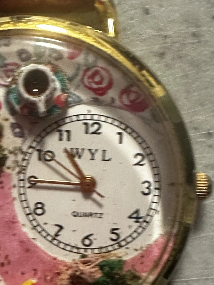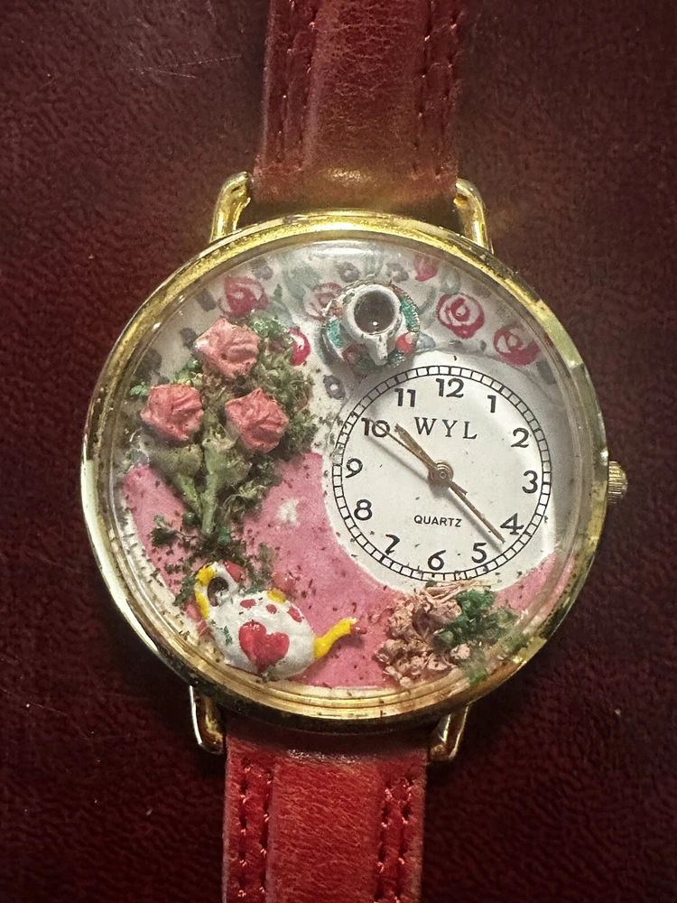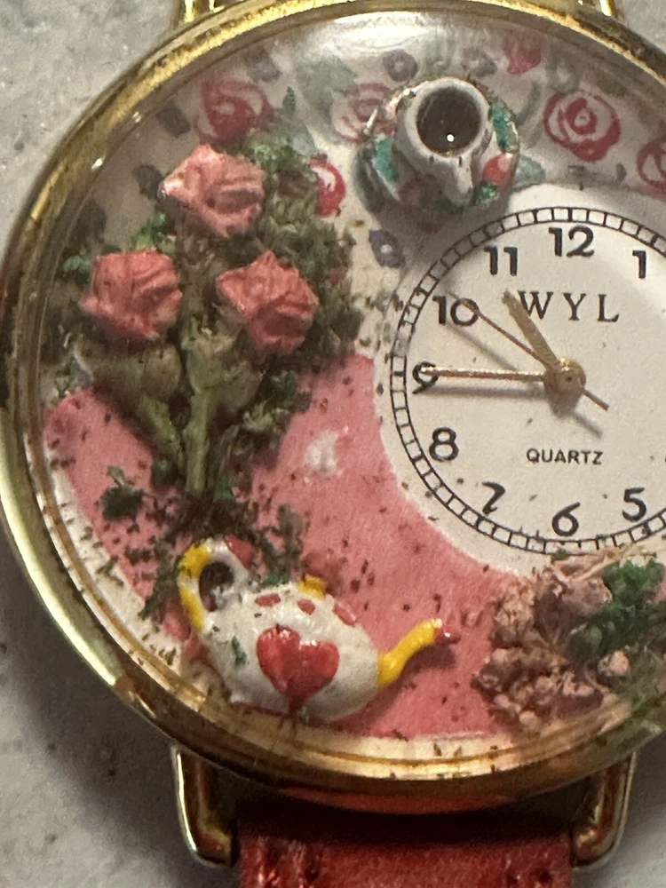 This vintage Whimsical Watches teapot and cup set is a unique addition to any watch collection. The silver case color and pink band material make it a stylish accessory for women. It features a Japanese quartz movement, buckle closure, and a round watch shape. The watch is water-resistant, has acrylic crystal, and a seconds hand, along with a 12-hour dial. The push/pull crown allows for easy adjustment, and it comes with features like a food & drink theme, handmade design, and no papers or service records. This casual wristwatch is perfect for everyday wear and is a must-have for watch enthusiasts.