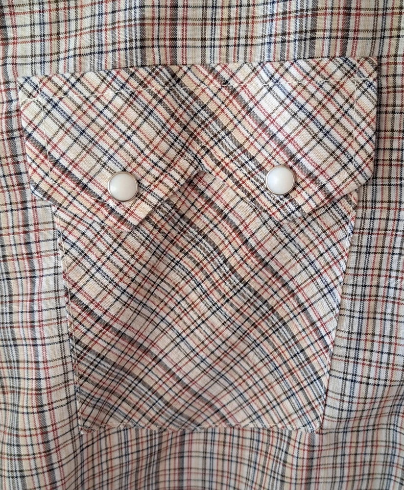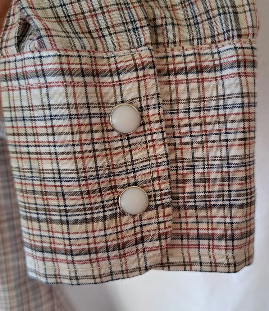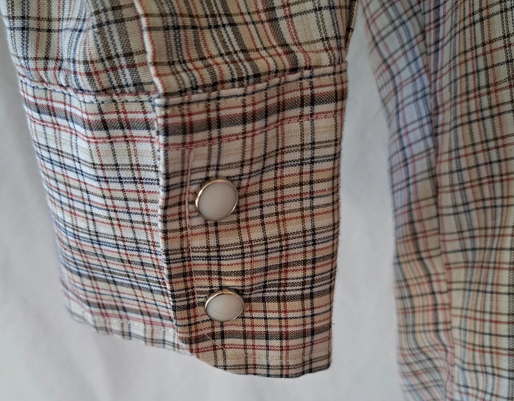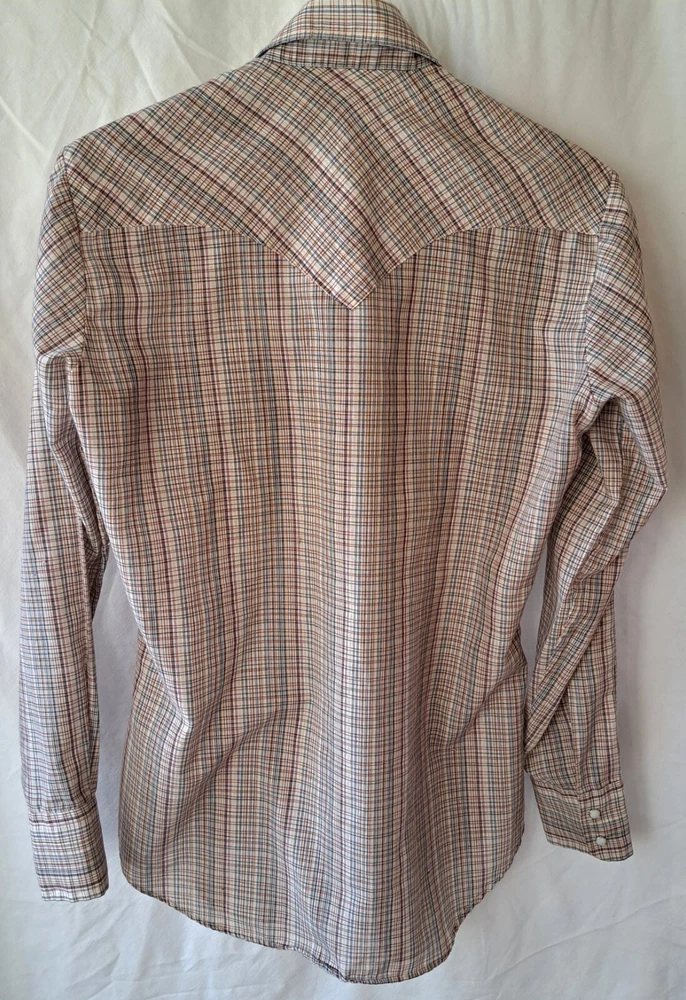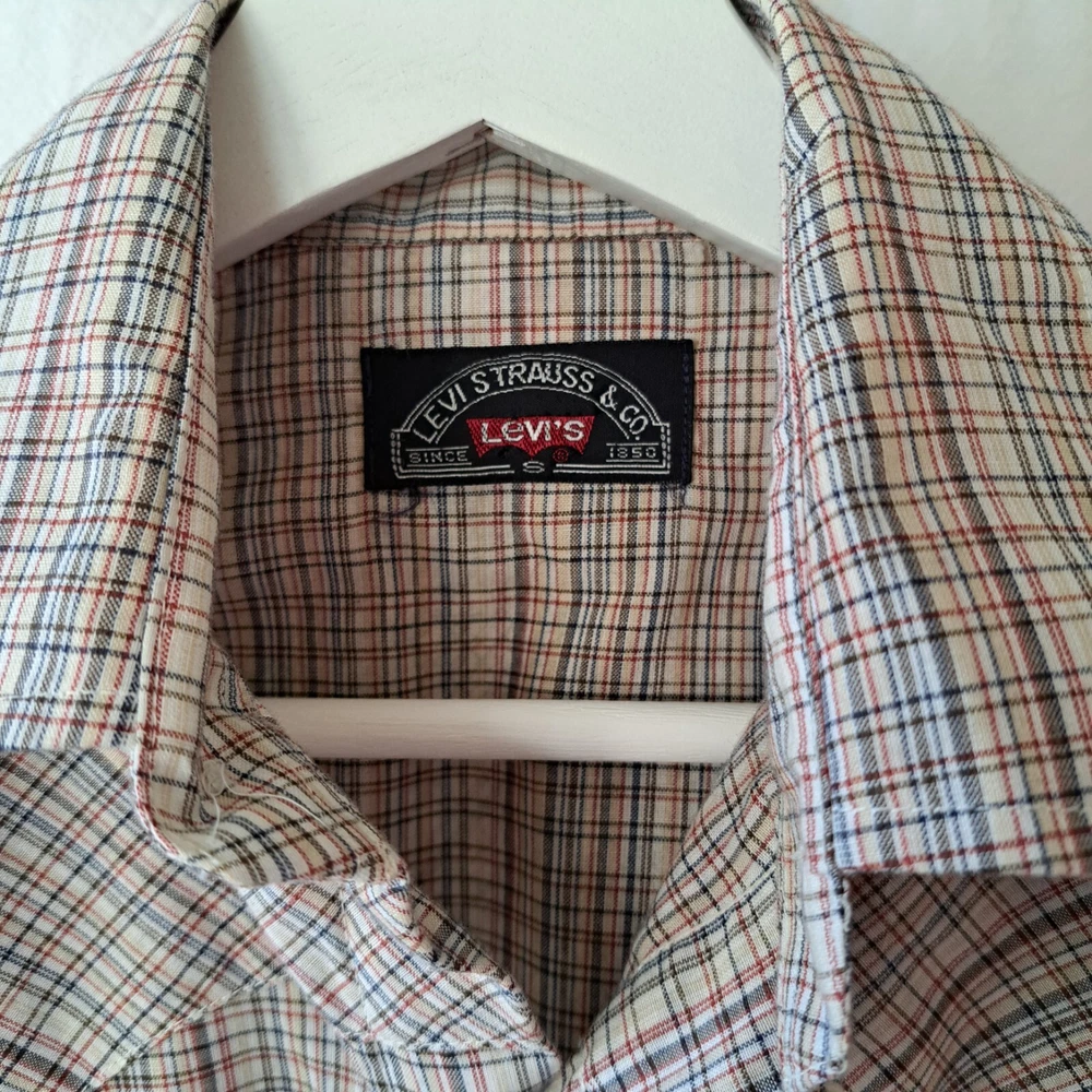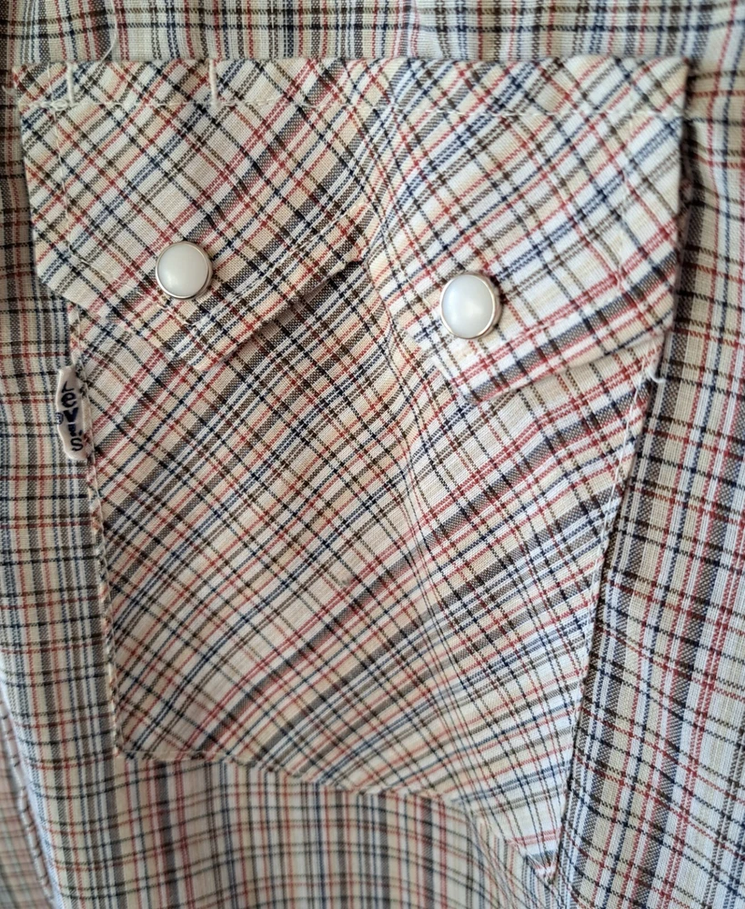 Vintage White Label Levi’s Shirt Men's Small Beige Pearl Snap Western Plaid Sawtooth 70s Excellent condition - no holes or stains Very lightweight material Chest (pit to pit): 19in Shoulders: 15.5in Sleeves: 23.5in Length from shoulder to bottom hem (in): 27 Please reach out with any questions Returns allowed within 30 days of purchase but buyer must pay for return shipping.