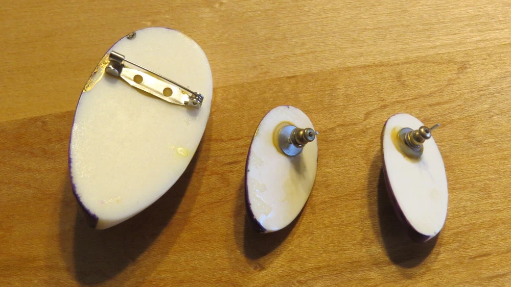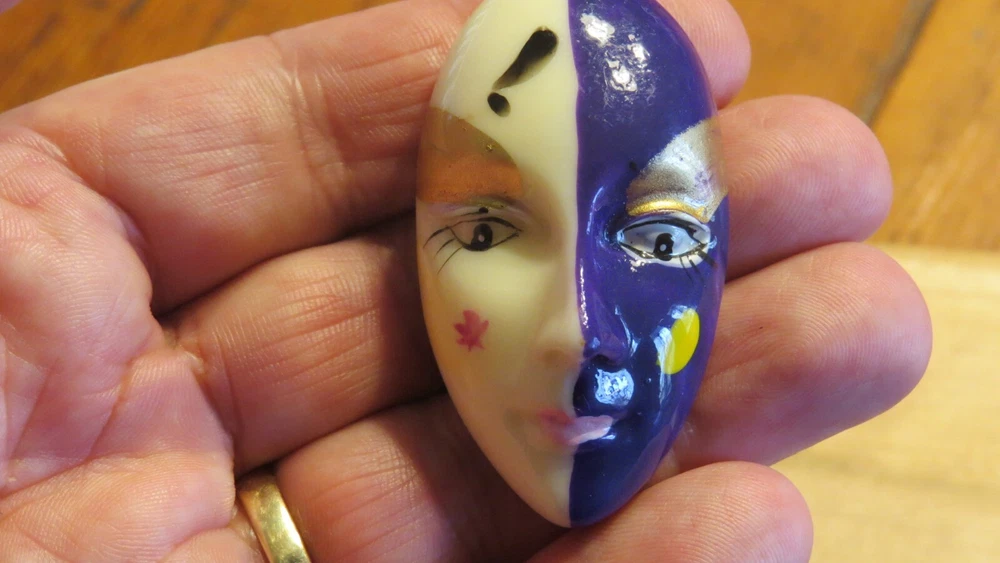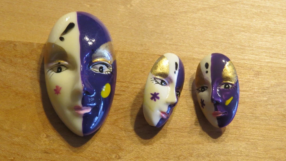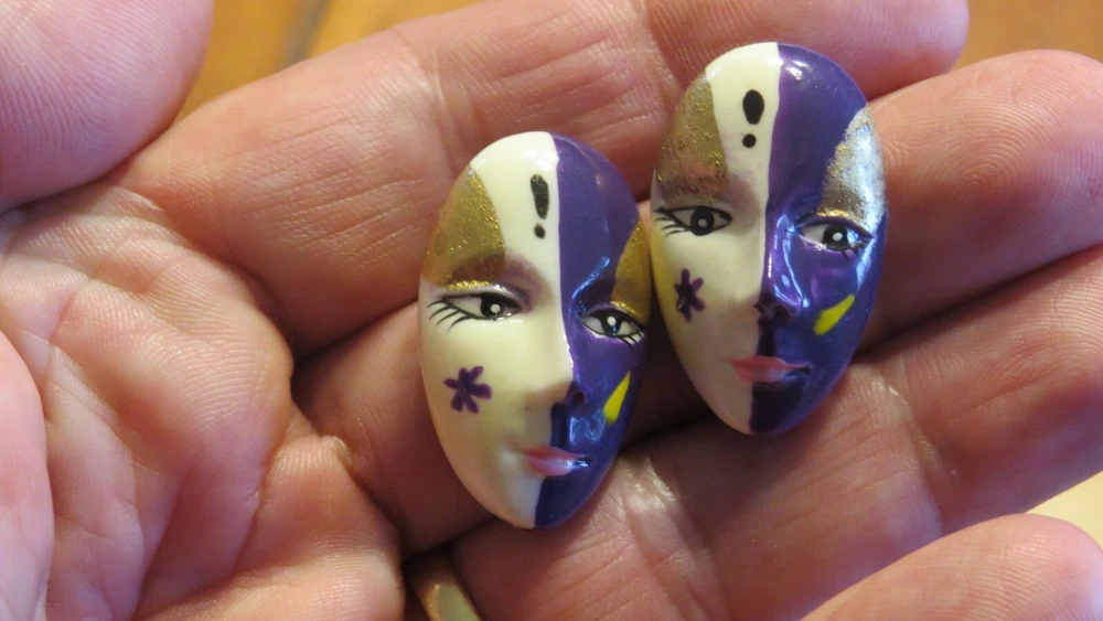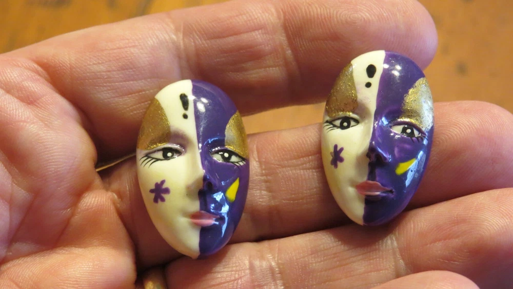 Capture the essence of the Big Easy with these matching set of vintage women's earrings and brooch featuring a hand-painted 3D Mardi Gras mask design. Each piece showcases a vibrant multicolored palette with the earrings styled as studs and the brooch designed as an oval shape both crafted from enamel and lucite for a unique texture and finish. These pieces are a celebration of art and festivity, unbranded and unsigned, offering an exclusive touch to your jewelry collection. The broach measures 2.25" in length x 1 1/4" in width. The earrings measure 1 1/4" x 3/4". Whether you're a lover of vintage jewelry, Mardi Gras, or New Orleans, this set is a charming addition to your collection. These earrings and broach are in excellent condition. They are beautifully painted with purple, black, white, pink and gold colors. There are no issues with these pieces. Thanks for looking...........