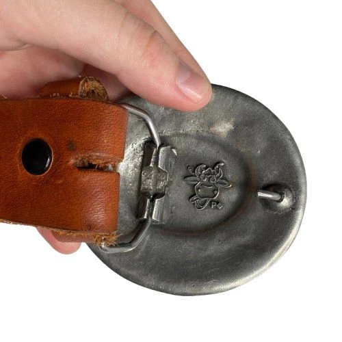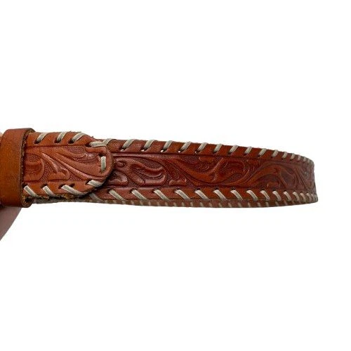 Very Good Pre-Owned Condition (see pics for details). Stunning leather belt featuring an eye-catching oval buckle adorned with faux turquoise stones in a flower-like pattern. The rich brown leather strap showcases beautiful tooled detailing and whipstitched edges. Perfect for festival outfits, western wear, or adding a bohemian touch to everyday looks. Keywords: turquoise belt, western belt, leather belt, boho belt, cowgirl belt, tooled leather, stone buckle, southwestern style, bohemian accessories, western fashion, turquoise buckle, whipstitched belt Size 34 Approximately 38.5" long (without buckle) Please compare measurements to something you already own to verify size and fit We are happy to answer any questions! We ship the next business day!