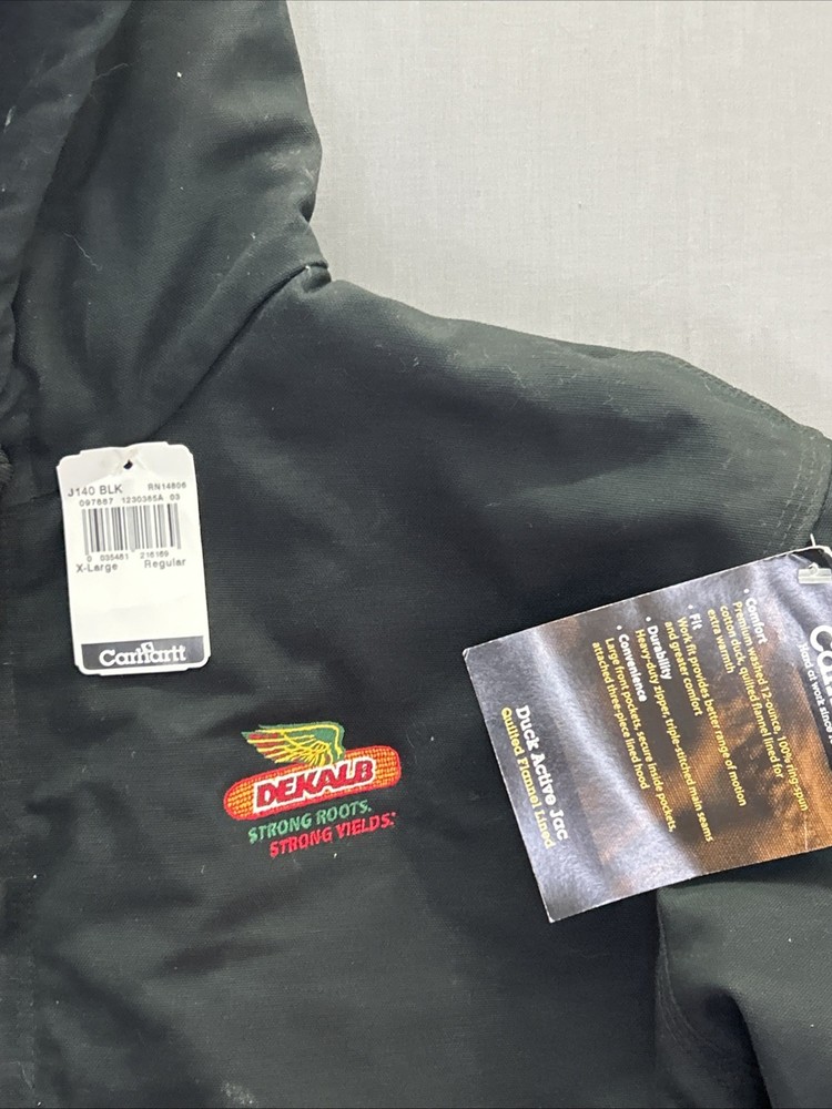 Deadstock Carhartt J140 BLK with all original tags and stickers. Dekalb Seed branded. Farm Agricultural Work Wear. A little dusty from storage but unworn. See photos for condition and measurements. Ships next day, excluding Sundays.