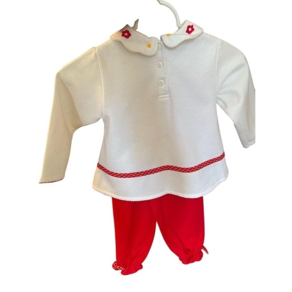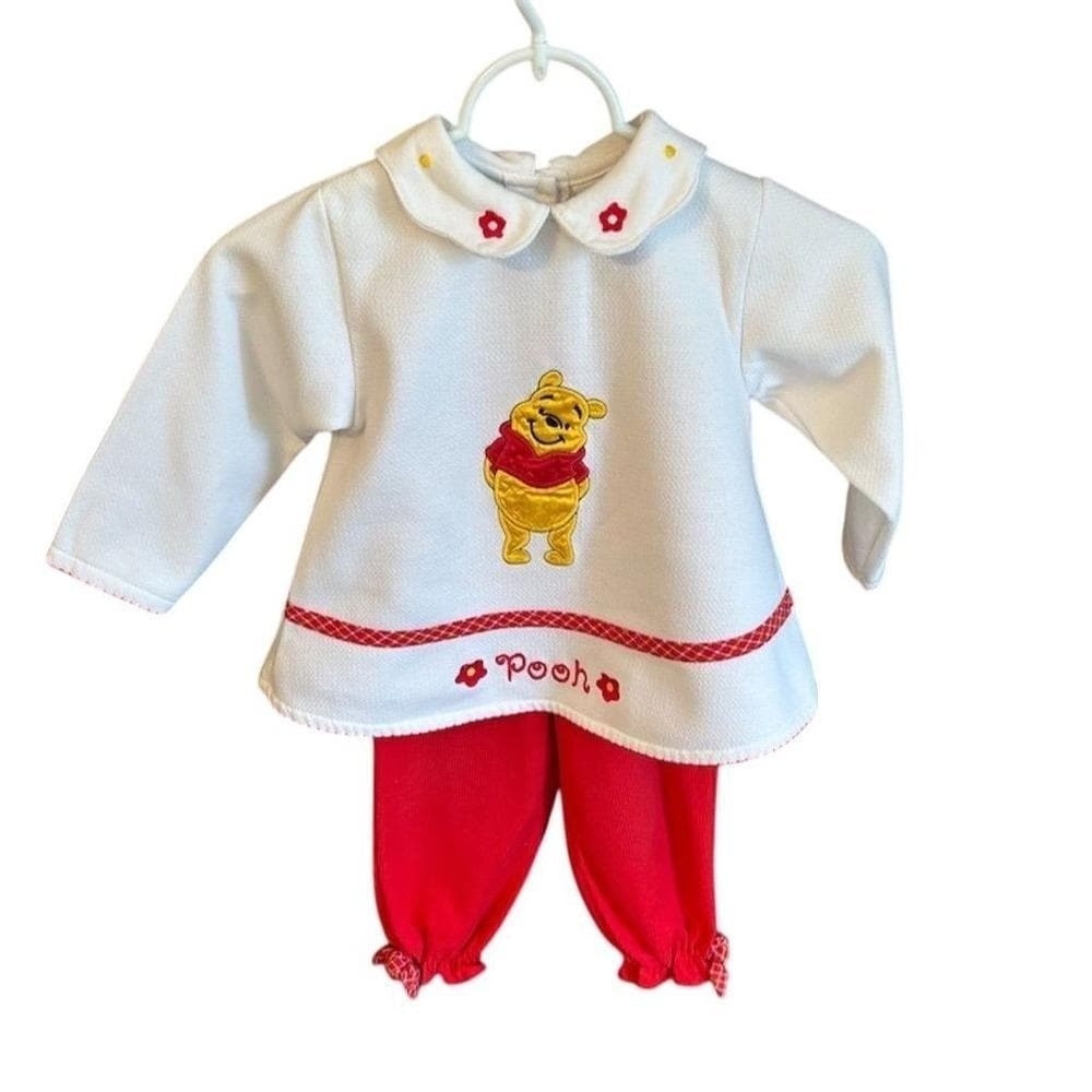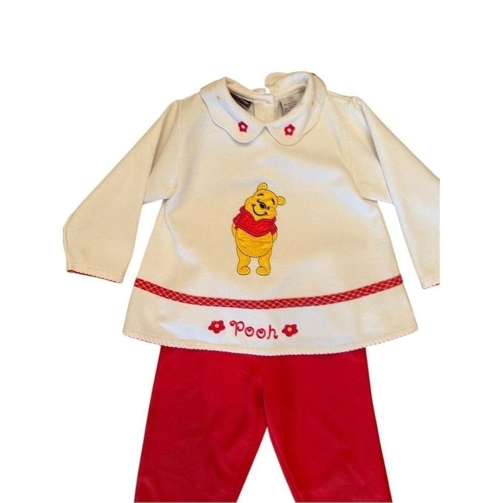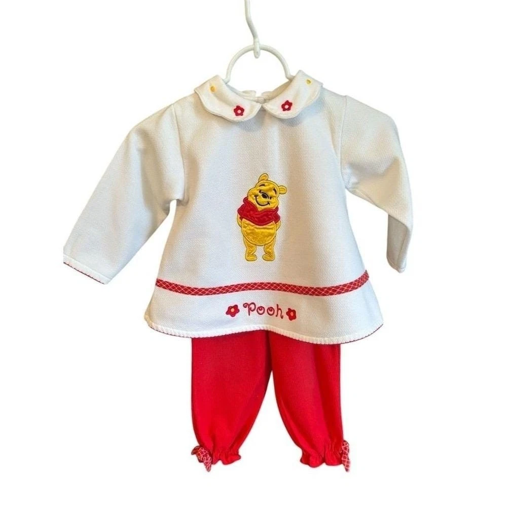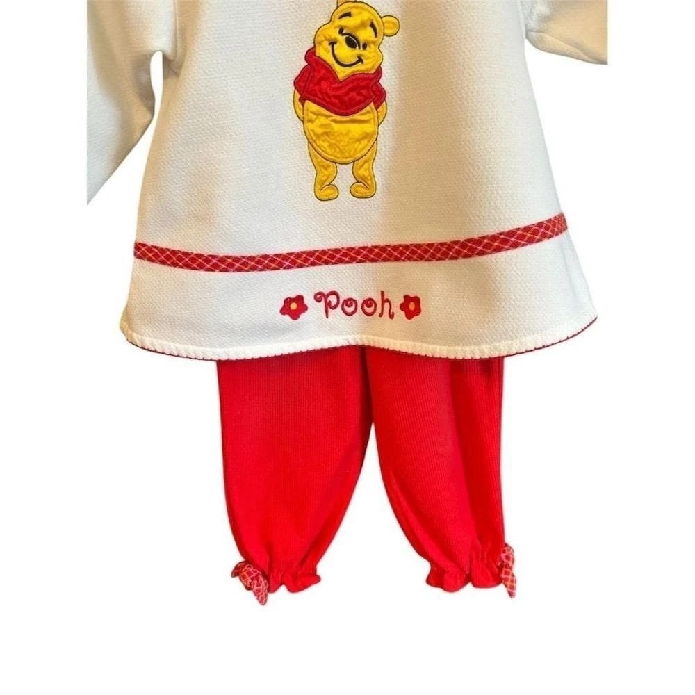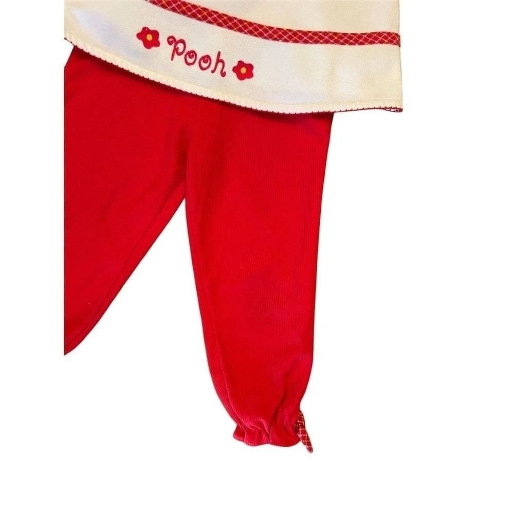 Disney Winnie the Pooh 100 Acre Collection baby and toddler outfit set. This charming ensemble features a long-sleeved white top with an embroidered Winnie the Pooh graphic and a "Pooh" detail with floral accents. The coordinating red pants have a comfortable elastic waistband and adorable ruffled cuffs. Perfect for playtime, park visits, or casual outings. Department: Unisex Baby & Toddler Character: Winnie the Pooh, Pooh Theme: Animals Style: Pants Set Set Includes: Pants, Casual Shirt Number of Pieces: 2 Piece Fabric Type: Blended Fabric Pattern: Floral Material: Polyester, Cotton Occasion: Casual Character Family: Disney Features: Cuffed Accents: Embroidered, Ruffle Keywords: Disney, Winnie the Pooh, Pooh Bear, 100 Acre Collection, baby outfit, toddler set, embroidered, character clothing, red pants, long sleeve top, playwear, casual, gift All items come from a smoke free, pet friendly home. All of items unless NWT or Dry Clean Only are washed with Tide. We try our best to disclose any flaws with items, if we miss something please reach out and let us know. We offer combined shipping on all our items. We do take measurements of our clothing listed for sale. Please compare the measurements to something you already own.