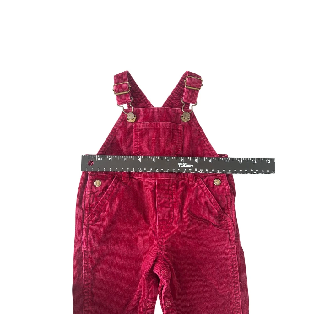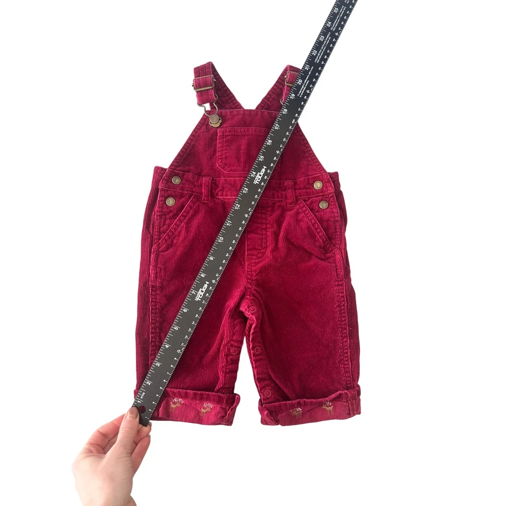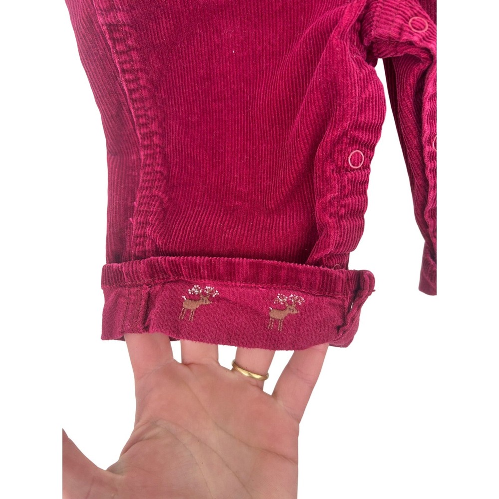 Burgundy red corduroy overalls for baby from Gymboree. These adorable overalls feature adjustable straps, a bib pocket with snap closure, and side snaps for easy dressing. The cuffs are rolled and adorned with a charming embroidered reindeer pattern, adding a festive touch. Perfect for holiday gatherings or everyday wear during the cooler months. Measurements: • Waist: 10 in • Inseam: 7 in • Length (strap to cuff): 22 in Department: Unisex Baby & Toddler Season: Fall, Winter Theme: Deer Style: Overall Set Includes: Pants Number of Pieces: 1 Piece Fabric Type: Corduroy Pattern: Solid Material: Cotton Occasion: Casual Features: Adjustable Strap, Pockets Accents: Embroidered, Button Sleeve Length: Sleeveless Type: Outfit/Set Keywords: baby overalls, corduroy pants, holiday baby, winter baby, Christmas outfit, festive baby, embroidered, snap closure, rolled cuff, baby fashion, fall baby, baby apparel All items come from a smoke free, golden retriever dog friendly home. All of items unless NWT or Dry Clean Only are washed with Tide. We try our best to disclose any flaws with items, if we miss something please reach out and let us know.